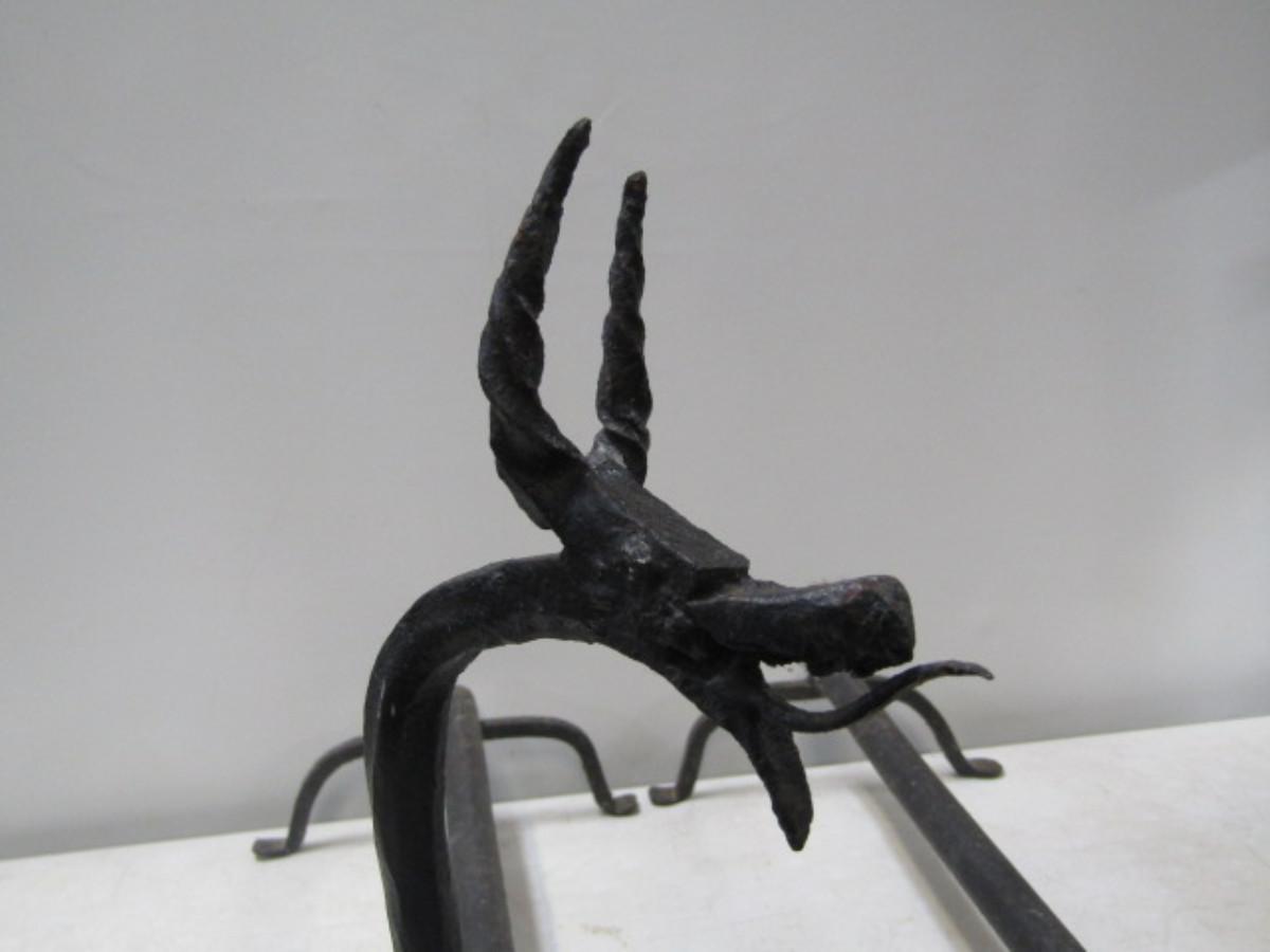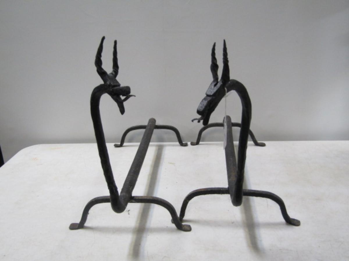 Antique Wrought Iron Andirons- Dragon Head Theme- Approx 28 1/2" Long