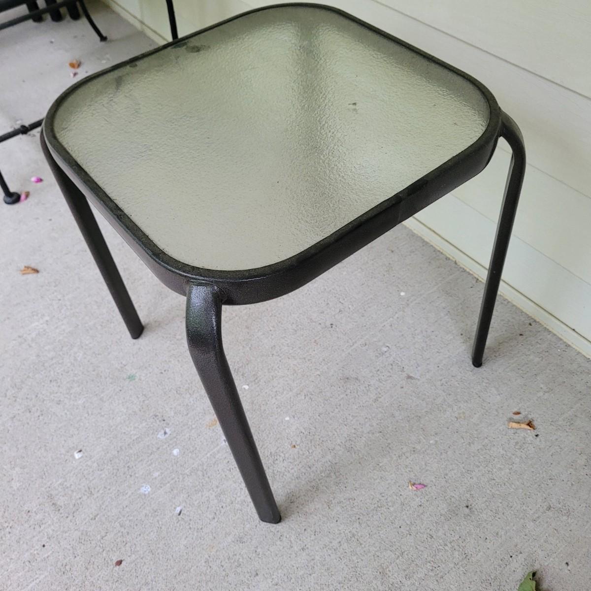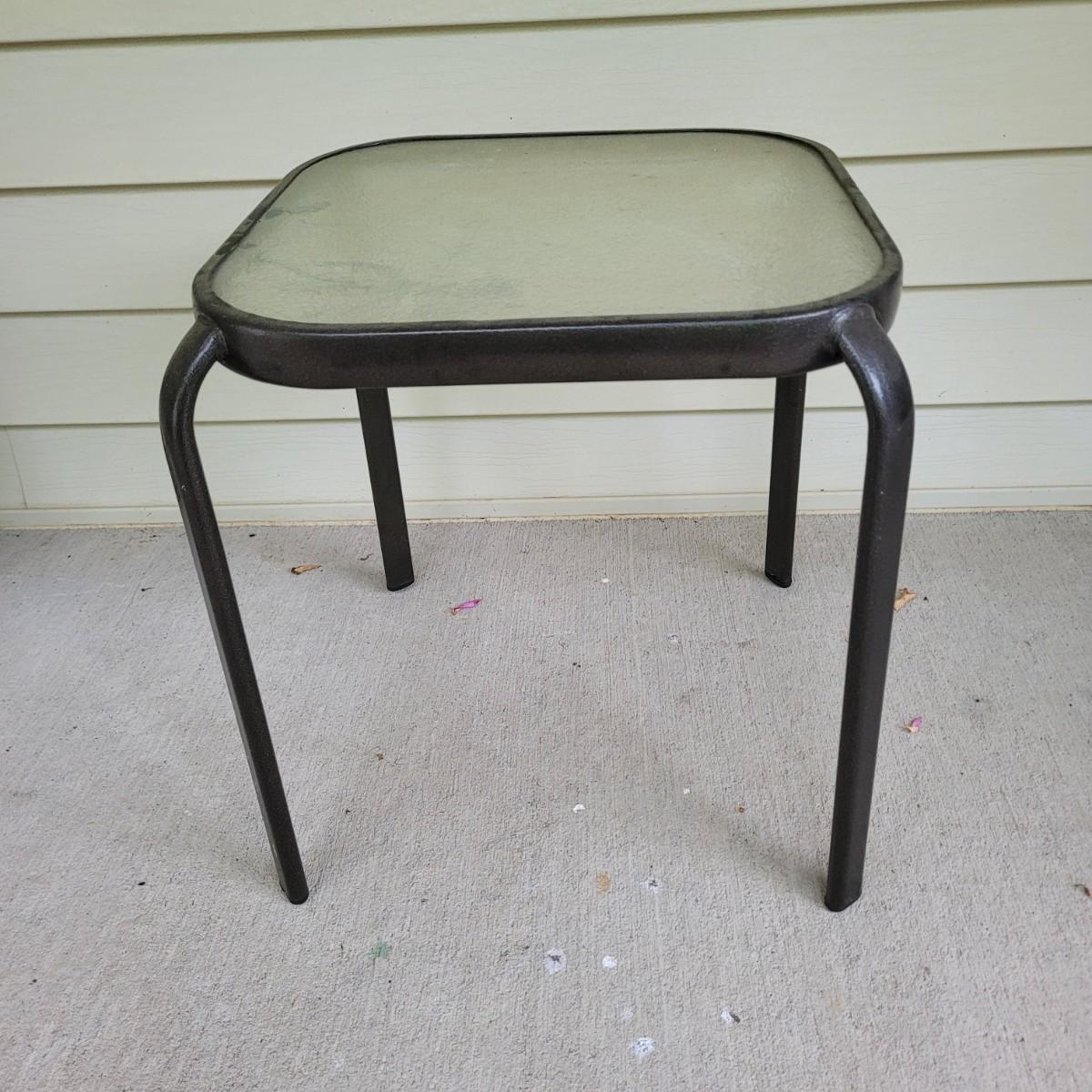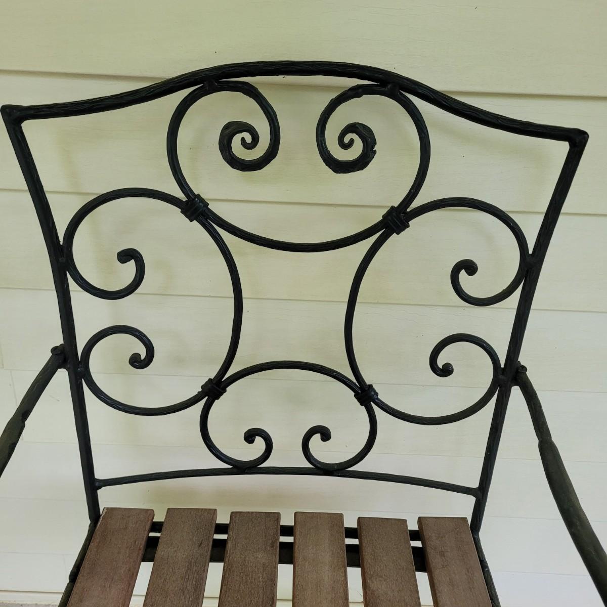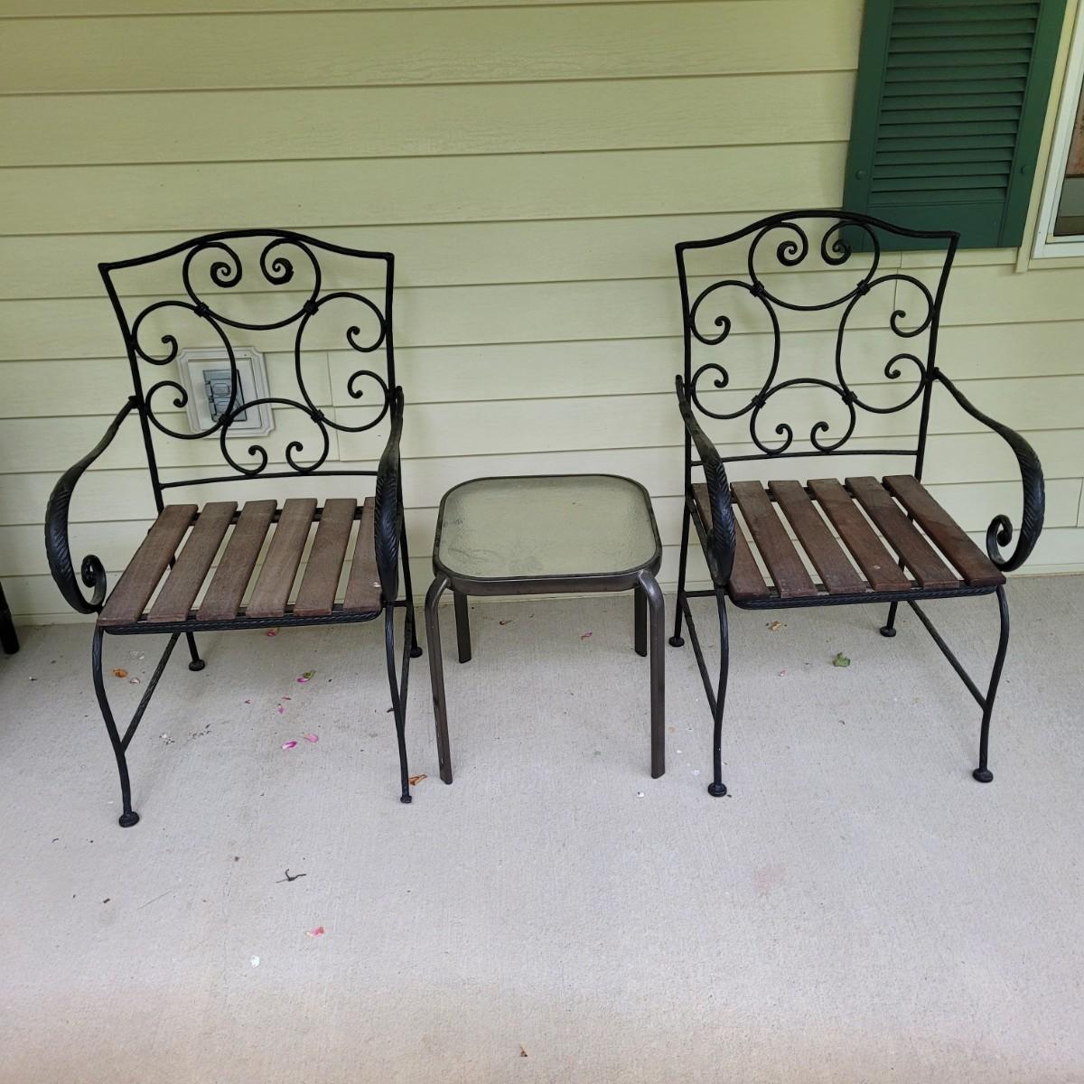 This lot includes three pieces of outdoor furniture. Included, are two wrought iron chairs with wooden seats, and a metal end table with glass top. The chairs feature swirling metalwork and paneled wooden seats. Individually, the chairs measure 23" x 19" x 36"H with a seat height of 16". One of the chairs is missing a foot pad. The table is made from metal and has a frosted glass top. The table measures 17" x 17" x 18"H.