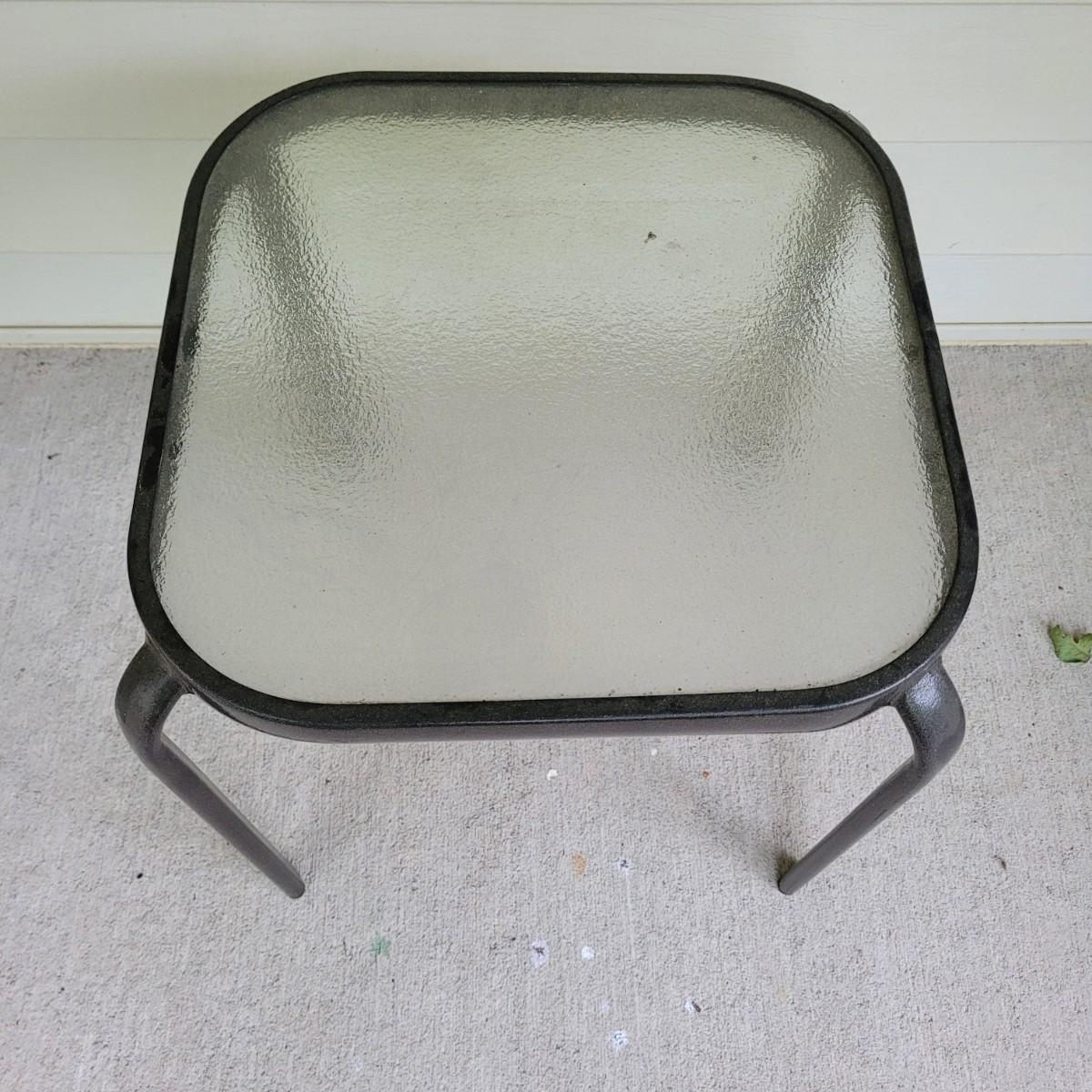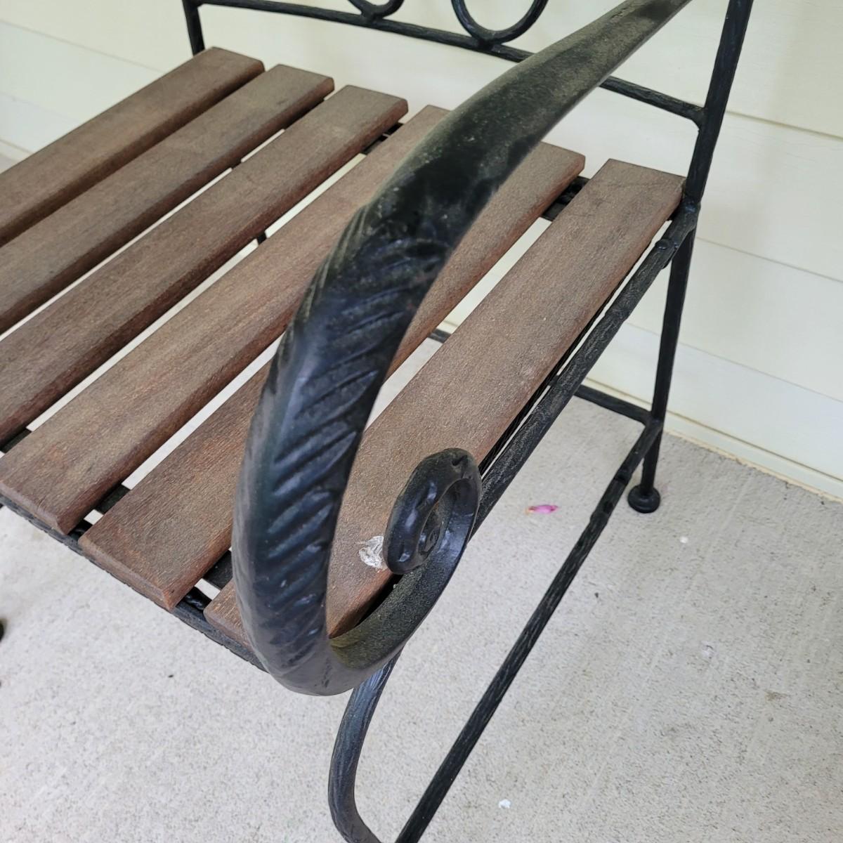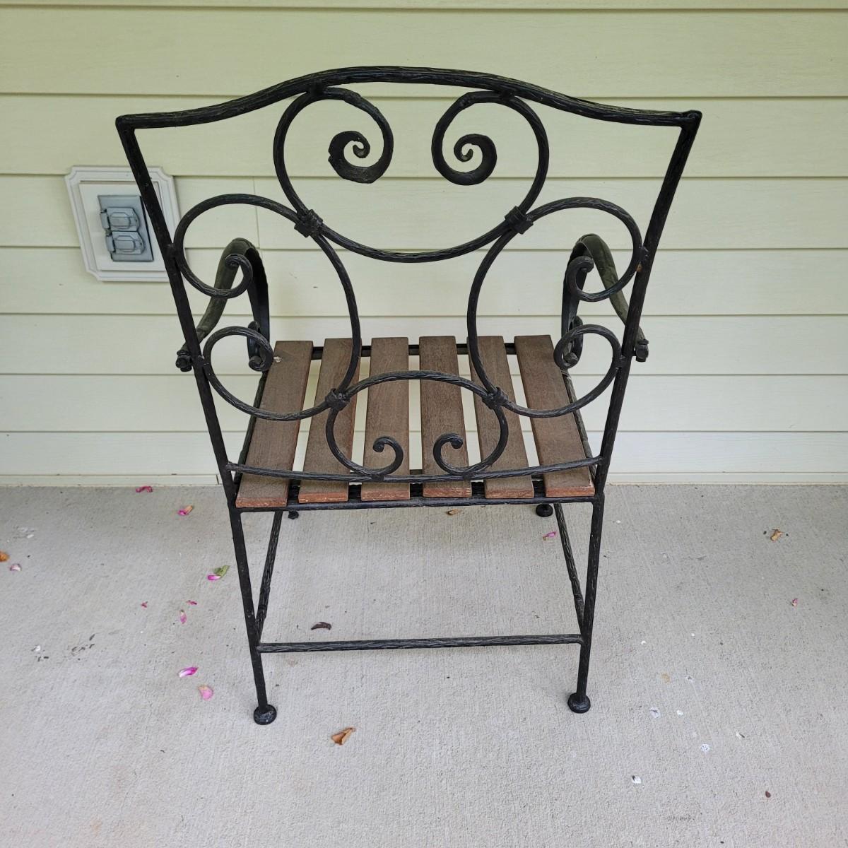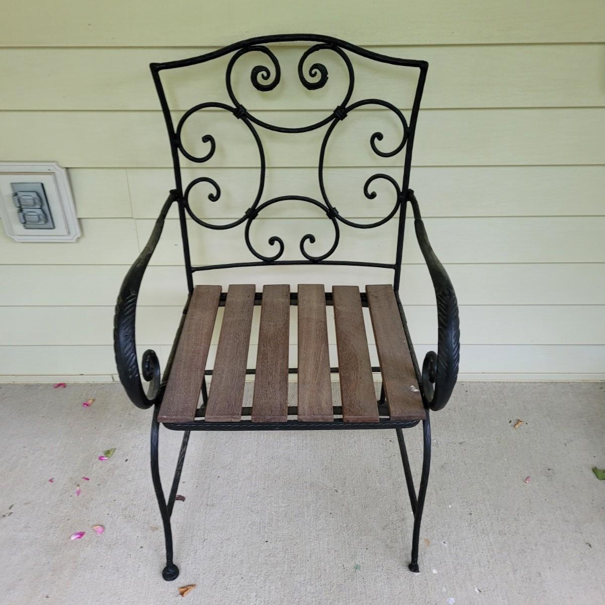 This lot includes three pieces of outdoor furniture. Included, are two wrought iron chairs with wooden seats, and a metal end table with glass top. The chairs feature swirling metalwork and paneled wooden seats. Individually, the chairs measure 23" x 19" x 36"H with a seat height of 16". One of the chairs is missing a foot pad. The table is made from metal and has a frosted glass top. The table measures 17" x 17" x 18"H.