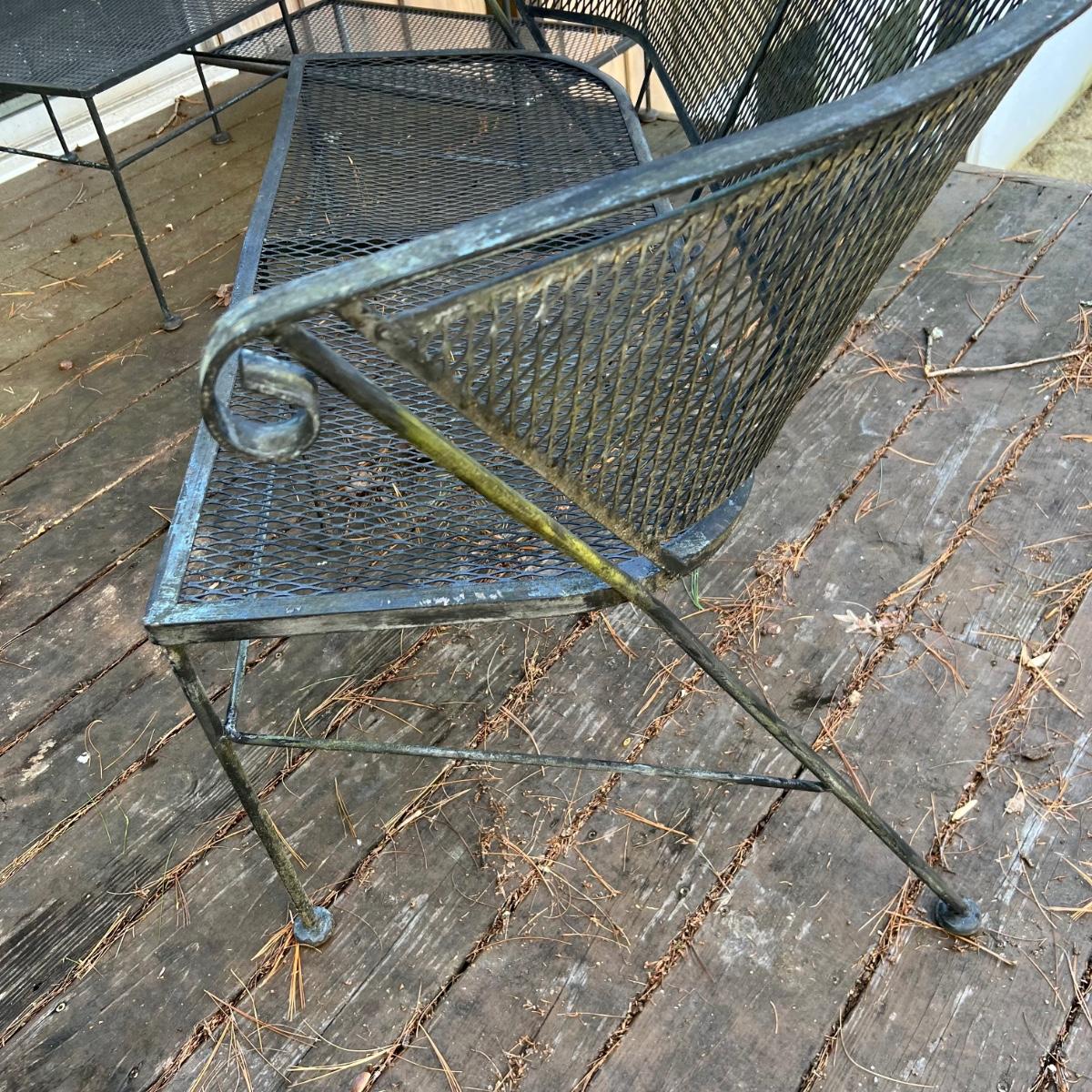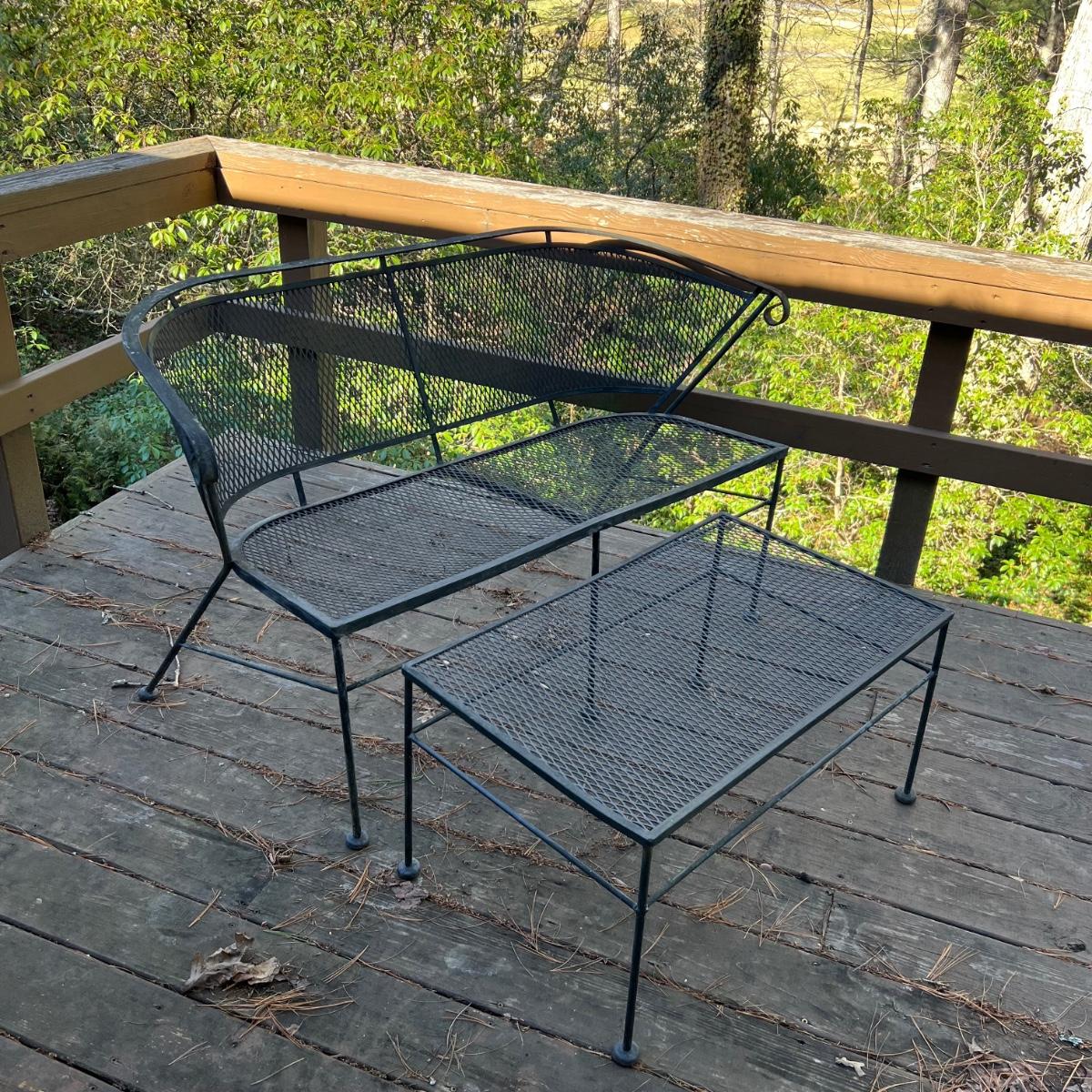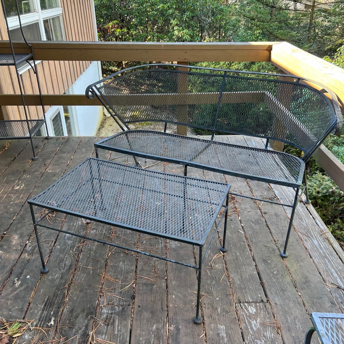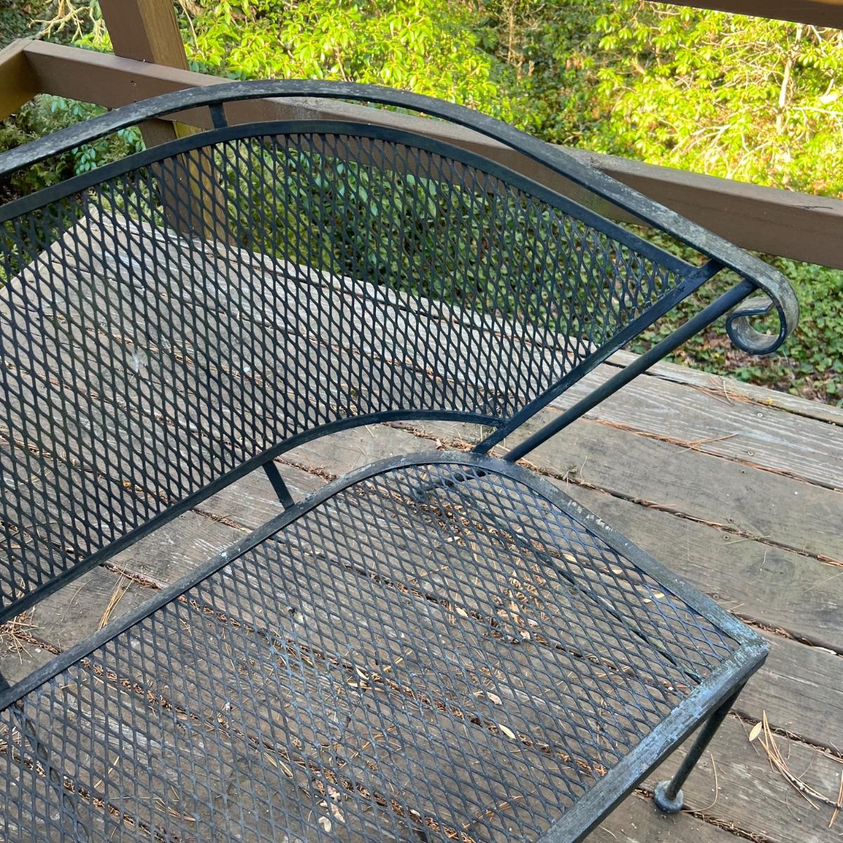 This barrel-backed love seat is wrought iron and measures 52” x 25” x 29”H with 16” seat height. A matching coffee table is included. Other lots in this auction have matching and/or similar pieces.