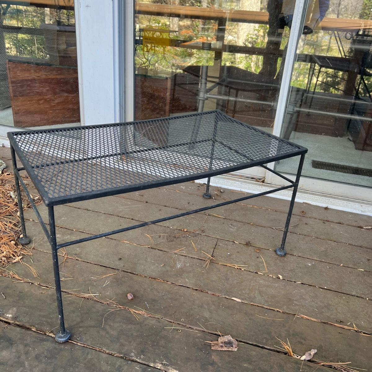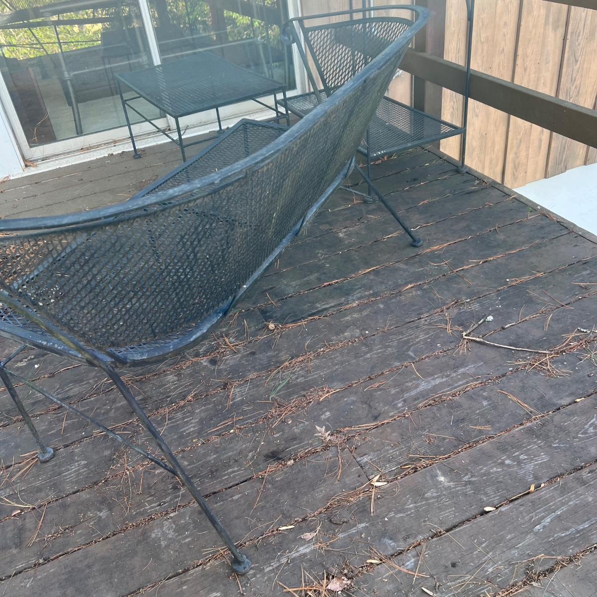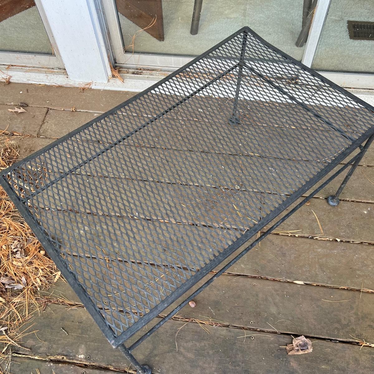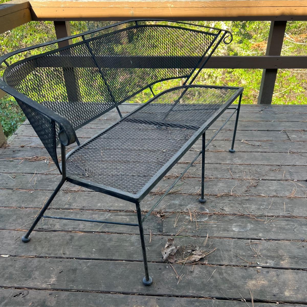 This barrel-backed love seat is wrought iron and measures 52” x 25” x 29”H with 16” seat height. A matching coffee table is included. Other lots in this auction have matching and/or similar pieces.
