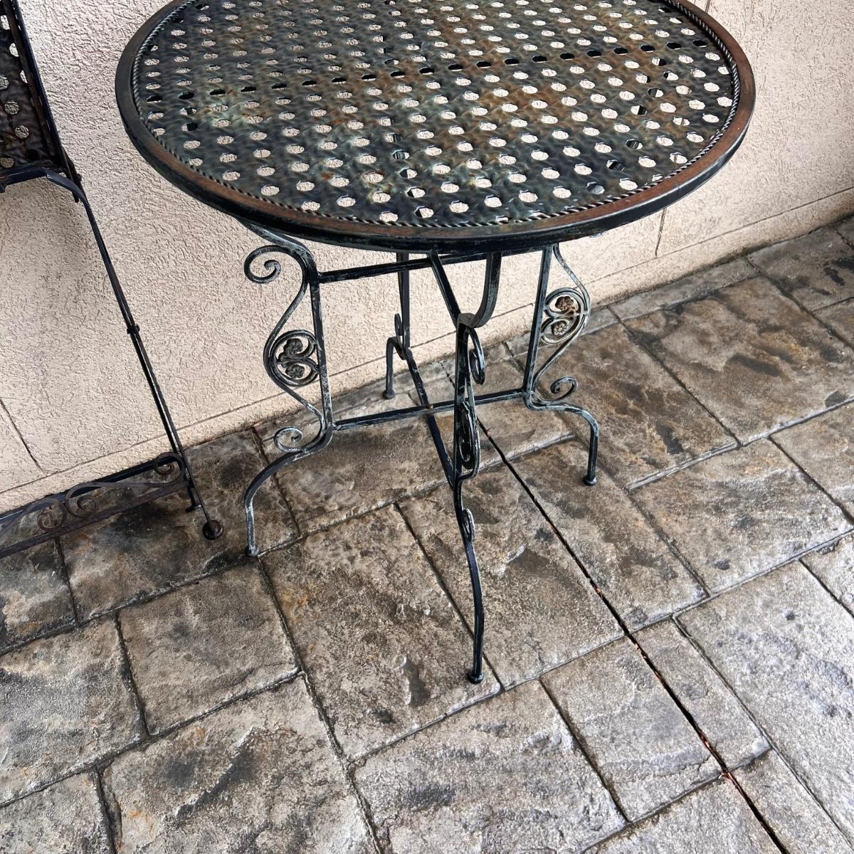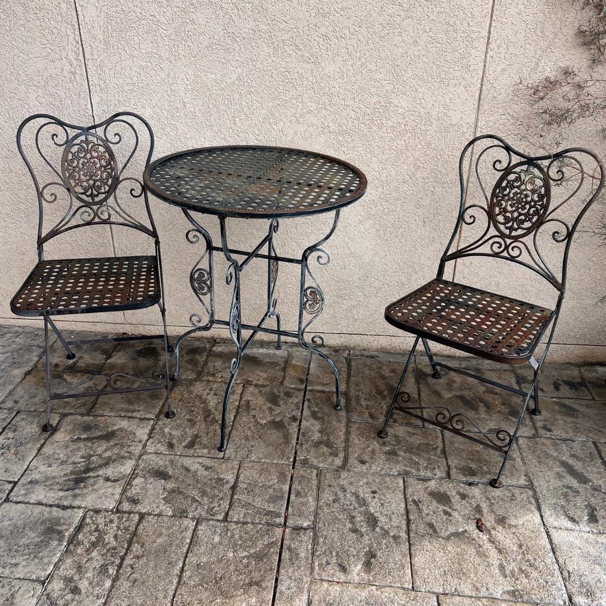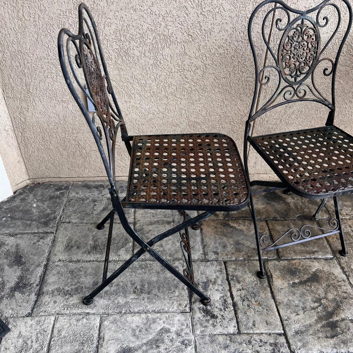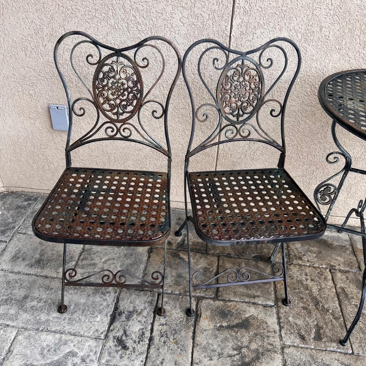 This durable wrought iron set has two chairs that fold and measure 16” x 17” x 34”H with 19” seat height. The table has some rust spots, see pics, it measures 25”D x 31”H.