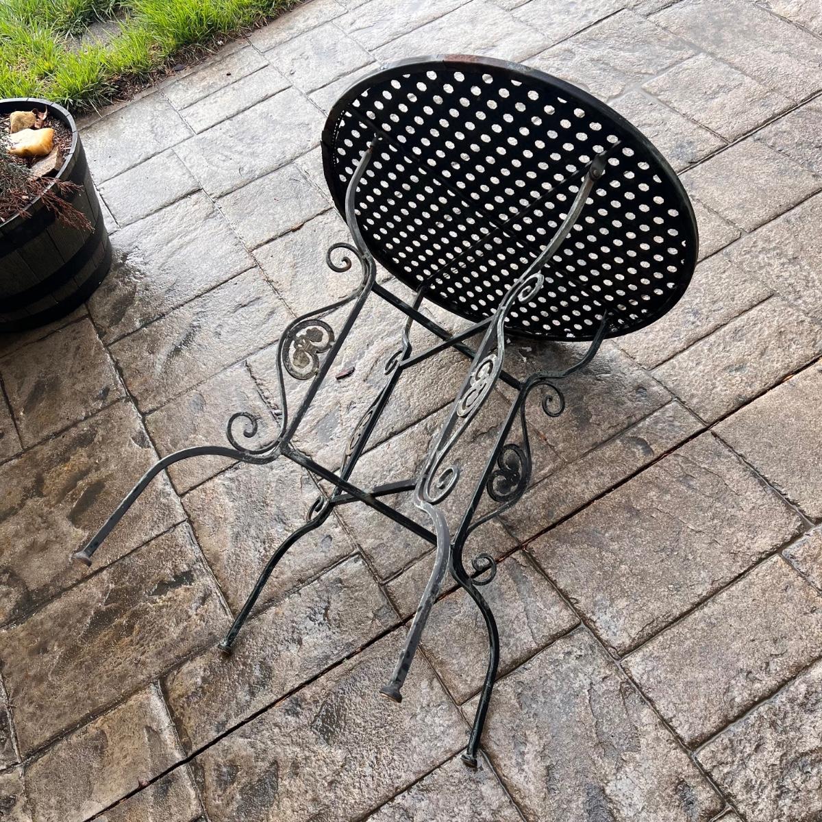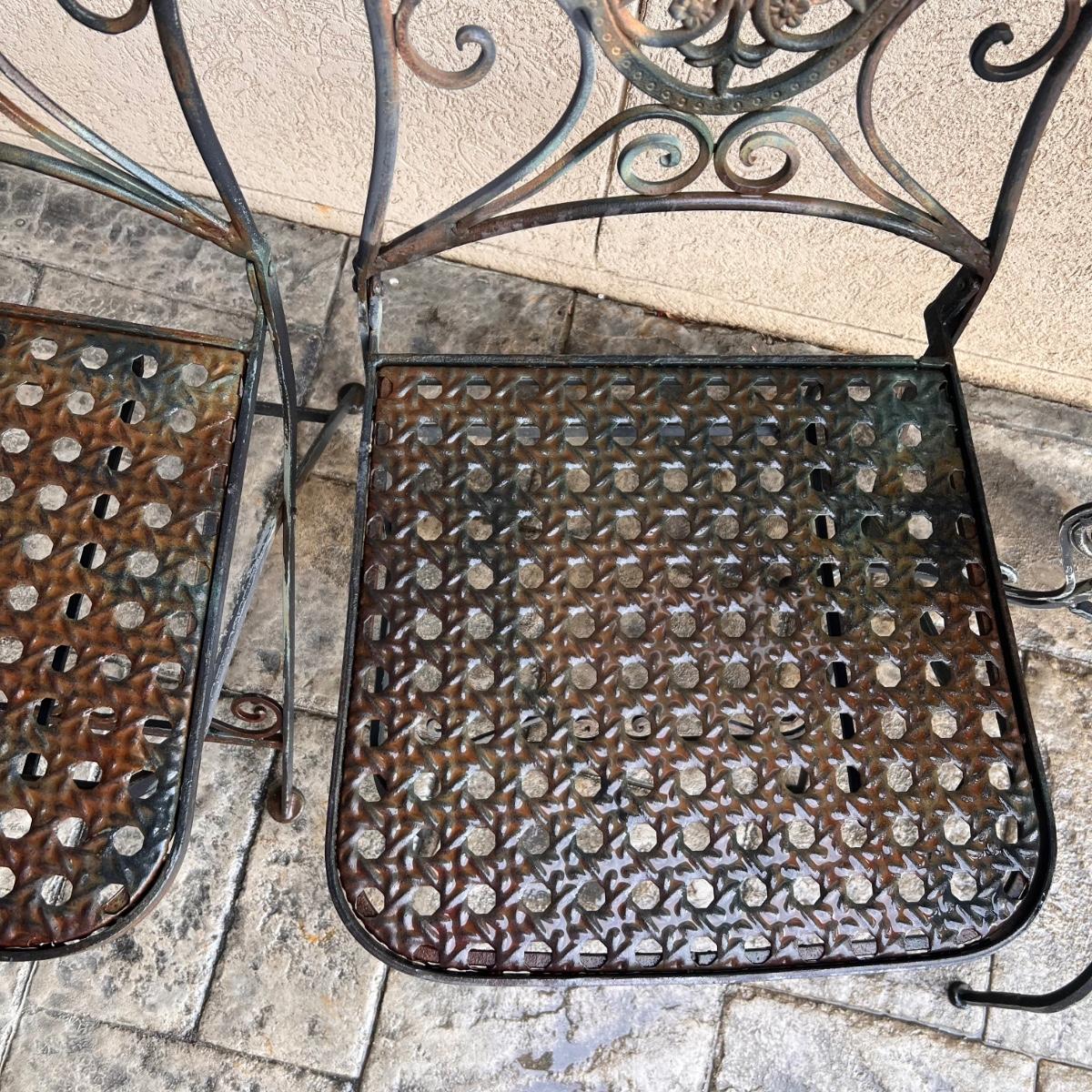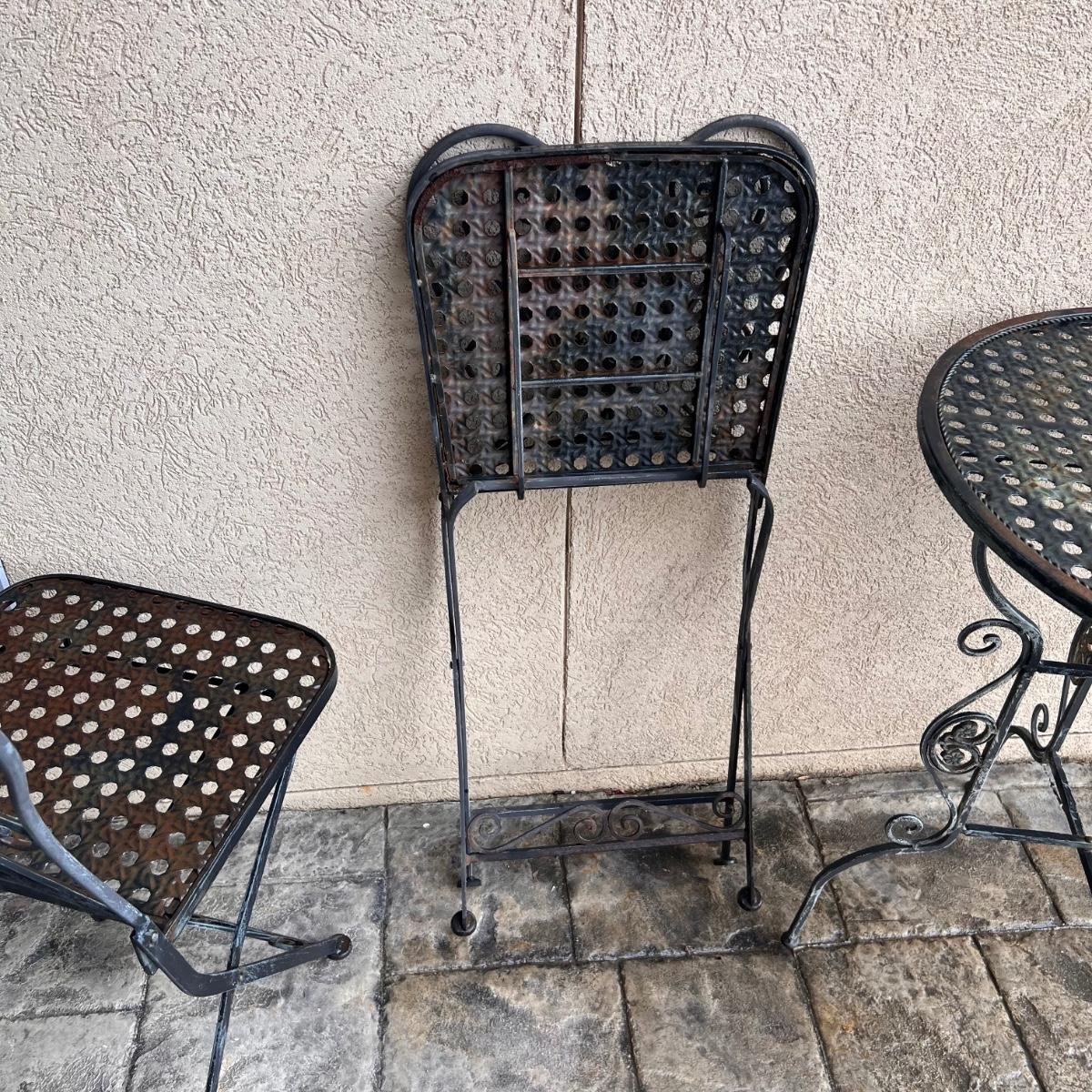 This durable wrought iron set has two chairs that fold and measure 16” x 17” x 34”H with 19” seat height. The table has some rust spots, see pics, it measures 25”D x 31”H.