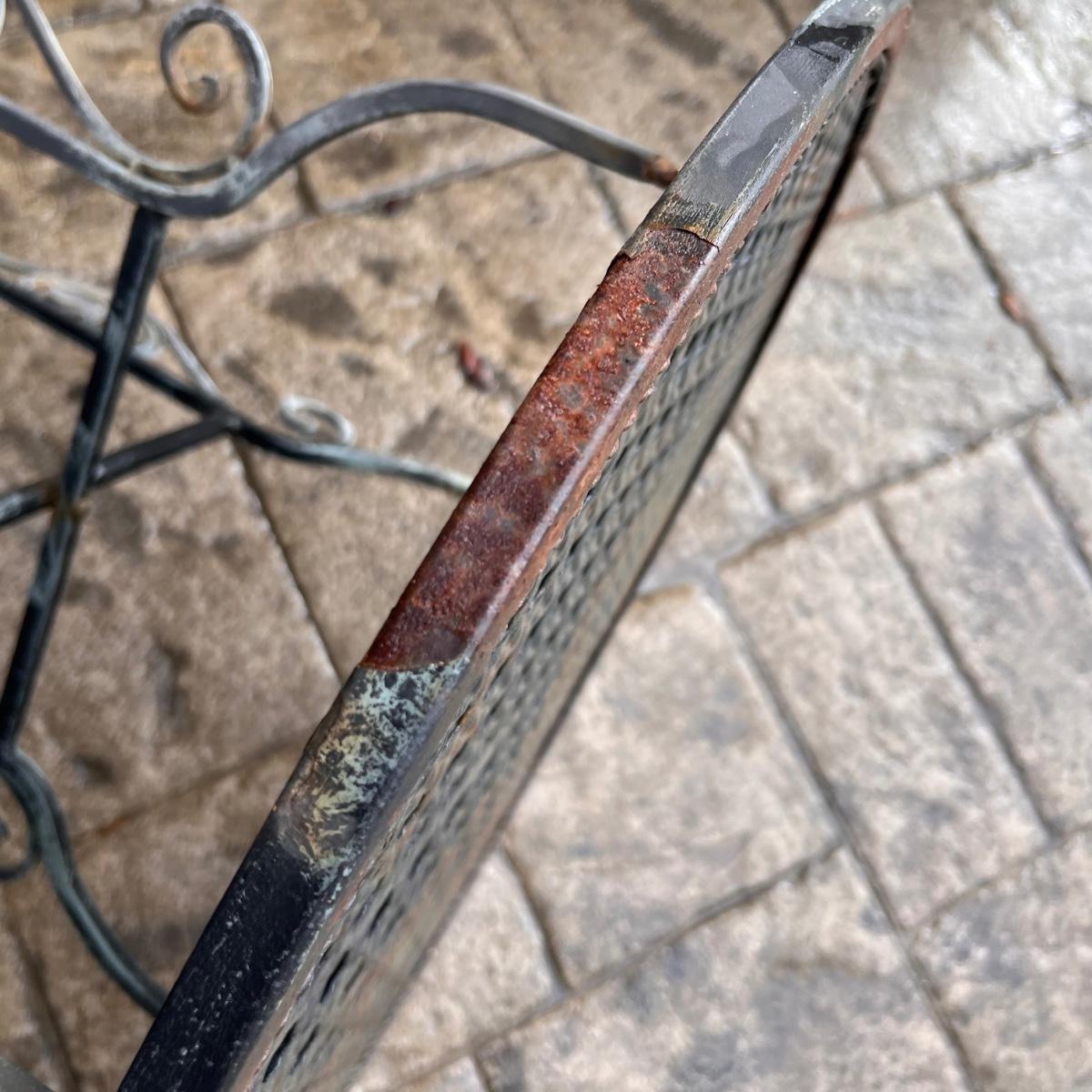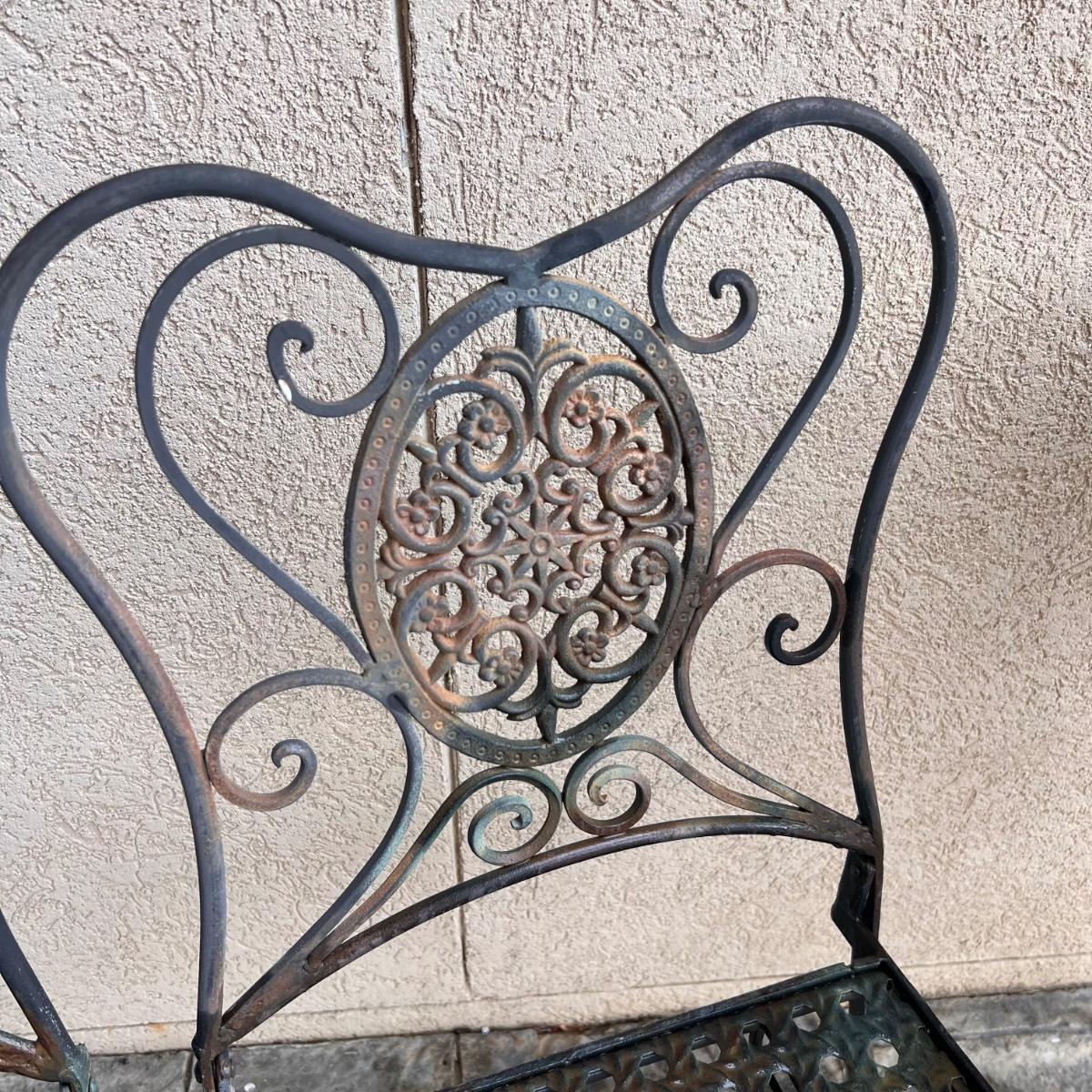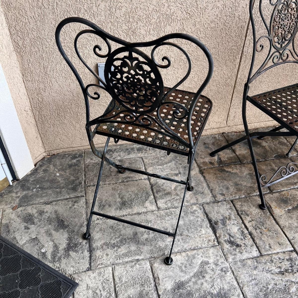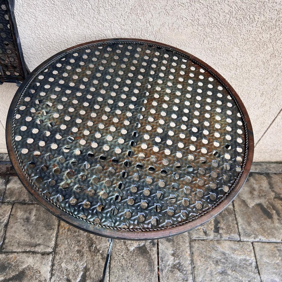 This durable wrought iron set has two chairs that fold and measure 16” x 17” x 34”H with 19” seat height. The table has some rust spots, see pics, it measures 25”D x 31”H.