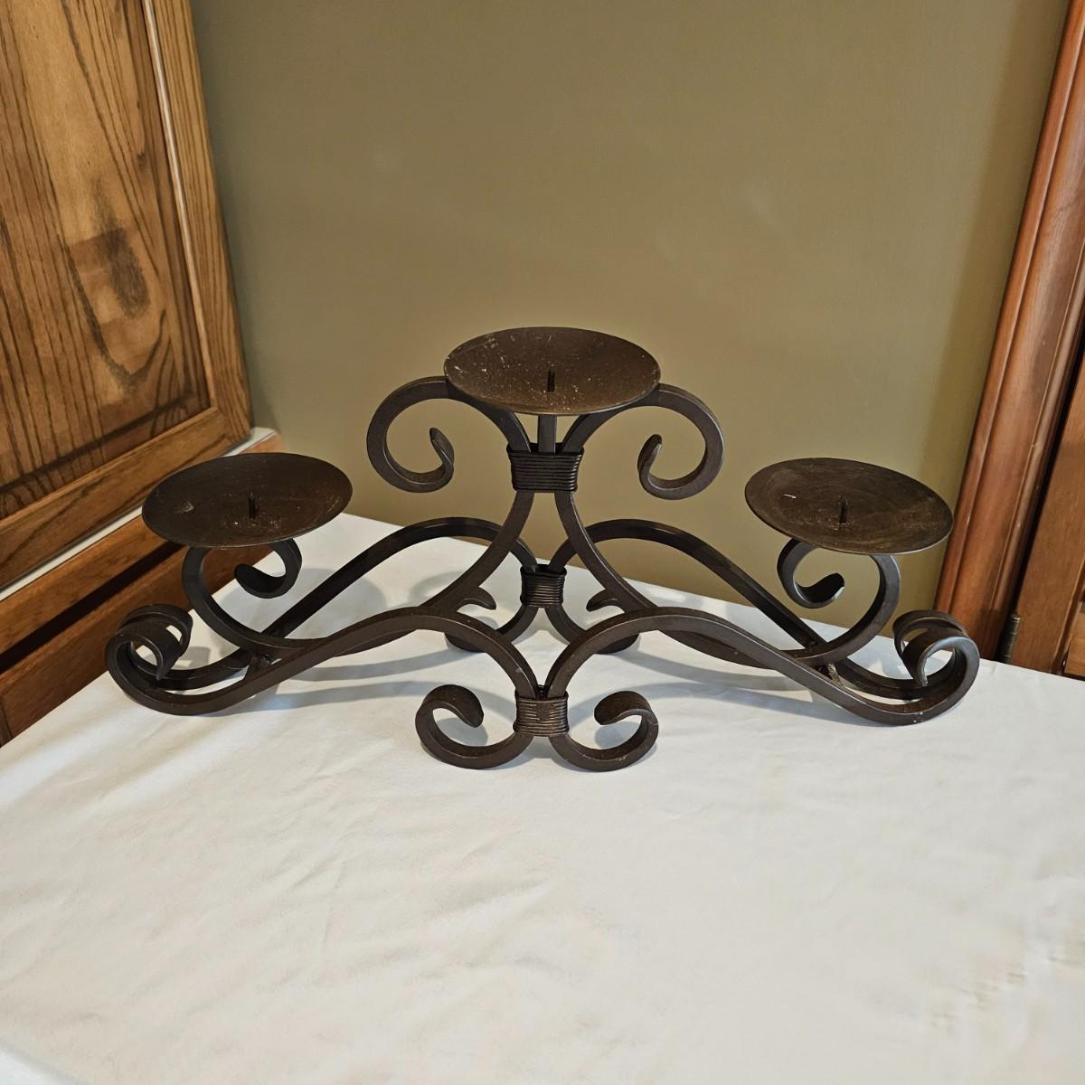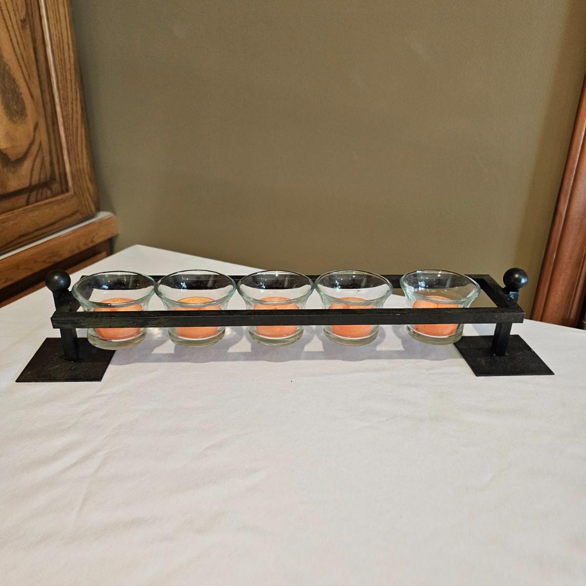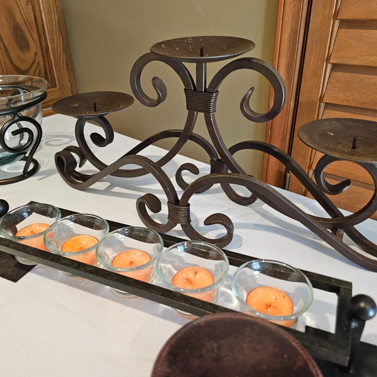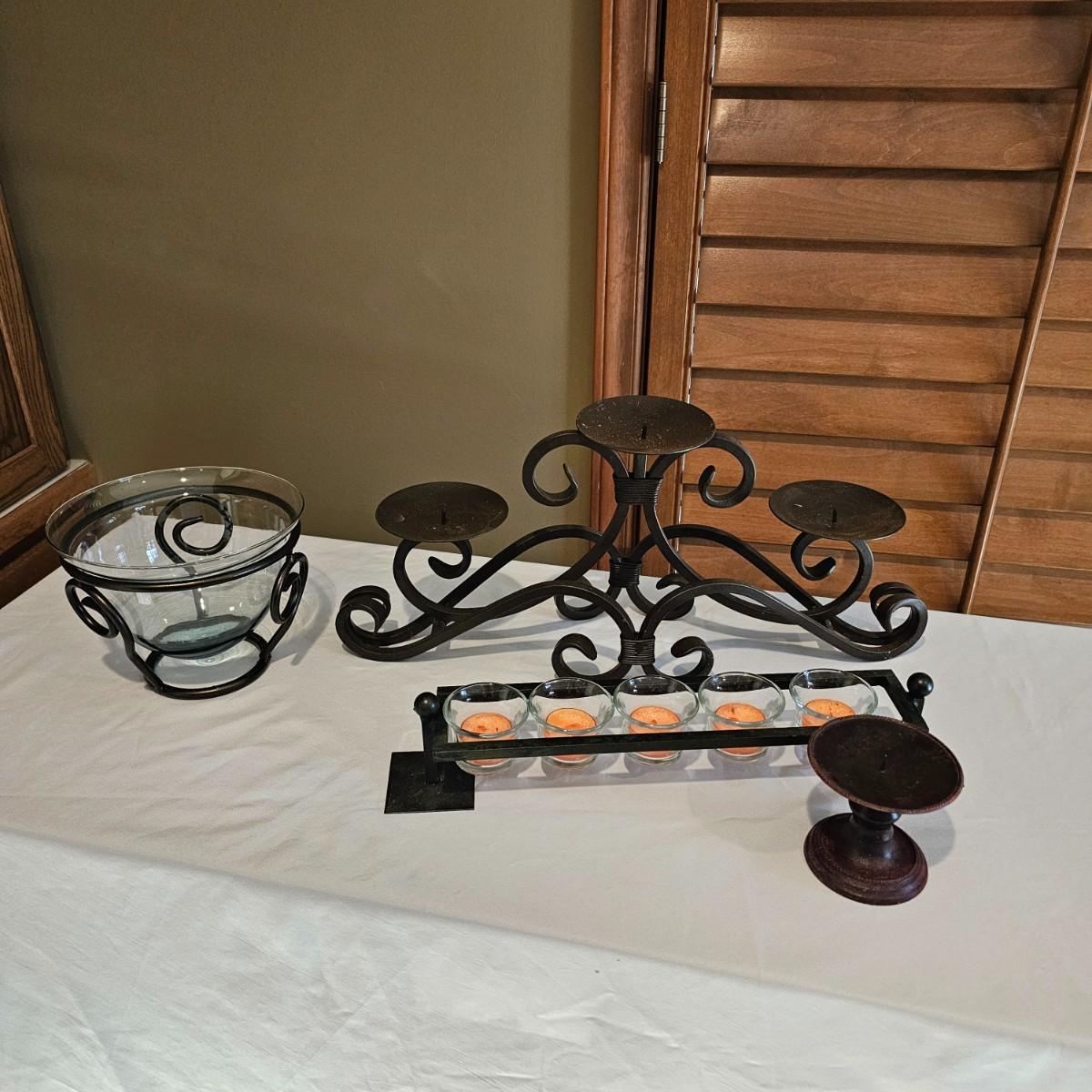 Four charming receptacles to hold candles and other decor. Stepped trio stand is wrought iron, will hold a 4"D pillar candle and measures 21" x 6" x 9"H. Long flat rack holds five votive style candles in glass bowls, measures 17.5" x 2.5" x 3"H. Round glass bowl is held in wrought iron cradle, measures 8" x 6"H. Single pedestal piece is solid brass and is 4"D x 3.5"H. See photos for details. Shipping available.