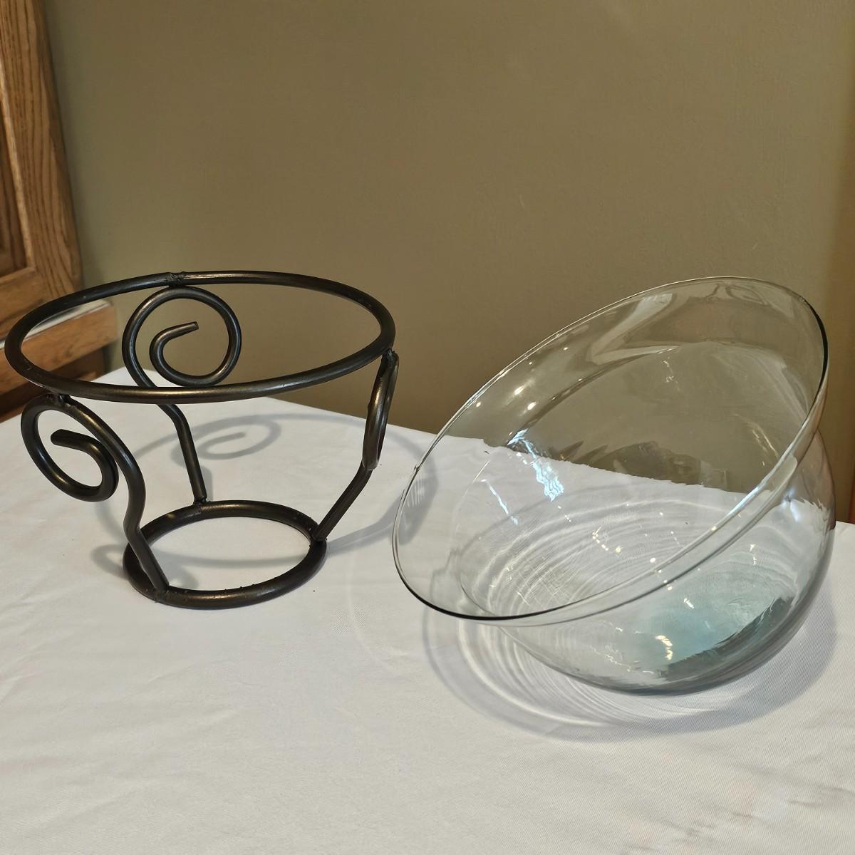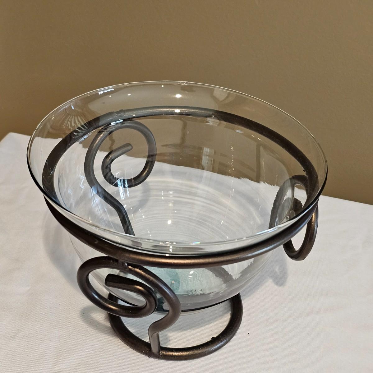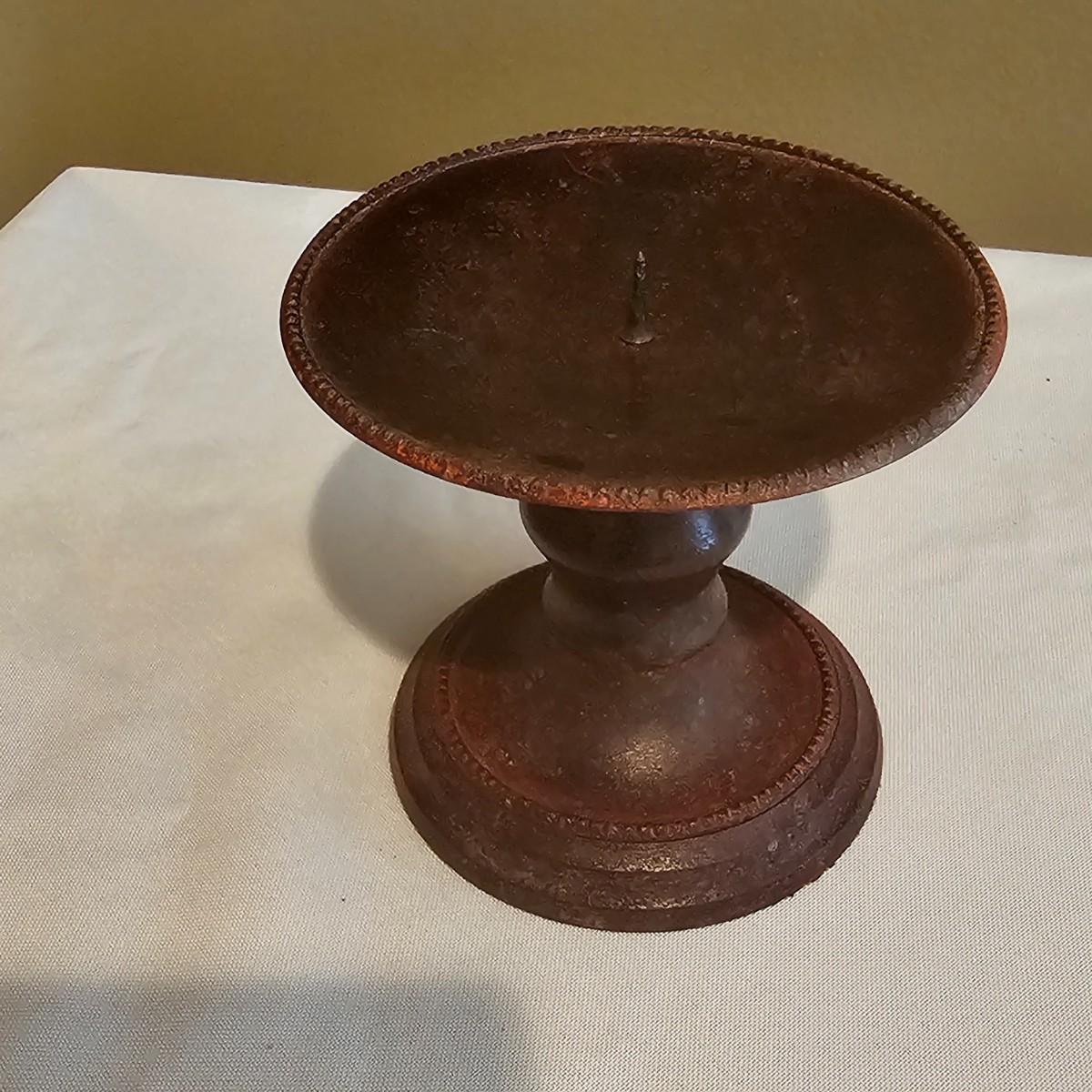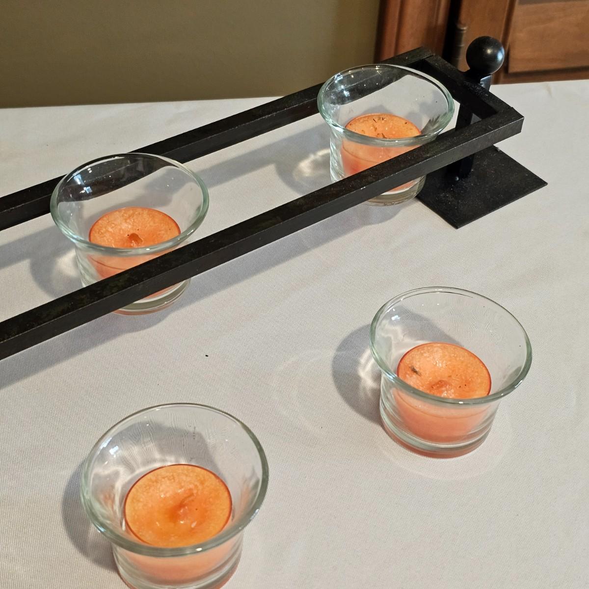 Four charming receptacles to hold candles and other decor. Stepped trio stand is wrought iron, will hold a 4"D pillar candle and measures 21" x 6" x 9"H. Long flat rack holds five votive style candles in glass bowls, measures 17.5" x 2.5" x 3"H. Round glass bowl is held in wrought iron cradle, measures 8" x 6"H. Single pedestal piece is solid brass and is 4"D x 3.5"H. See photos for details. Shipping available.