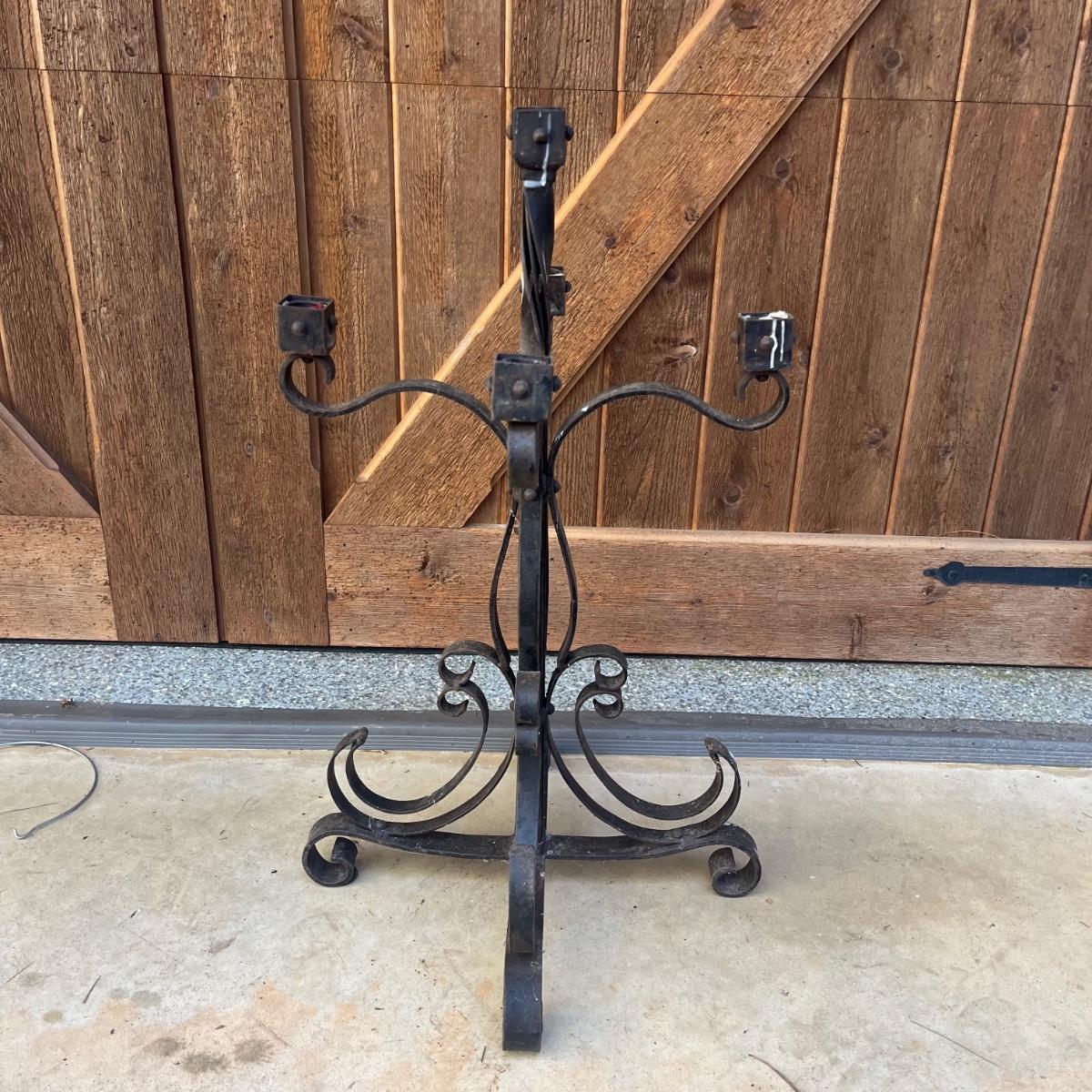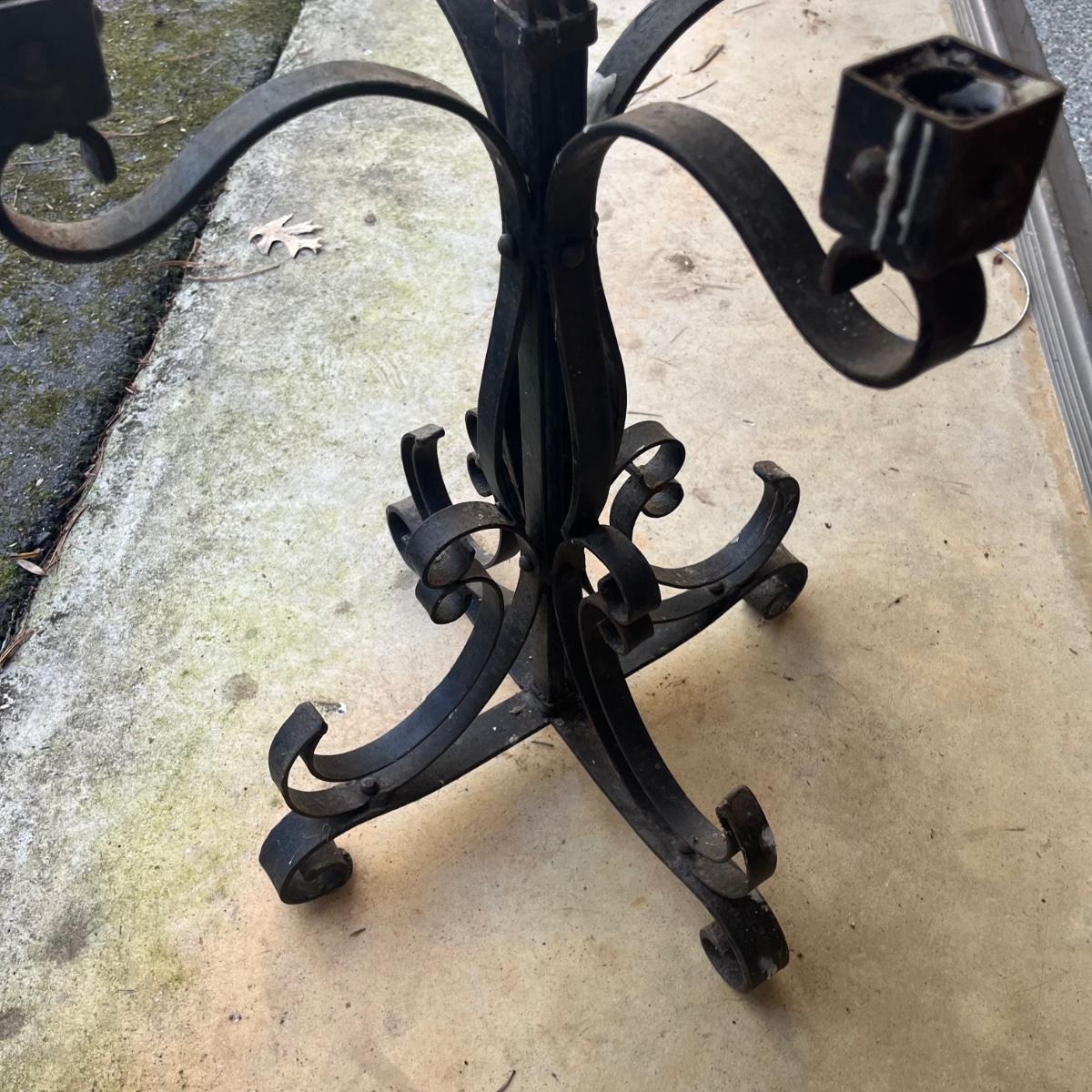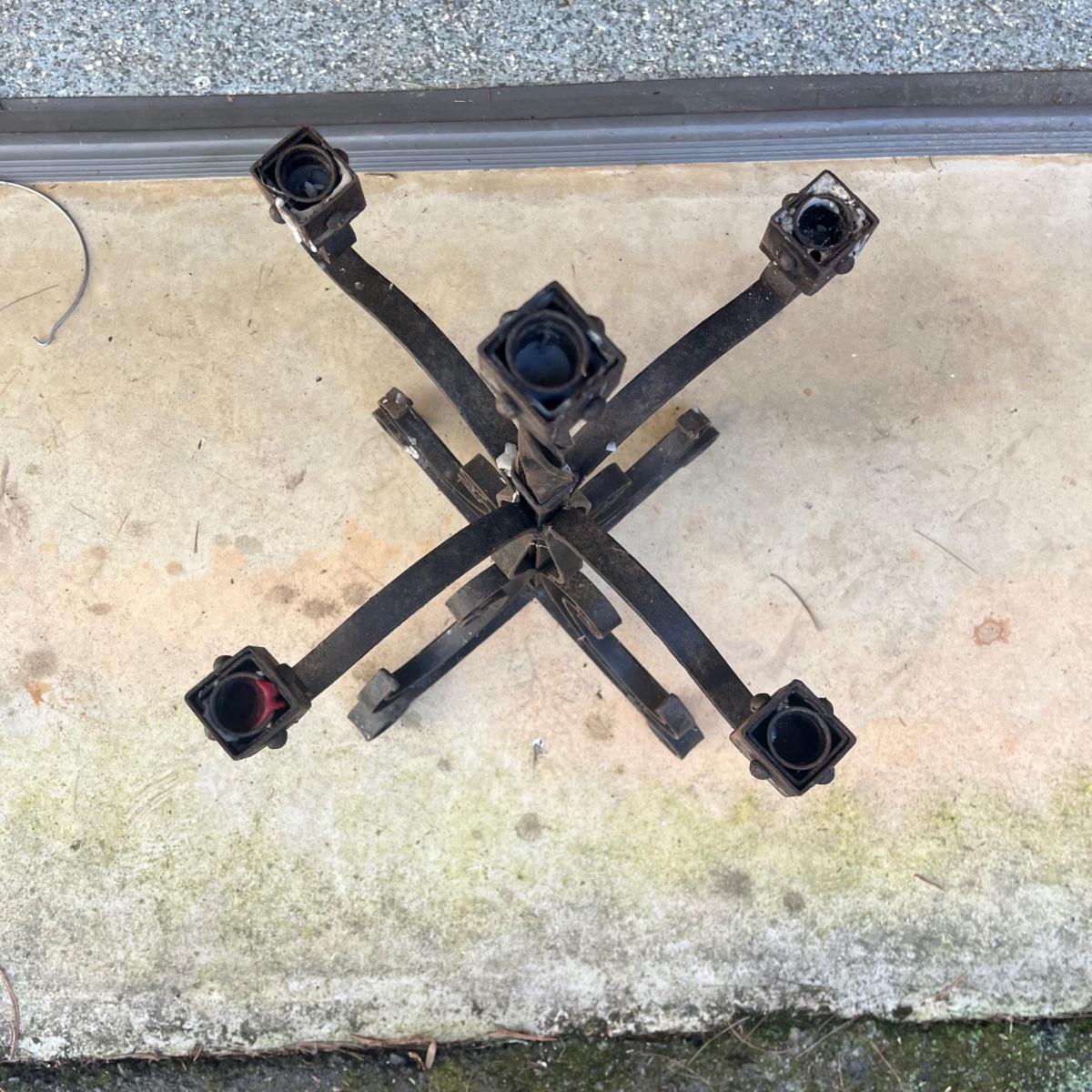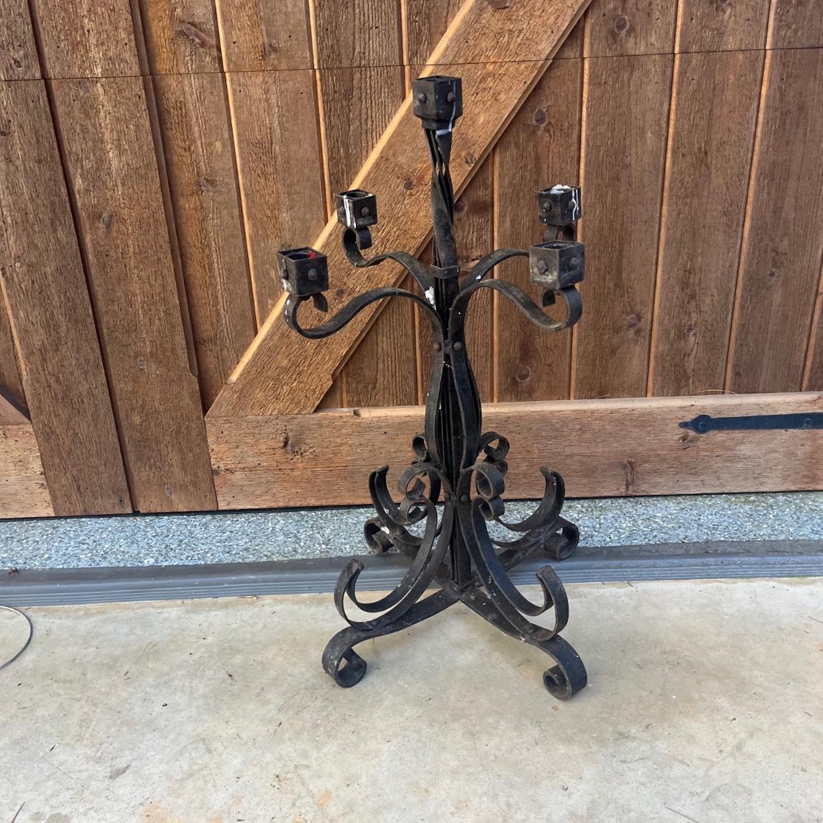Lot includes a large wrought iron candle holder with room for five candles. Piece measures 17” x 17” x 28”.