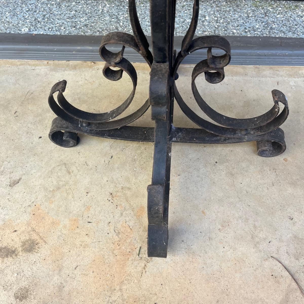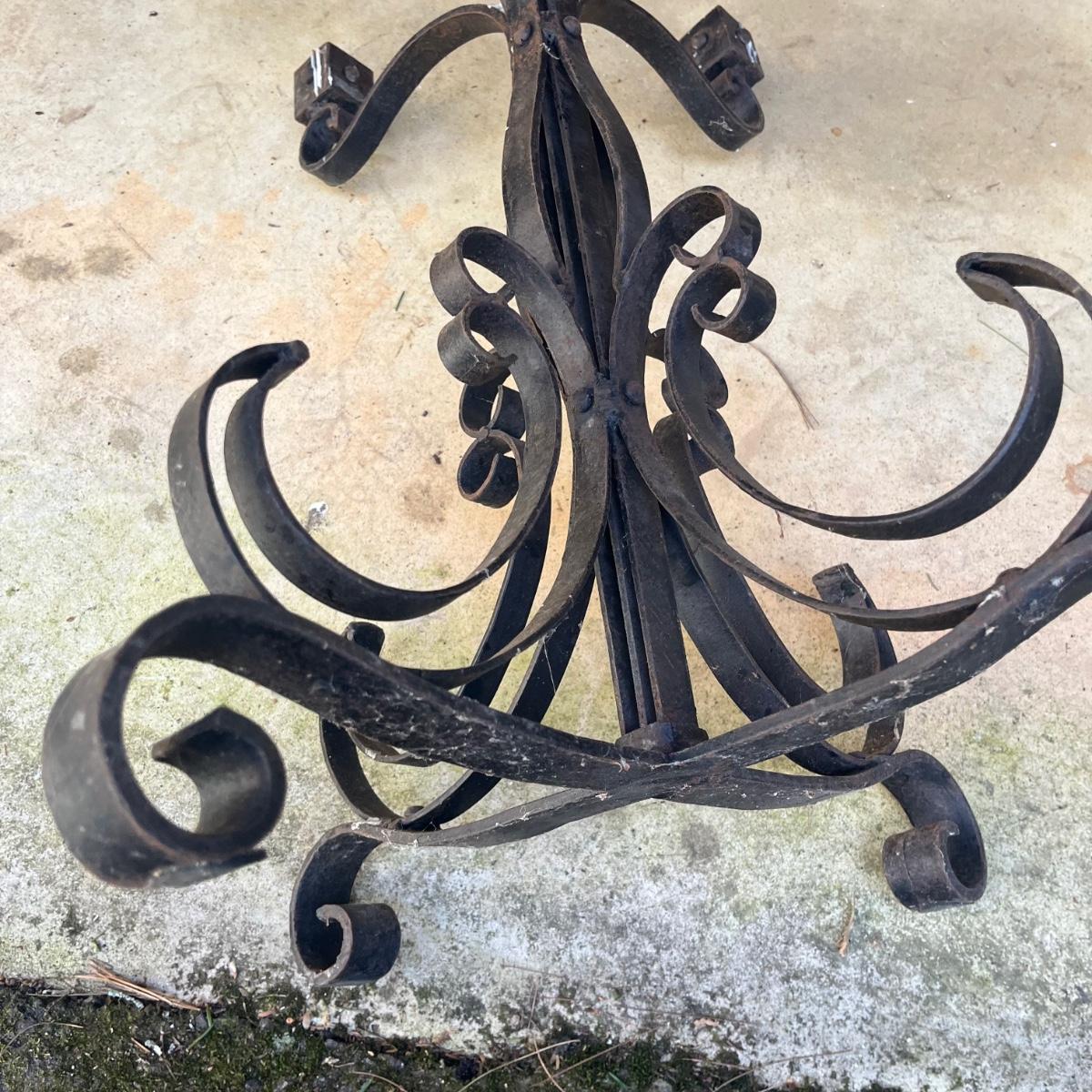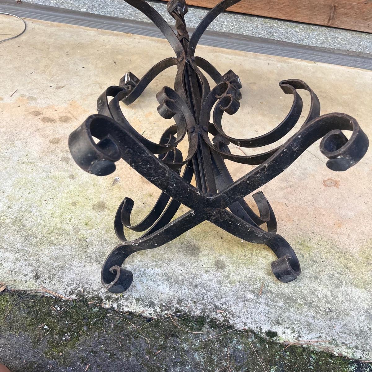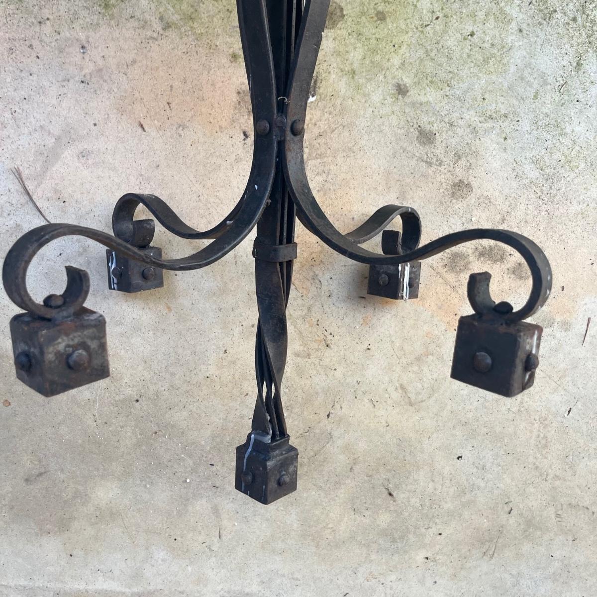 Lot includes a large wrought iron candle holder with room for five candles. Piece measures 17” x 17” x 28”.