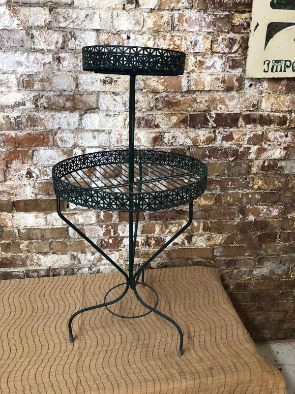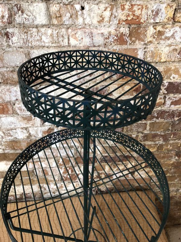 Good condition on this 38" high two-tier circular plant stand...Painted green..shelves are 18" and 11" in diameter...