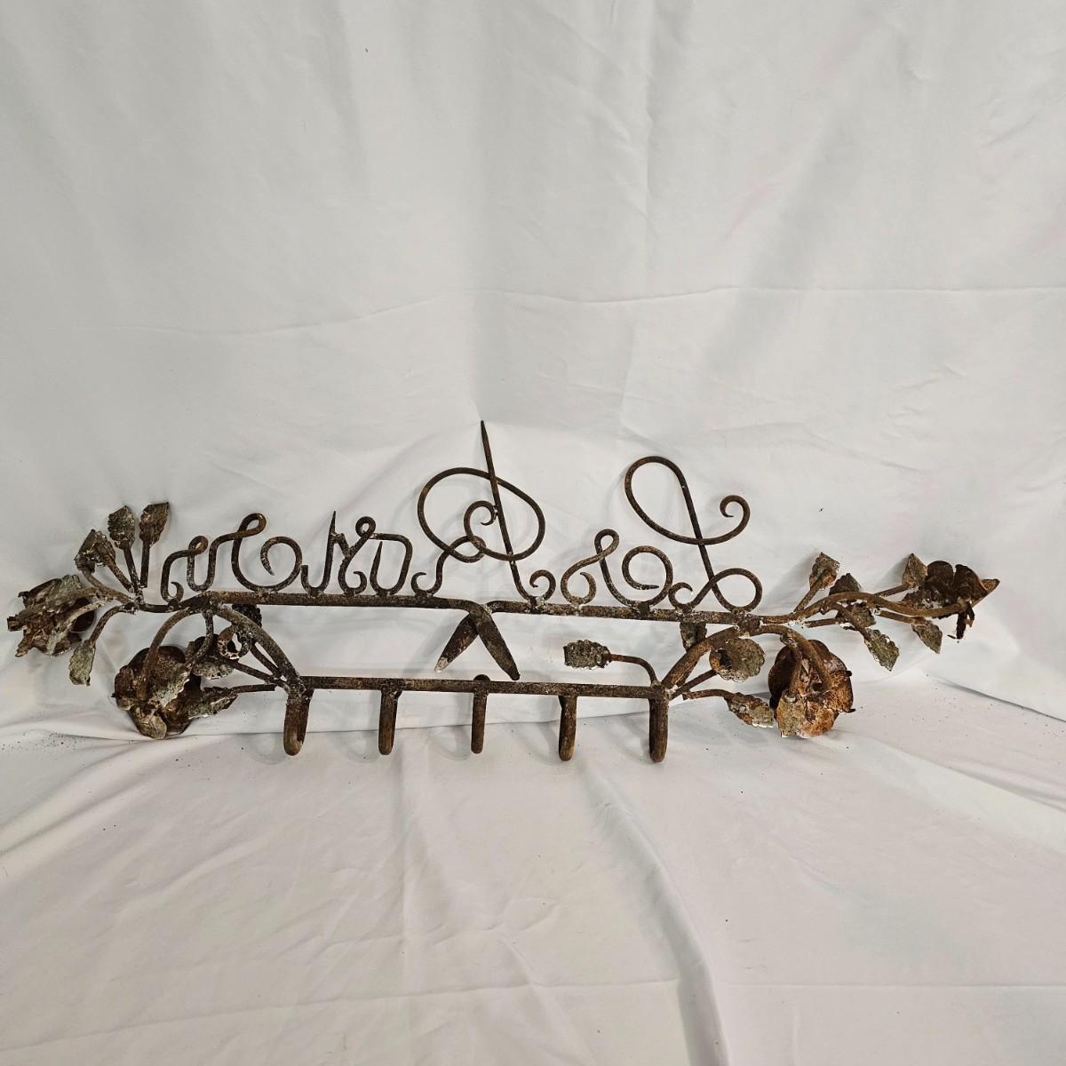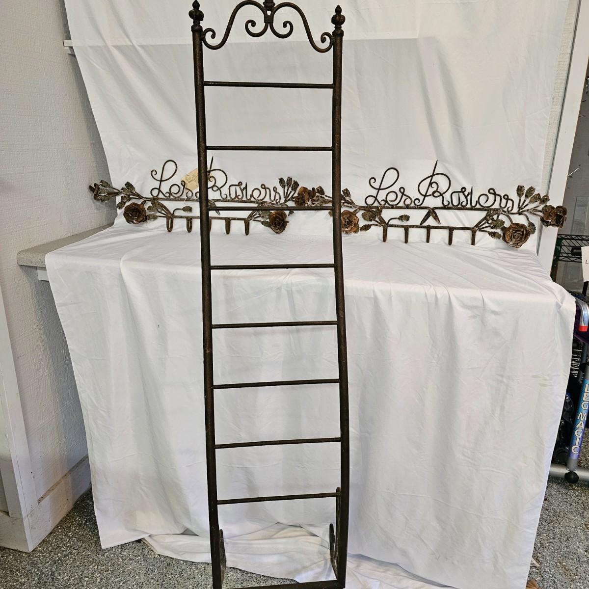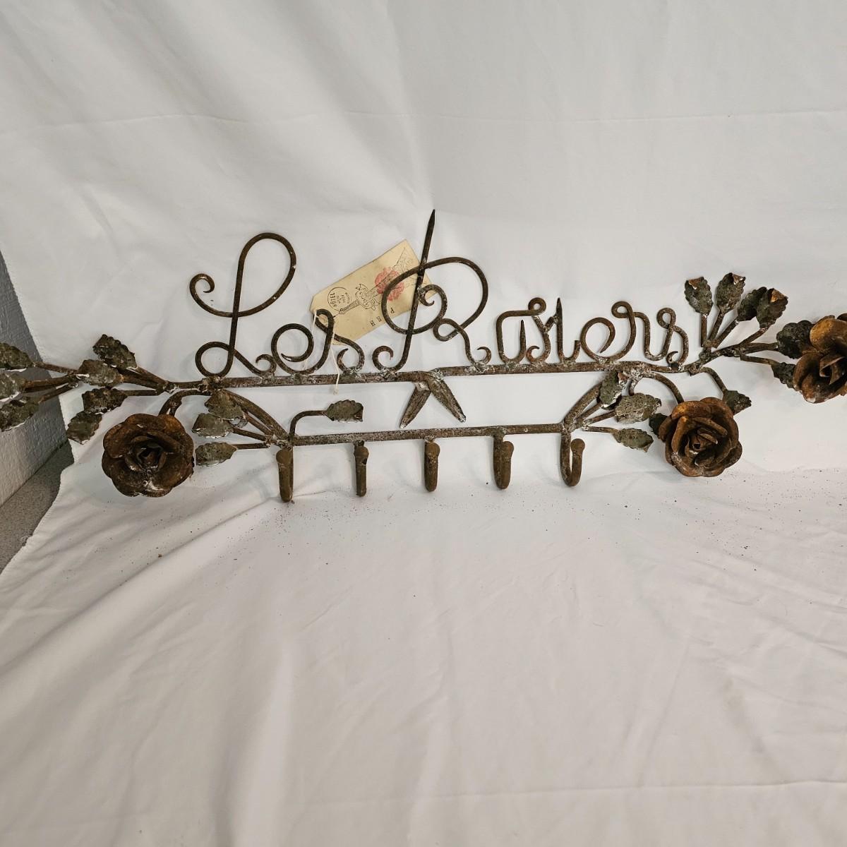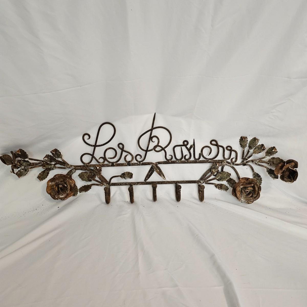 Two rose themed coat/towel holders with the script 'Les Rosters'. 33"x 5" x 11"h. Also includes one curved towel rack with decorative top and legs. Item is 14" x 18" x 67"h. Items are rusty to various degrees, see photos for details. Local pickup only.