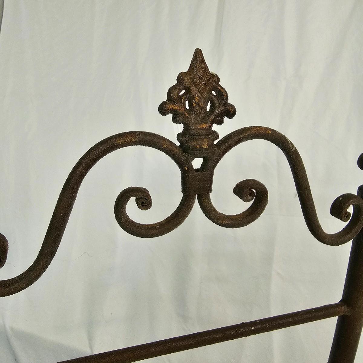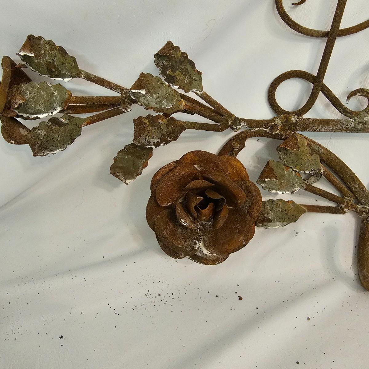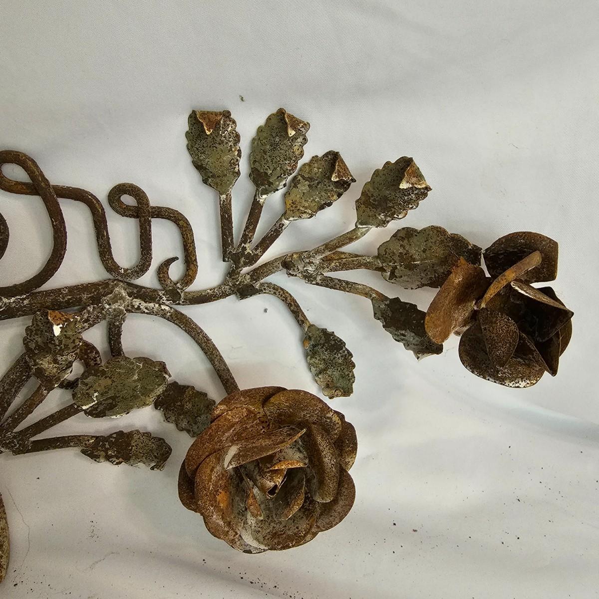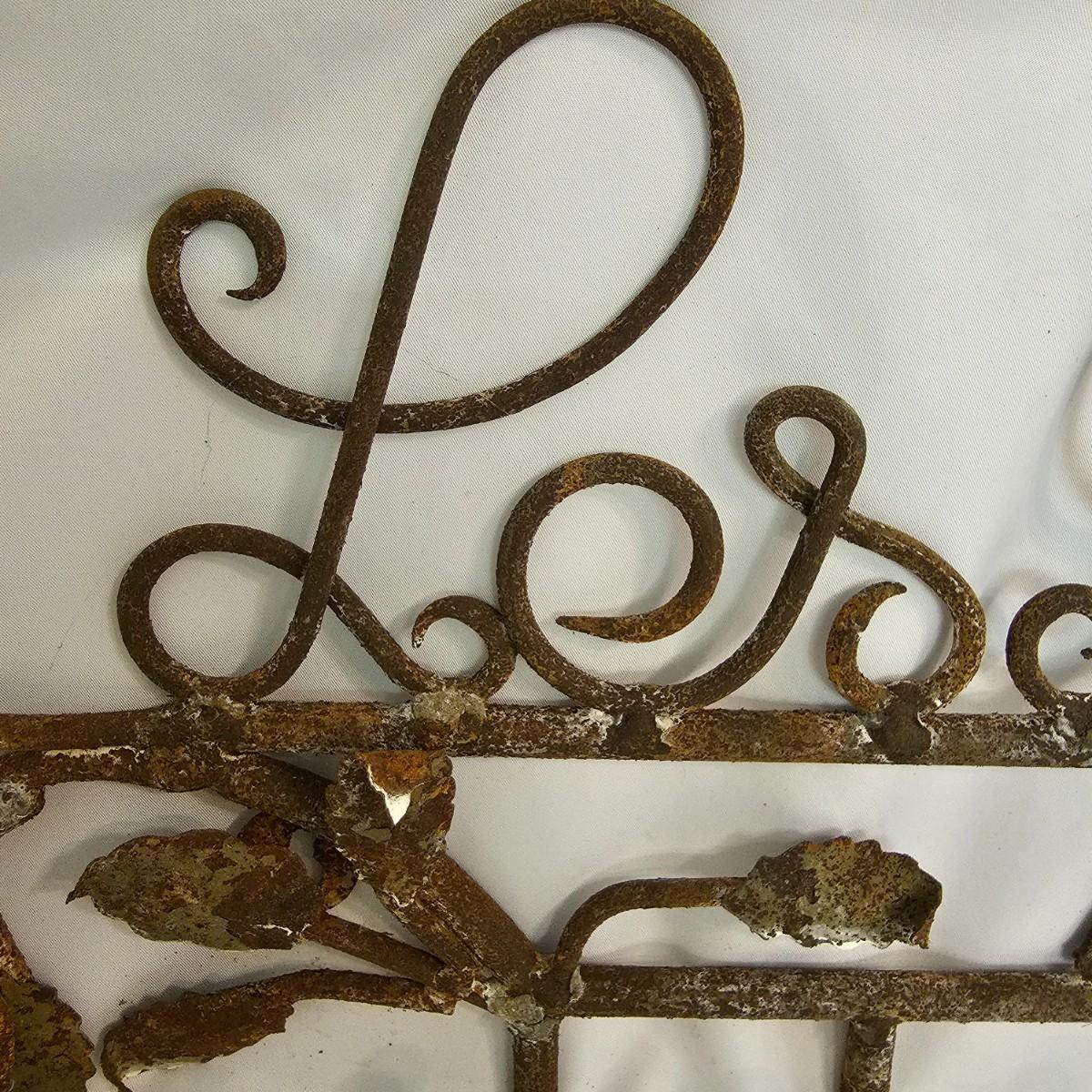 Two rose themed coat/towel holders with the script 'Les Rosters'. 33"x 5" x 11"h. Also includes one curved towel rack with decorative top and legs. Item is 14" x 18" x 67"h. Items are rusty to various degrees, see photos for details. Local pickup only.