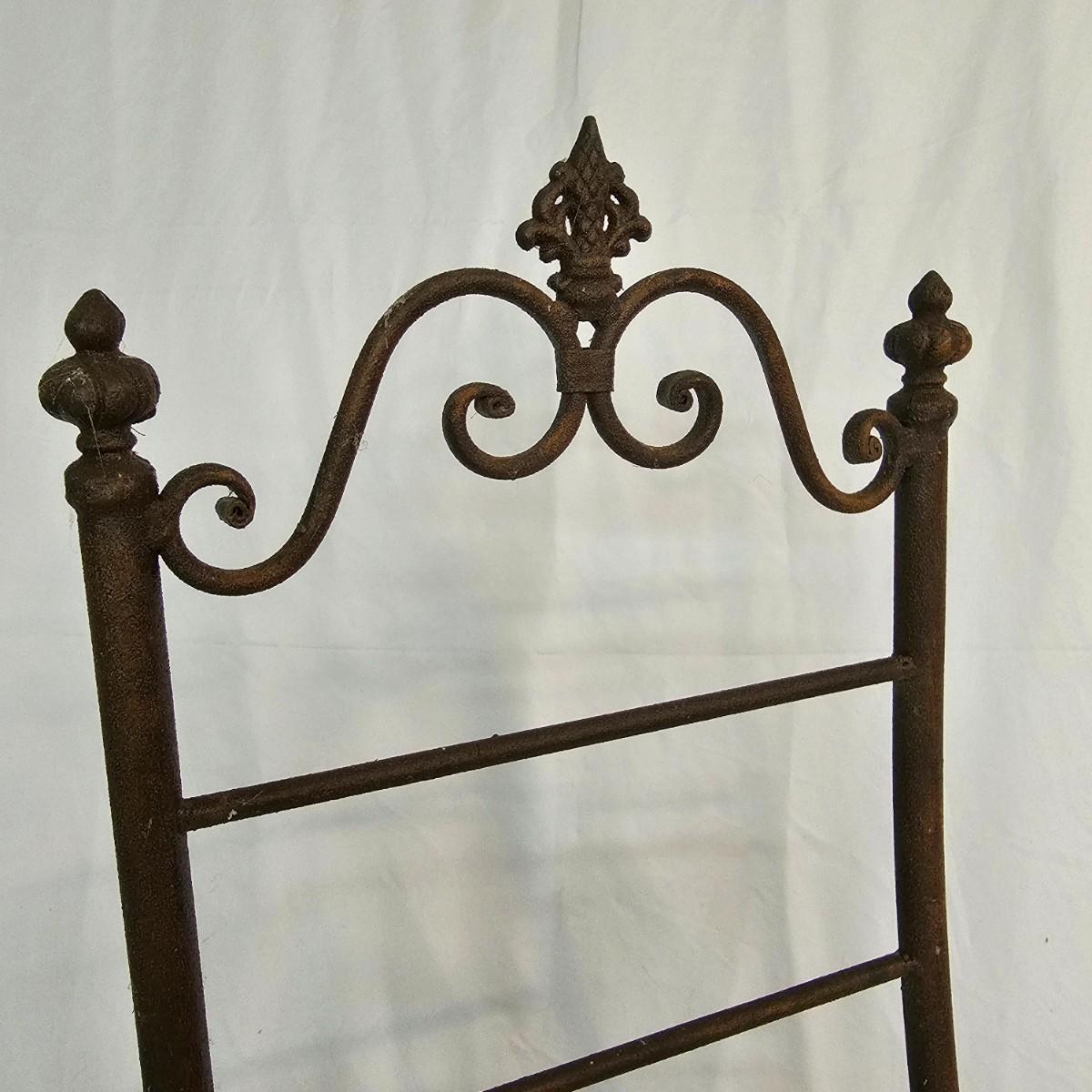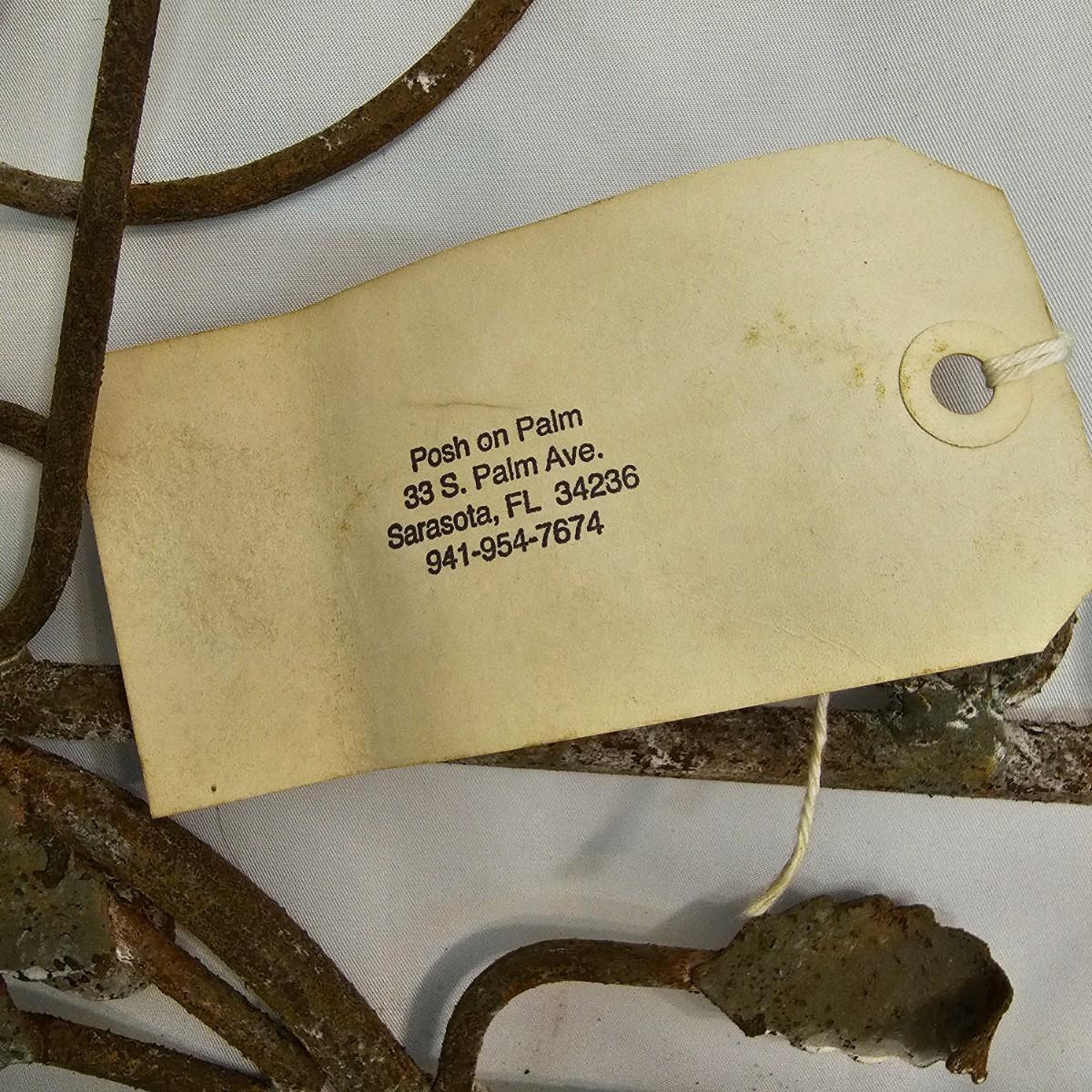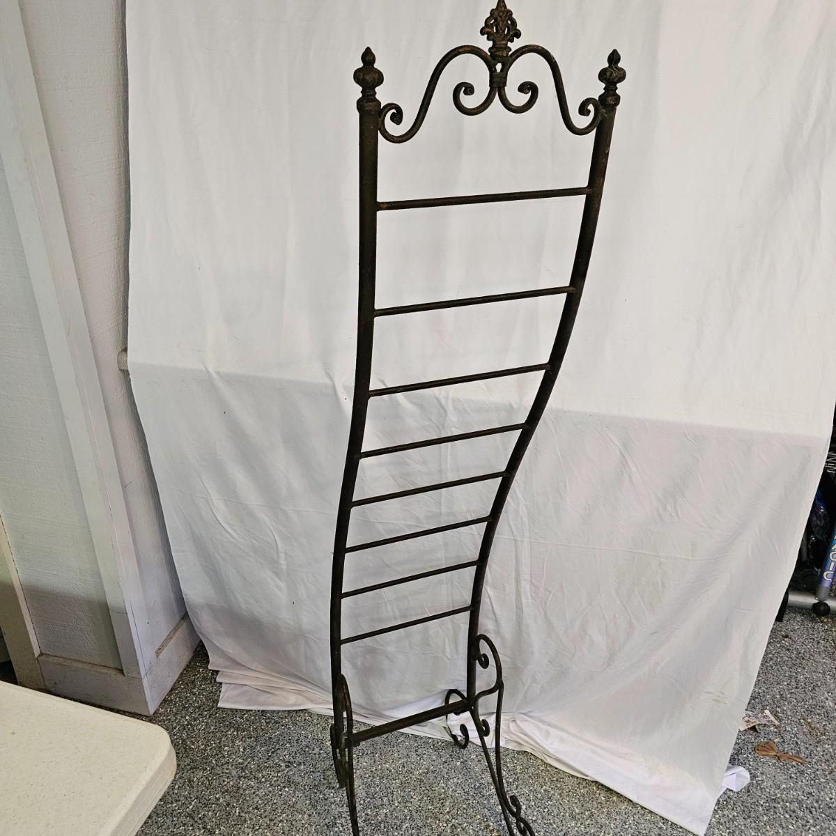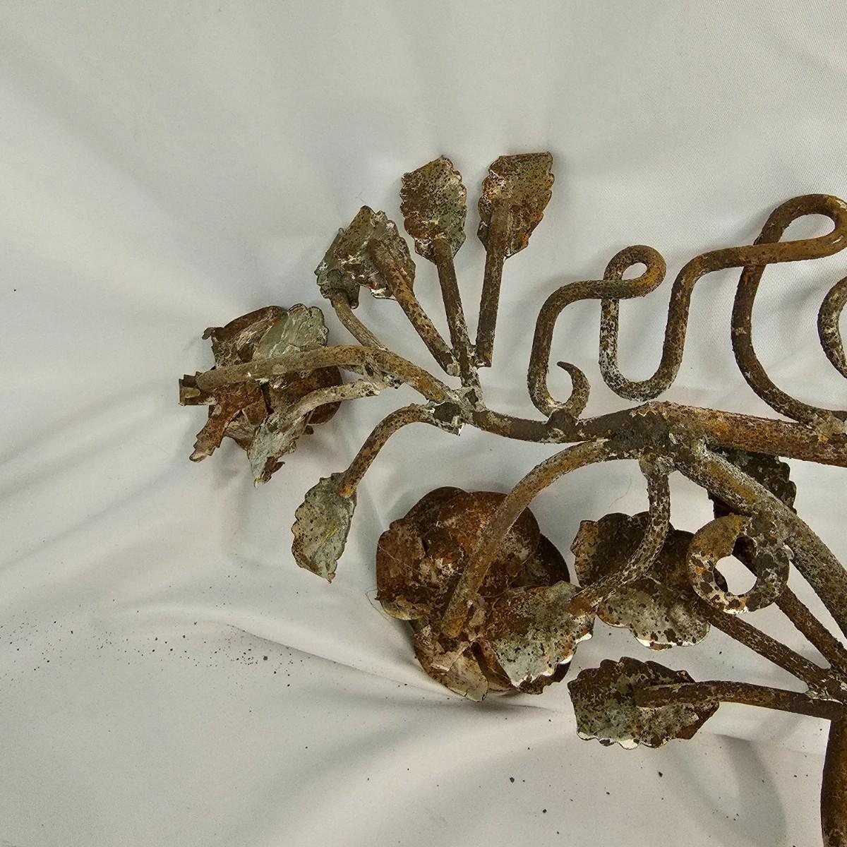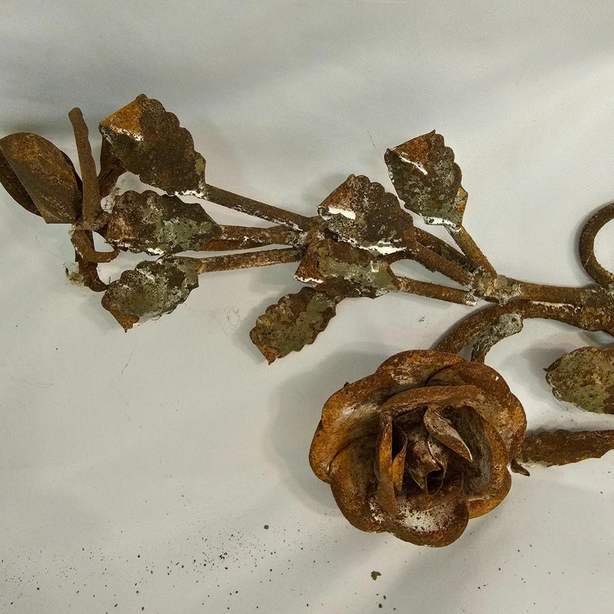 Two rose themed coat/towel holders with the script 'Les Rosters'. 33"x 5" x 11"h. Also includes one curved towel rack with decorative top and legs. Item is 14" x 18" x 67"h. Items are rusty to various degrees, see photos for details. Local pickup only.