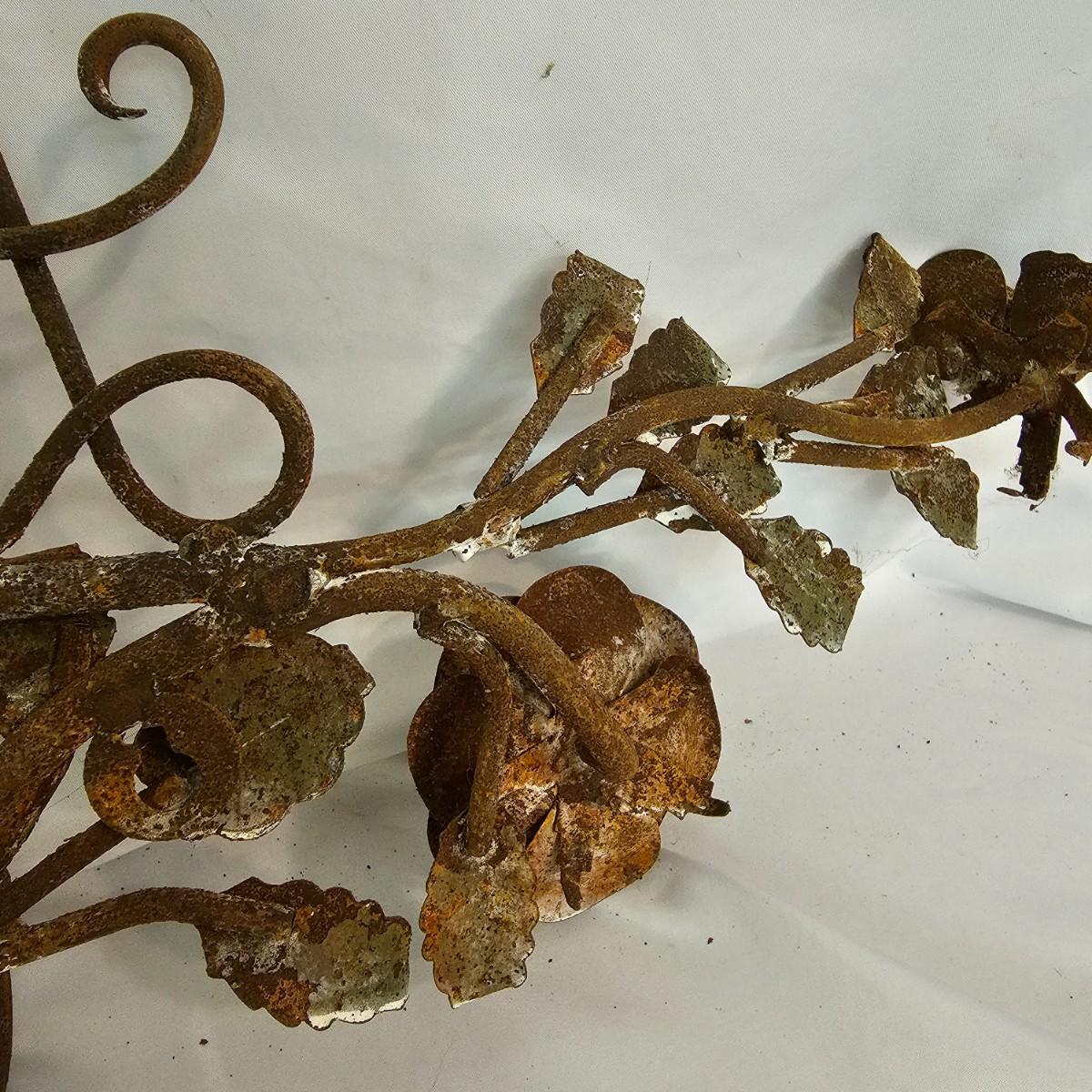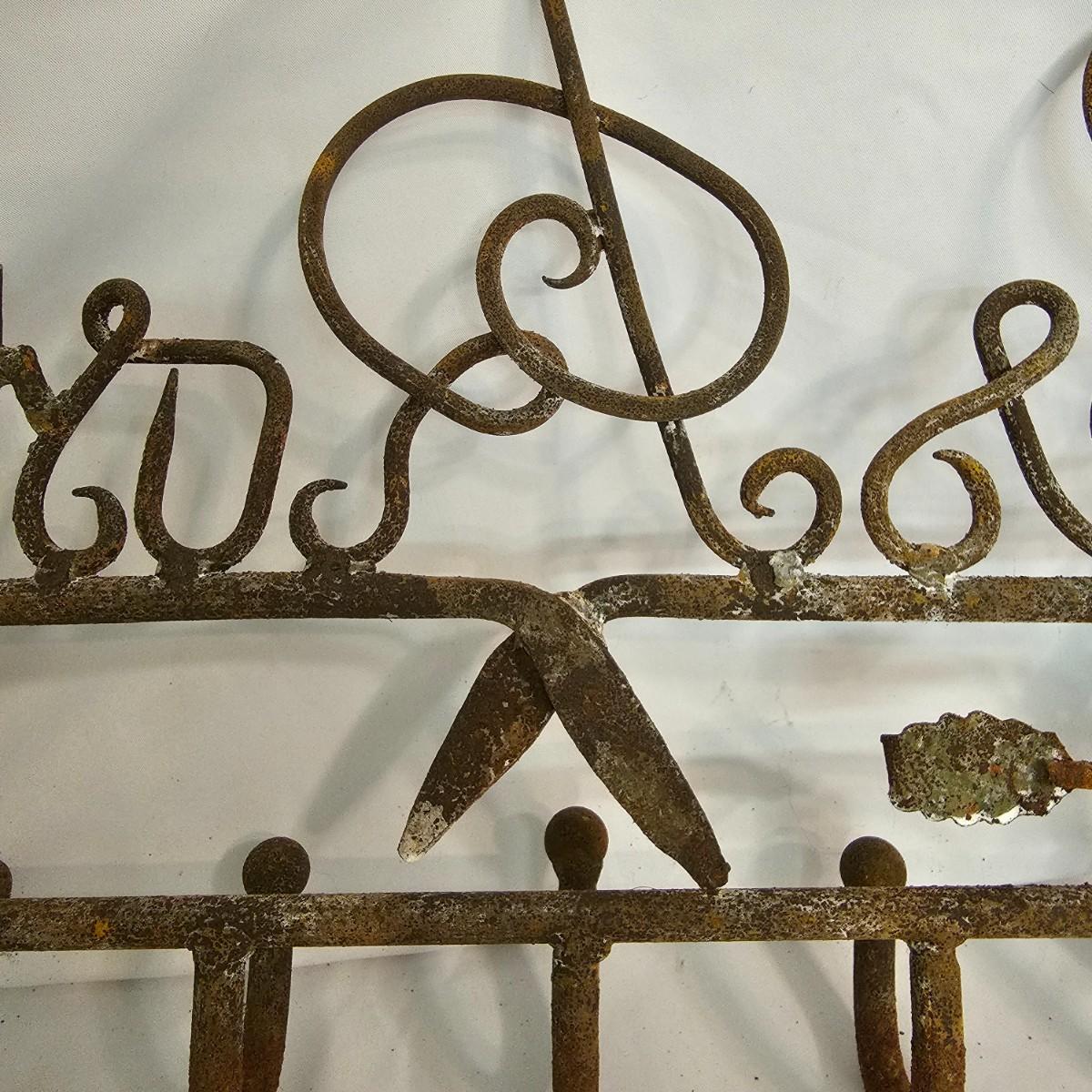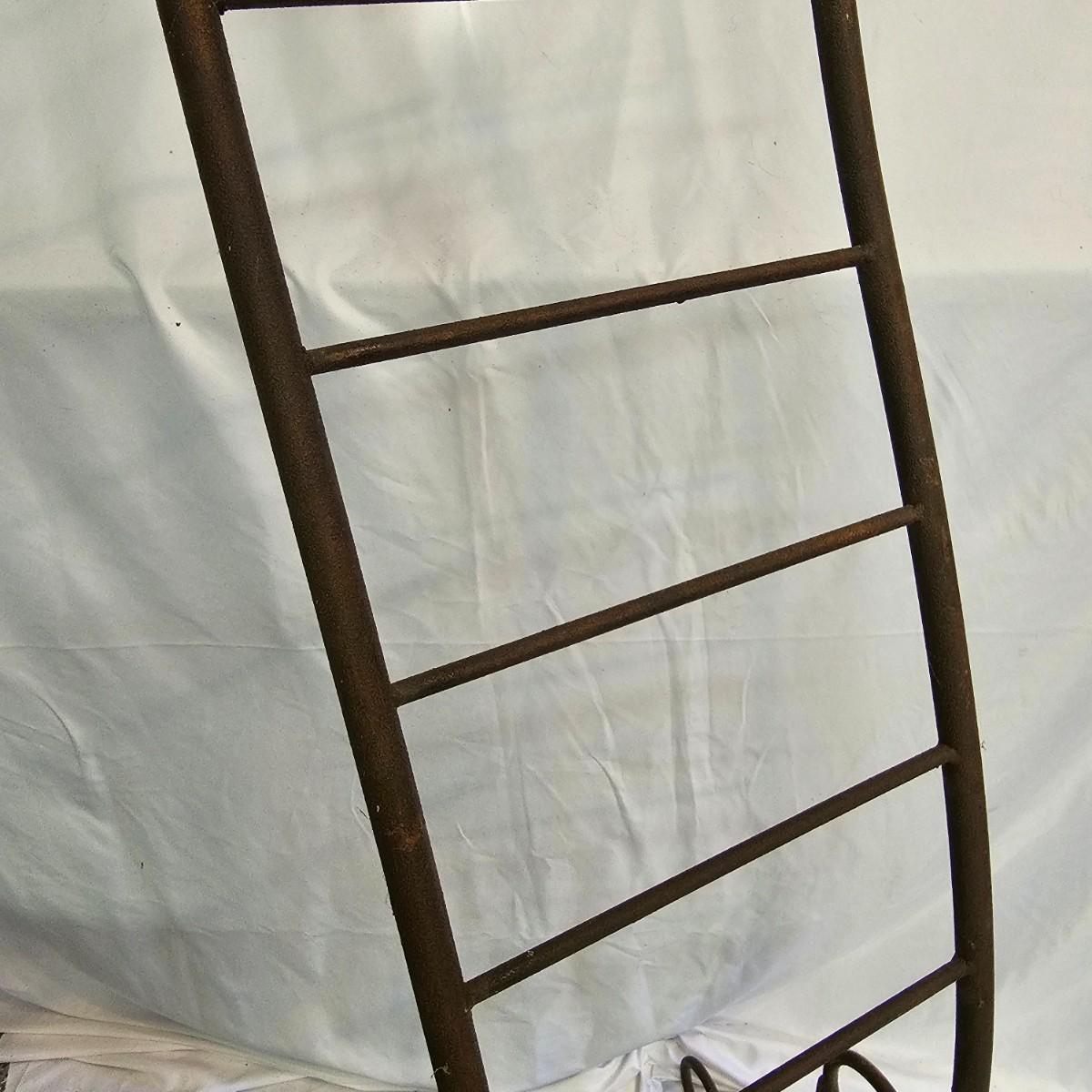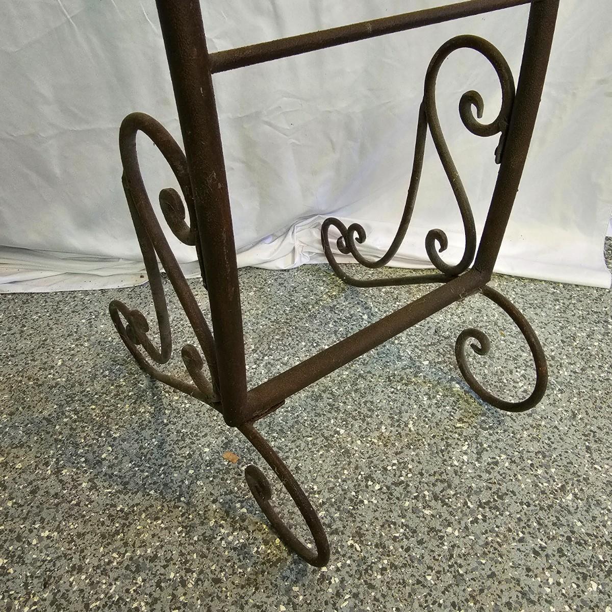 Two rose themed coat/towel holders with the script 'Les Rosters'. 33"x 5" x 11"h. Also includes one curved towel rack with decorative top and legs. Item is 14" x 18" x 67"h. Items are rusty to various degrees, see photos for details. Local pickup only.