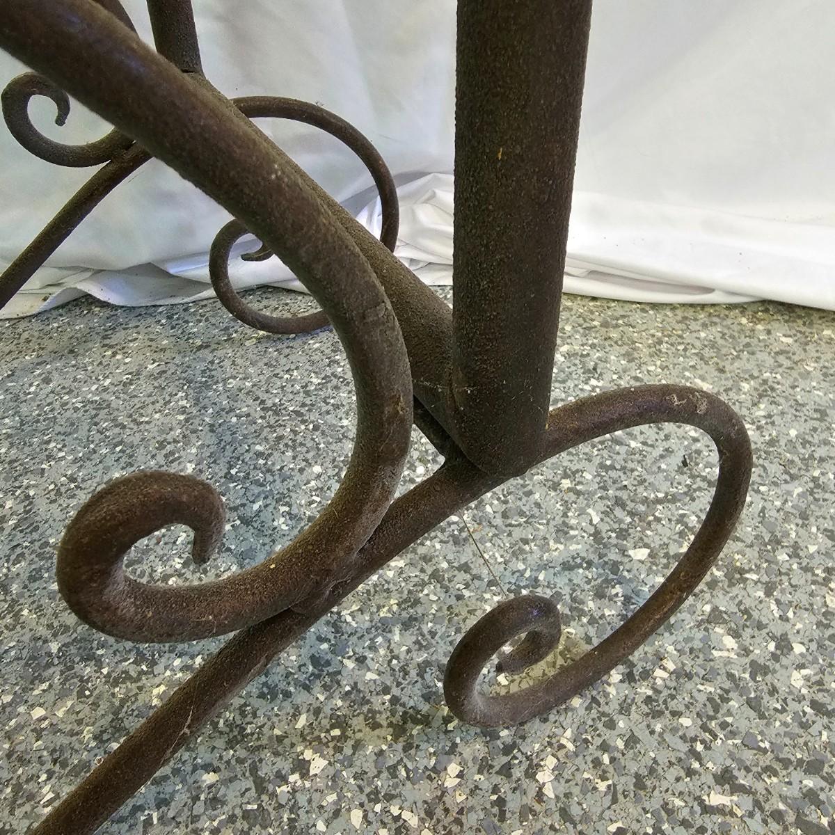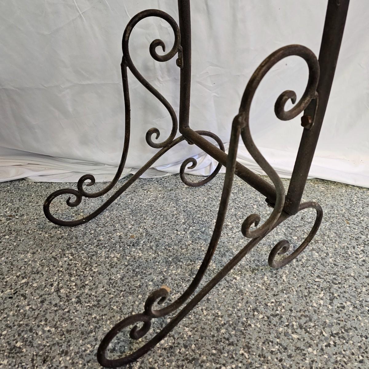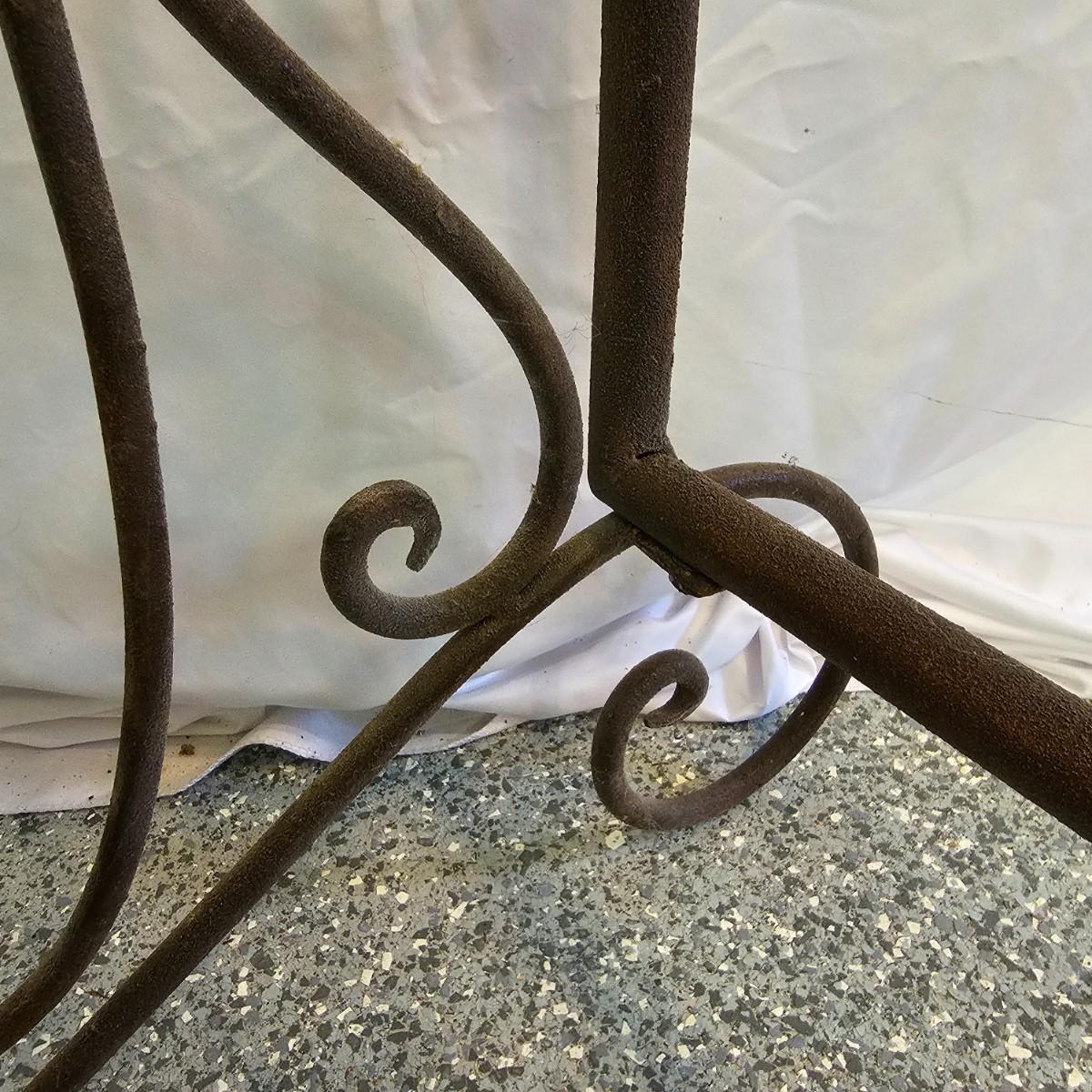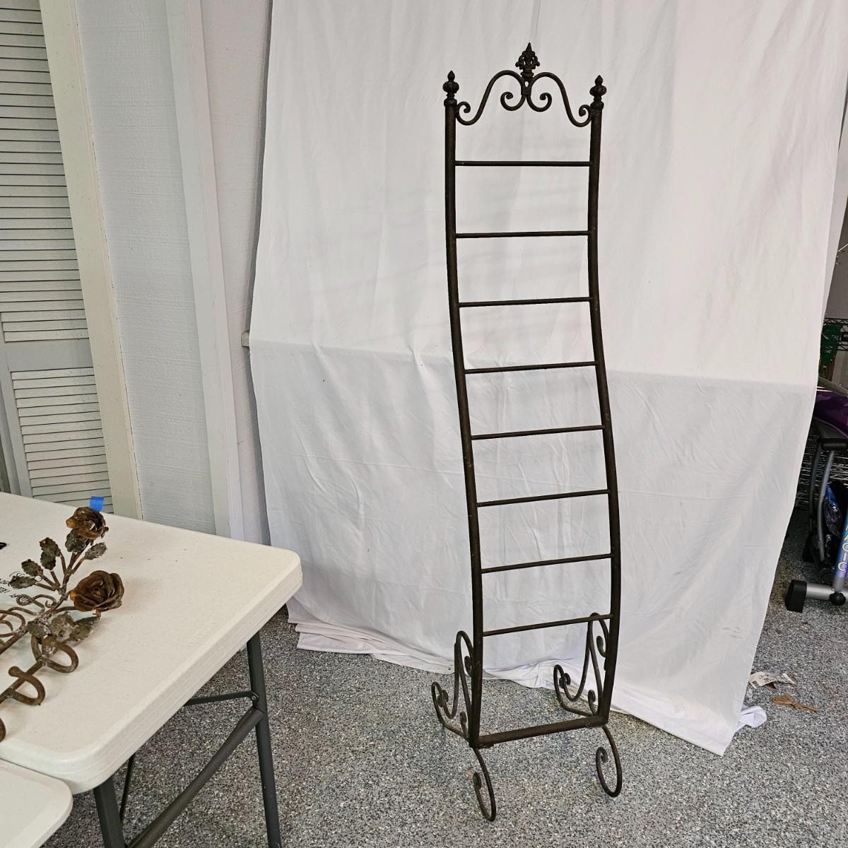 Two rose themed coat/towel holders with the script 'Les Rosters'. 33"x 5" x 11"h. Also includes one curved towel rack with decorative top and legs. Item is 14" x 18" x 67"h. Items are rusty to various degrees, see photos for details. Local pickup only.
