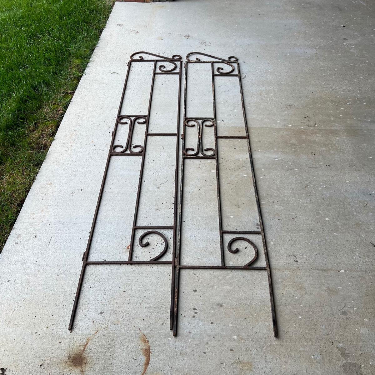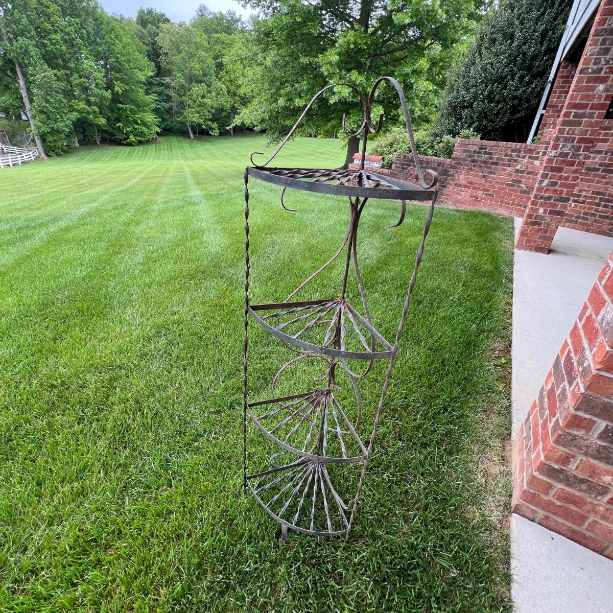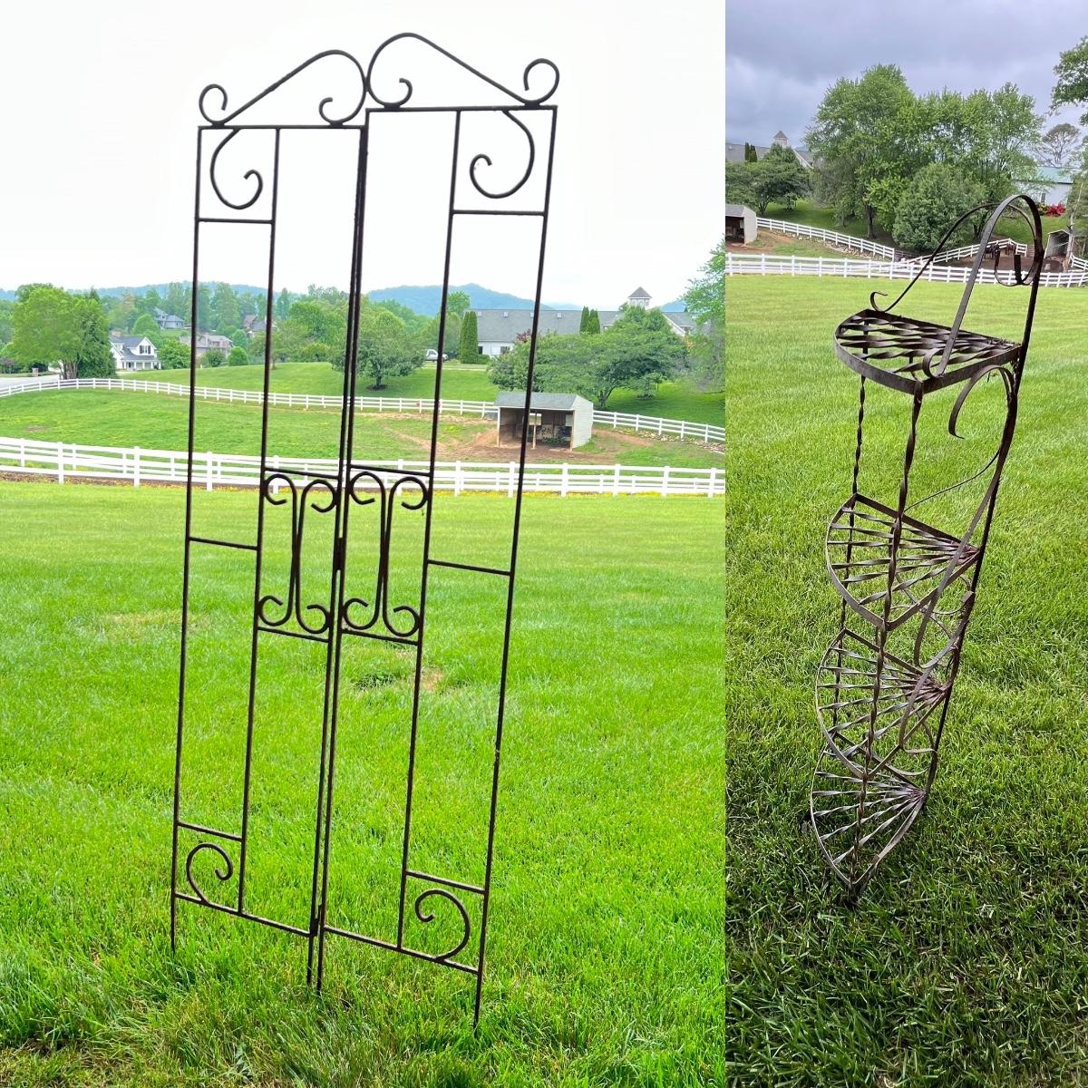 These three items are wrought iron with a lovely rust patina. The corner unit has four shelves. The two iron pieces with stakes are a pair and slot into each other and are beautiful as a stand alone piece or could be used as a trellis to train plants; together these pieces measure 32” x 90”H.