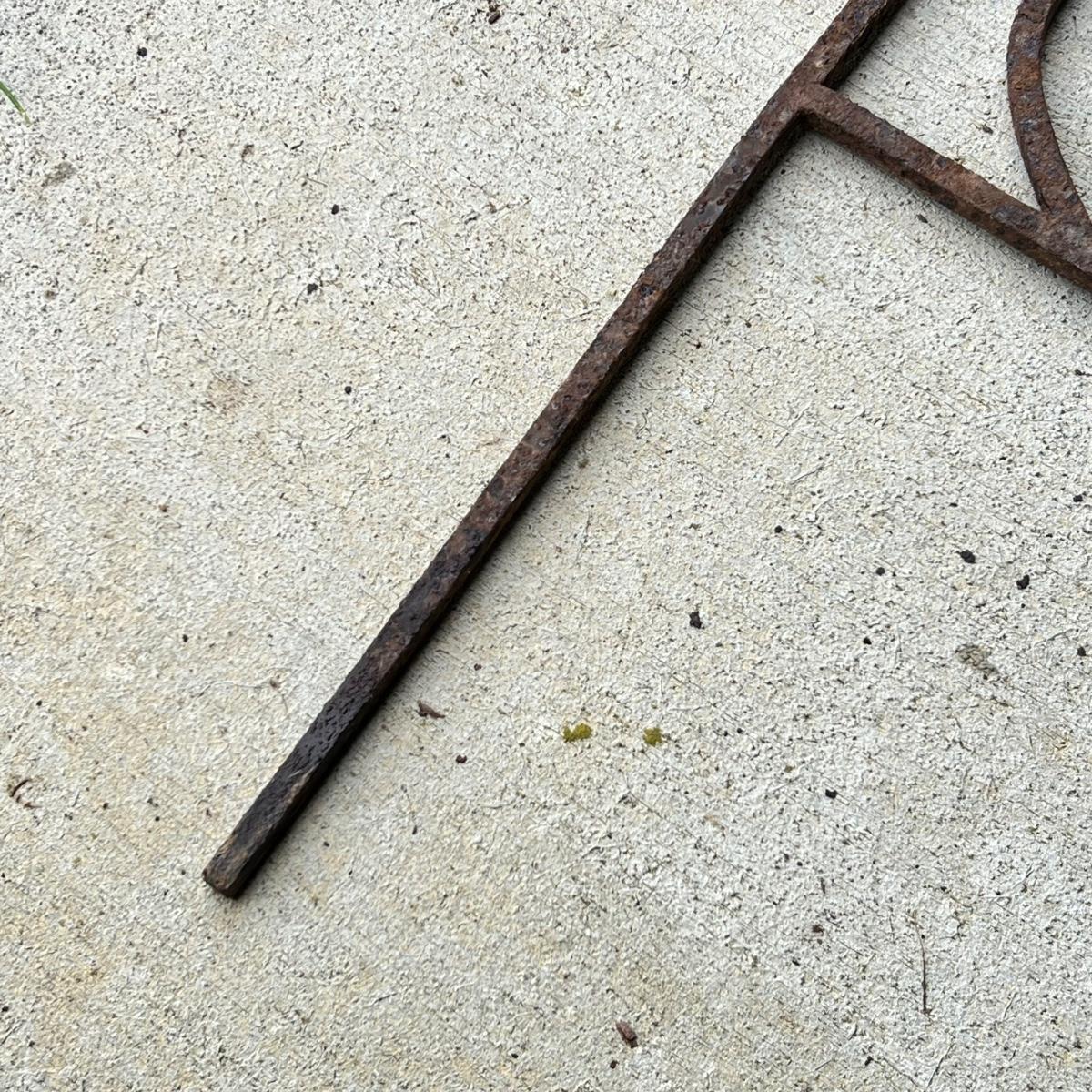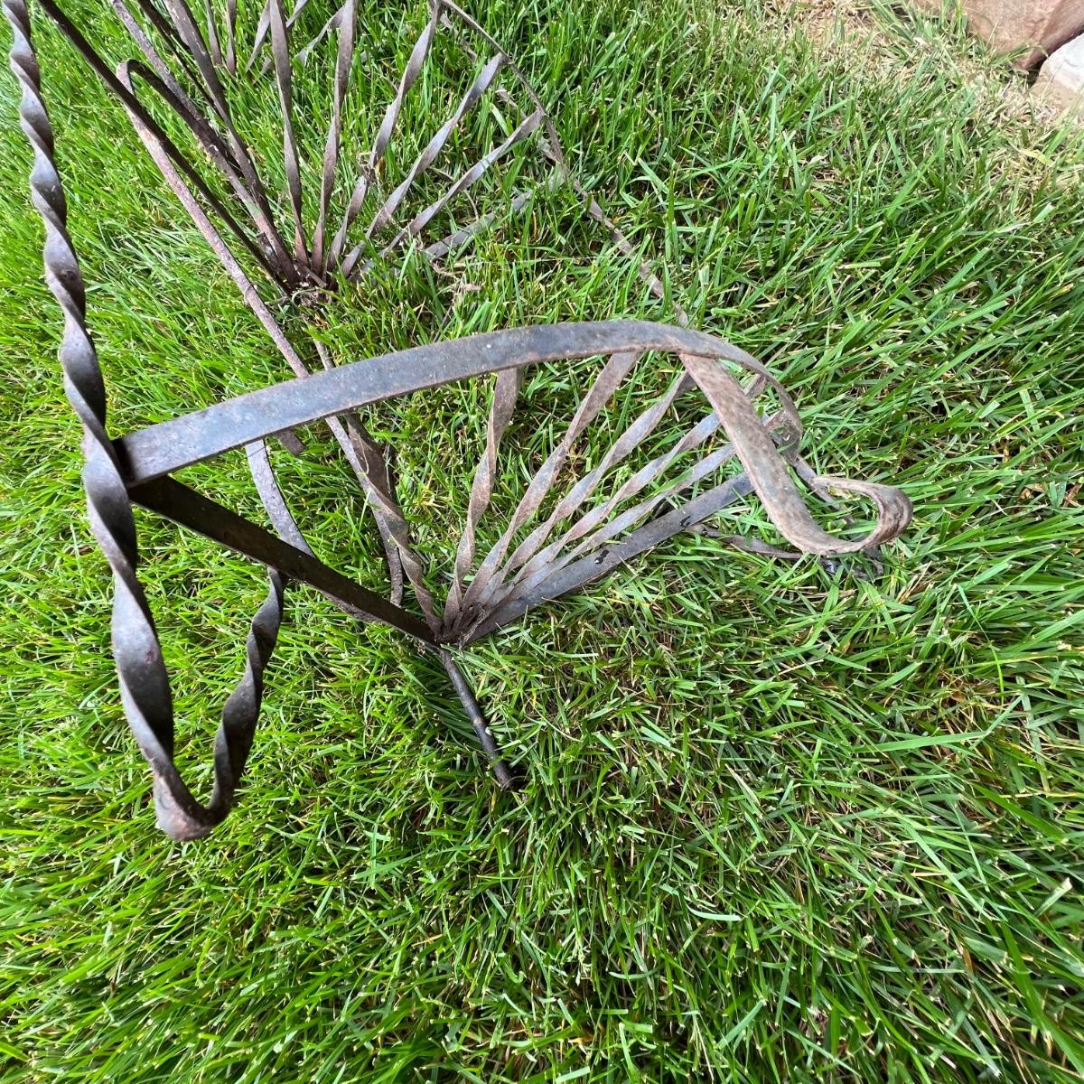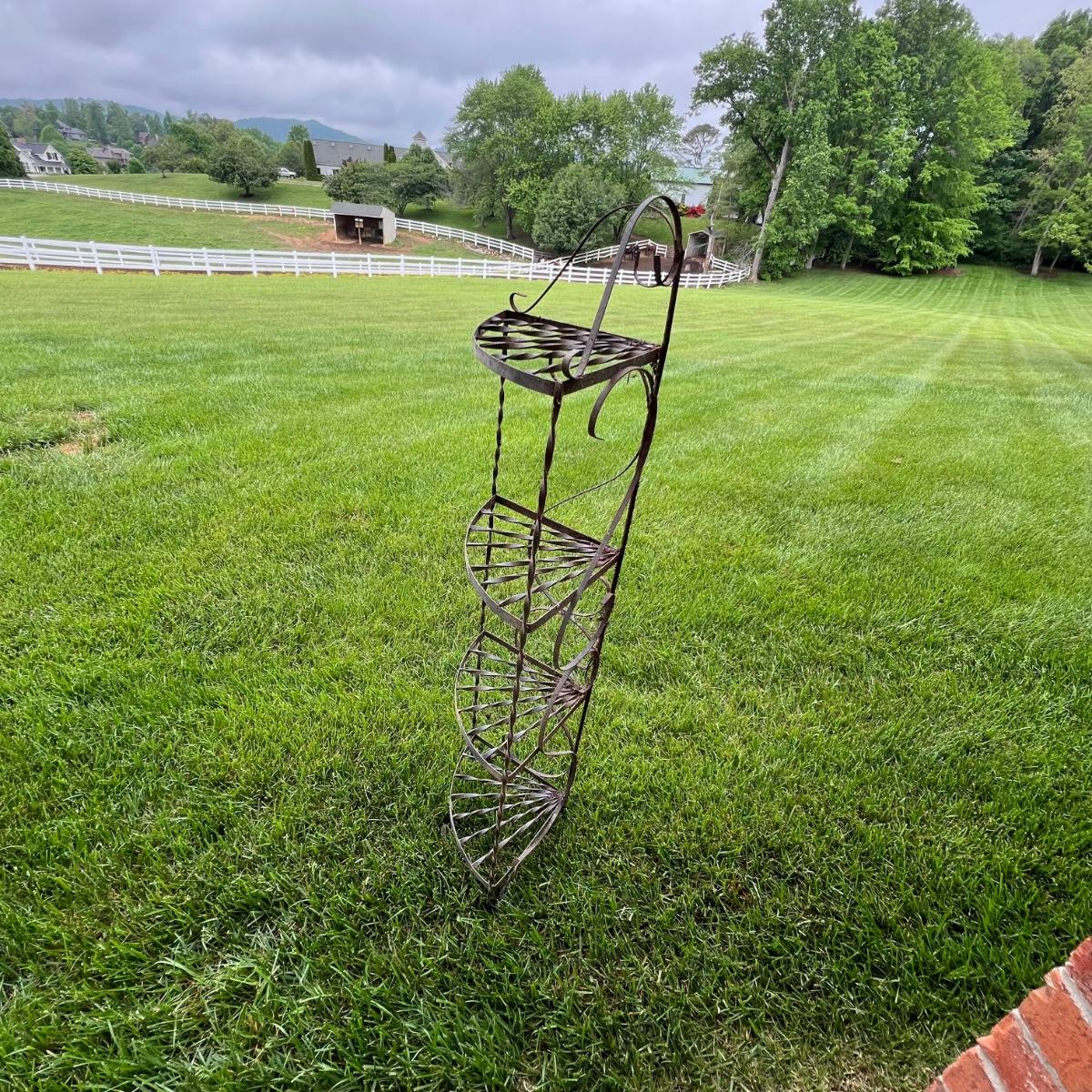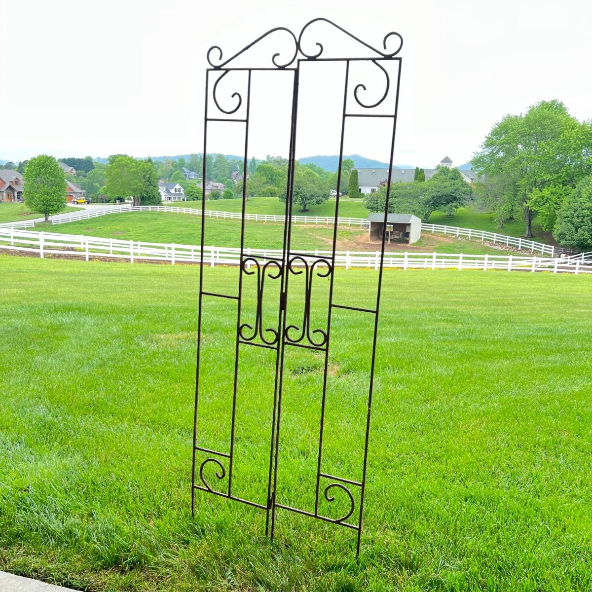These three items are wrought iron with a lovely rust patina. The corner unit has four shelves. The two iron pieces with stakes are a pair and slot into each other and are beautiful as a stand alone piece or could be used as a trellis to train plants; together these pieces measure 32” x 90”H.