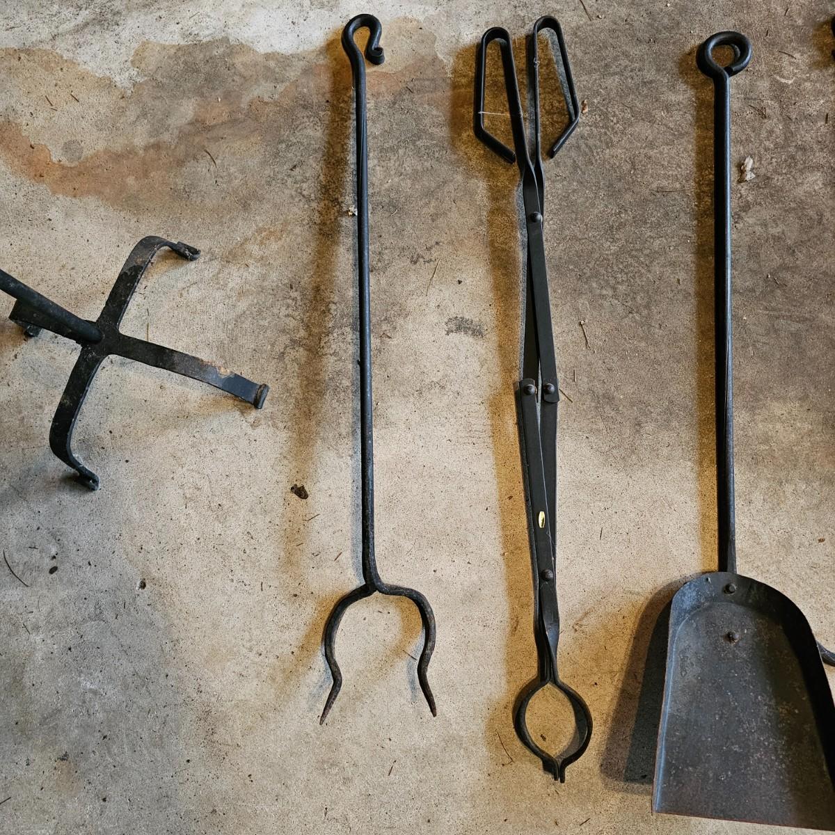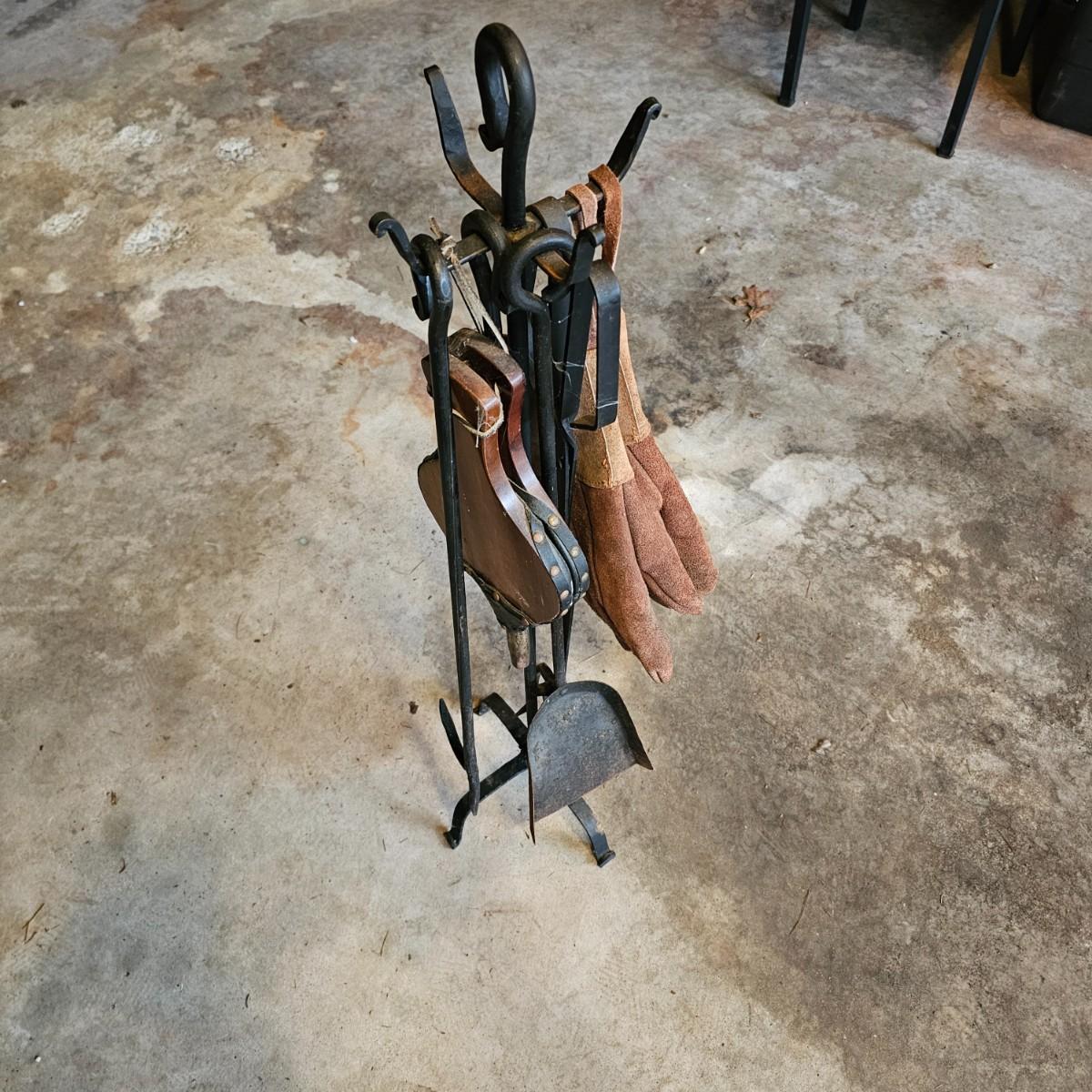 Wrought iron stand and fireplace tools, a pair of fireplace gloves and a bellows that do work. Two pokers, shovel and log tongs are approximately 28" in length. Stand measures 9" x 37"H. See photos for details. Local pickup only.