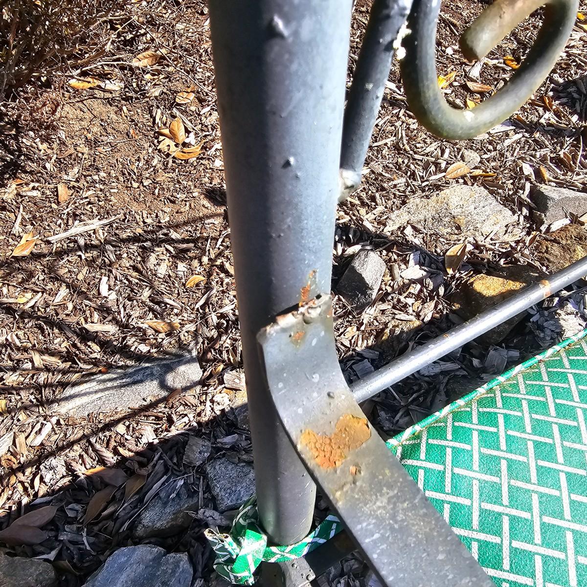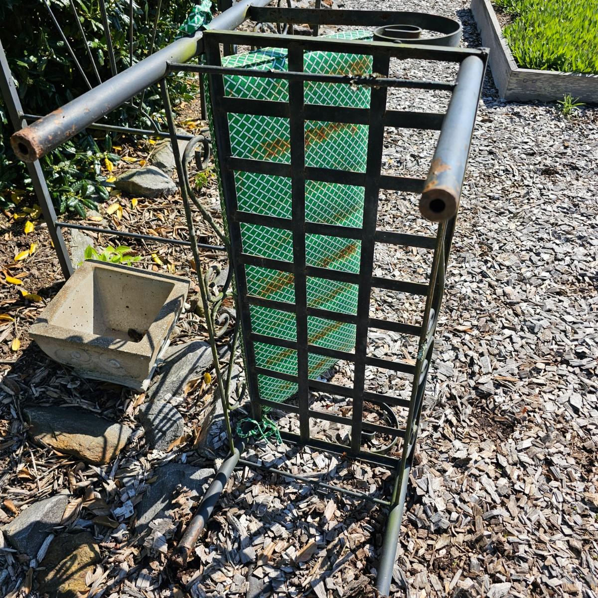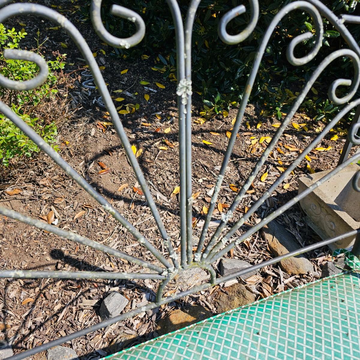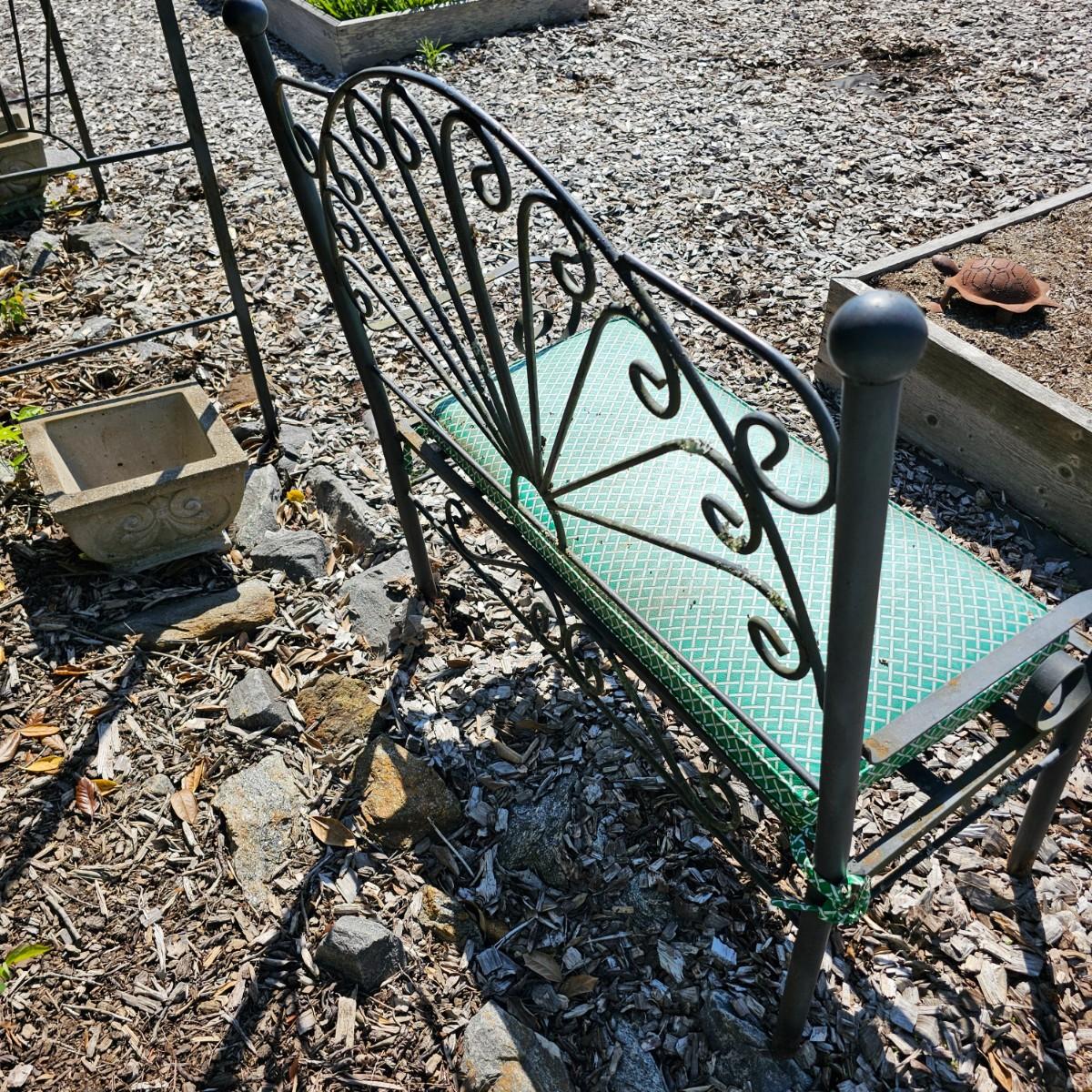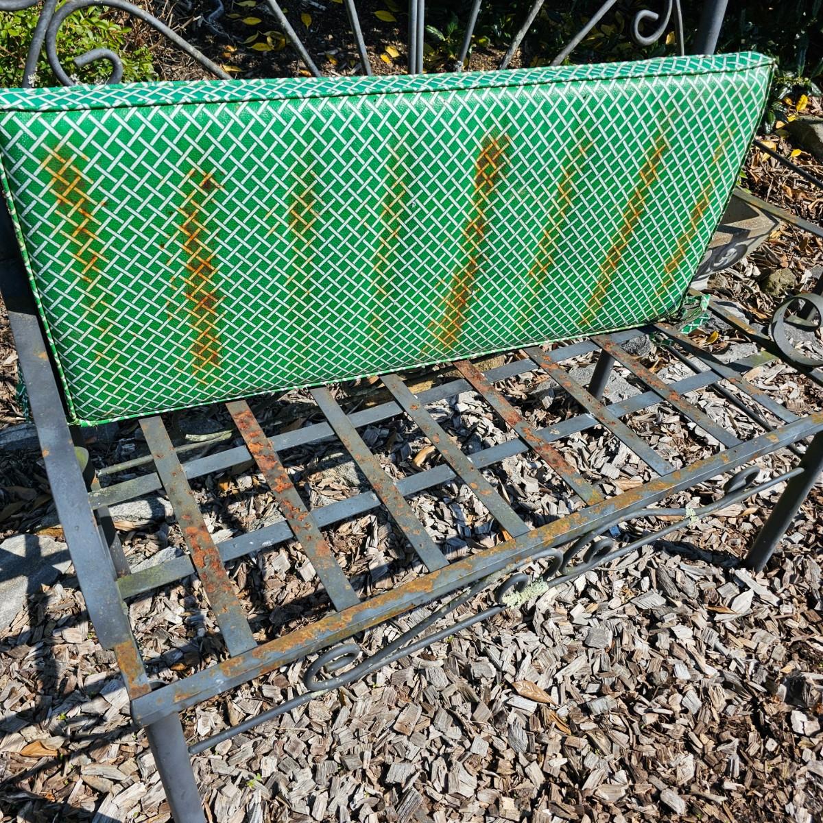 Straight backed wrought iron garden bench with cushion. Bench has rust spots on seat and legs, one arm is detached from back. Cushion is faded. Bench measures 19" x 40" x 41"H, has 19" seat height with cushion. Needs tlc. See photos for details. Local pickup only.