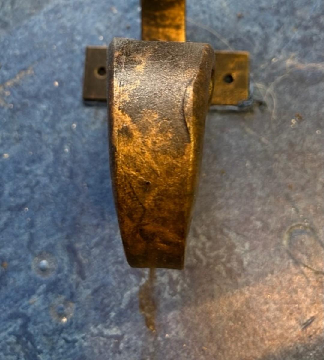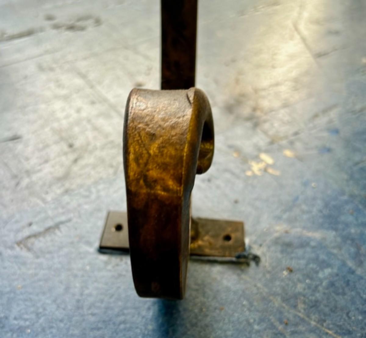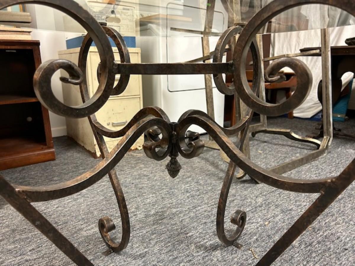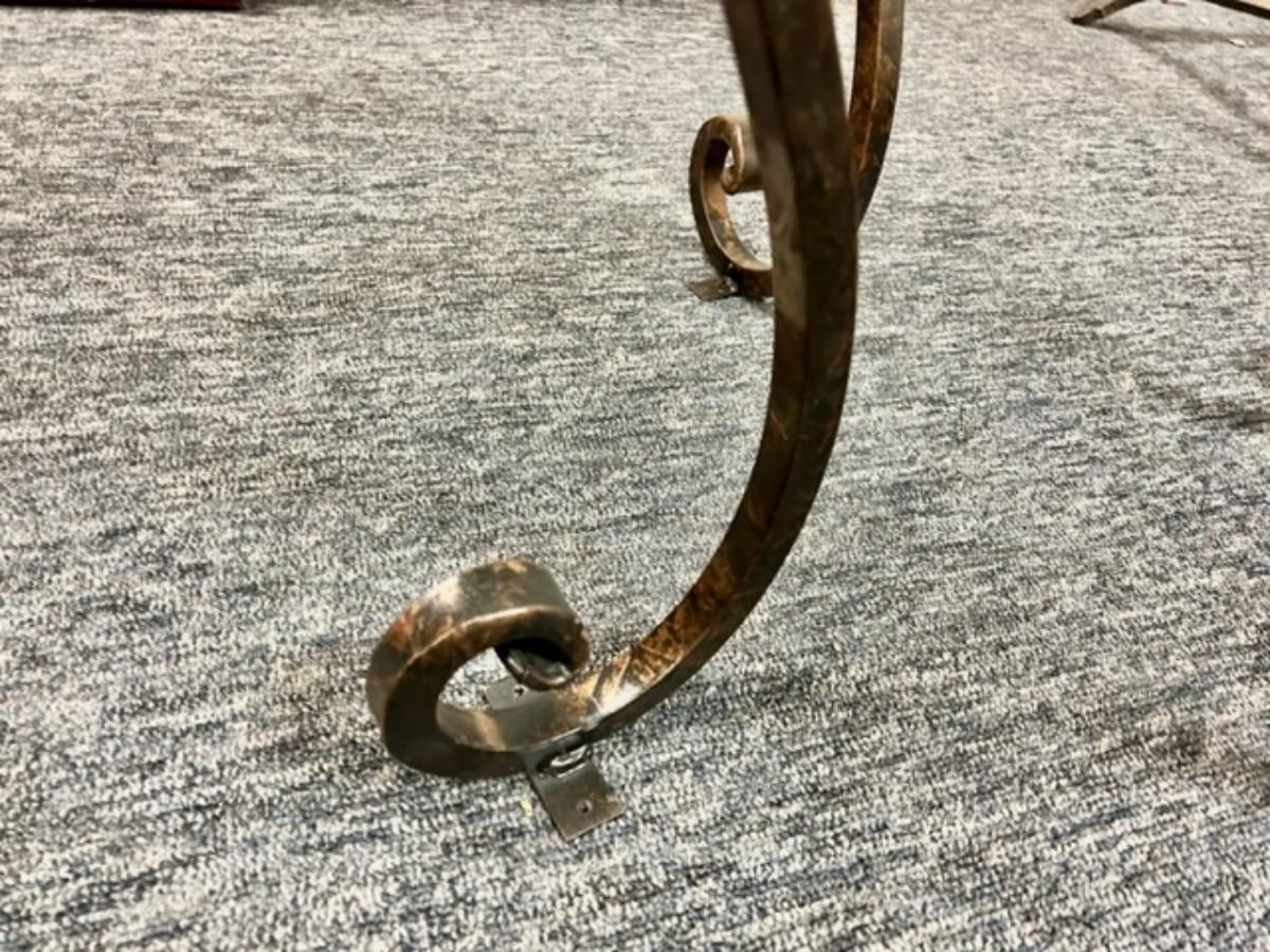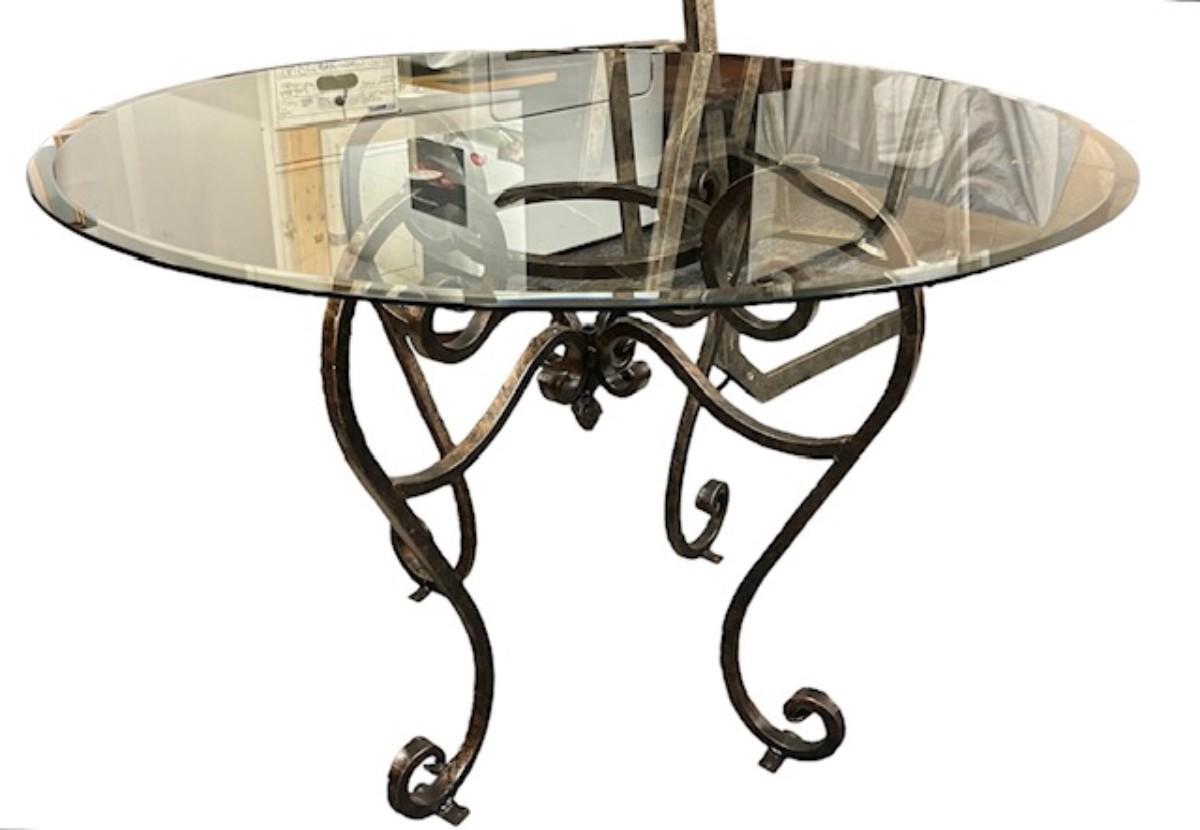Scrolled metal base with quarter inch glass top with beveled edge. Metal plates on feet for securing base to the floor. Good condition, consistent with age and use.