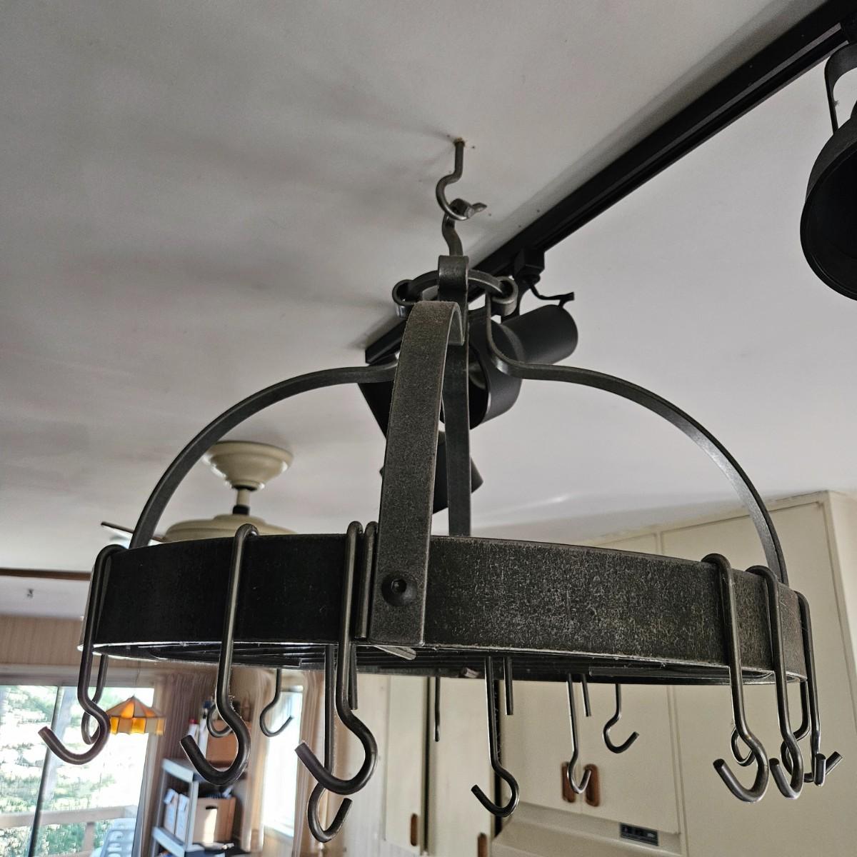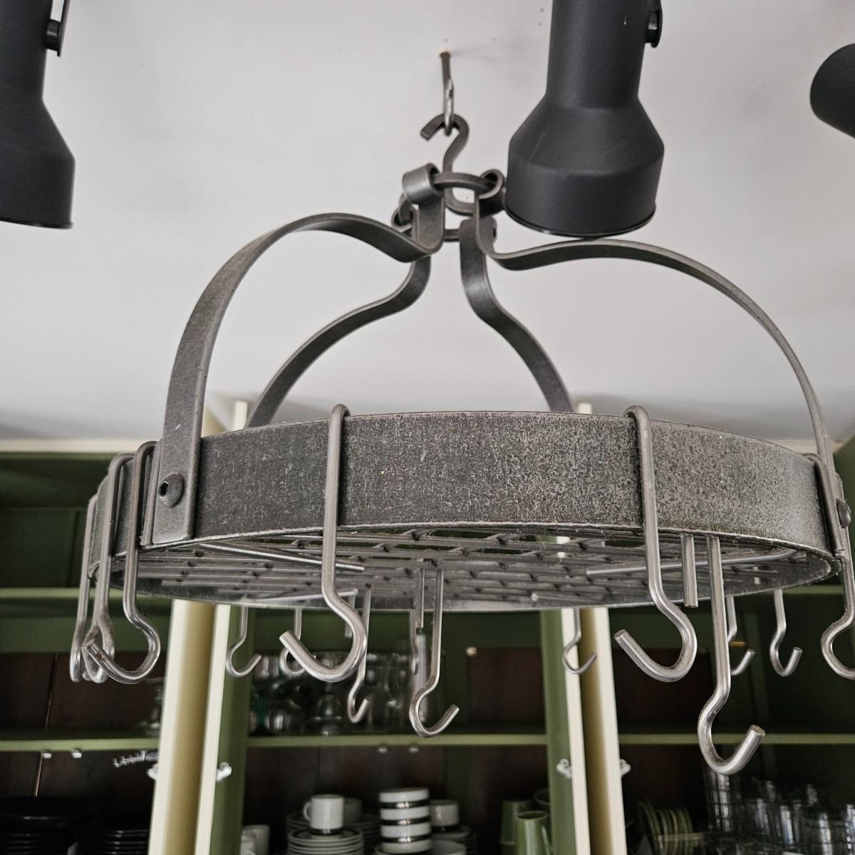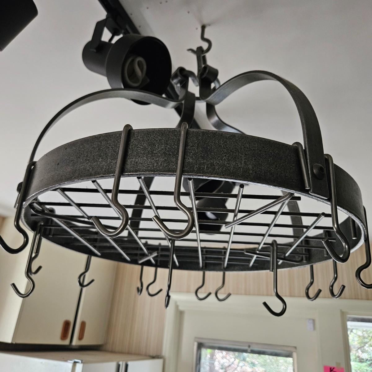 A hanging wrought-iron pot and pan rack that includes 16 hanging hooks and a removable interior grid. It includes a matching hanging hook and measures approximately 19.5"D x 16"H. Local pickup only