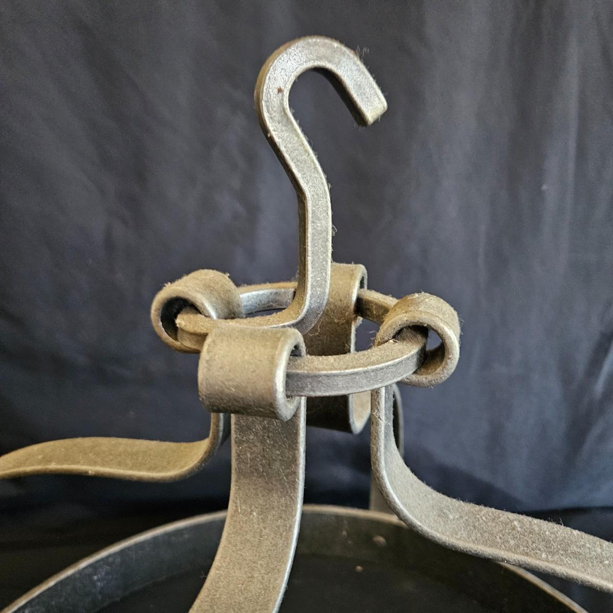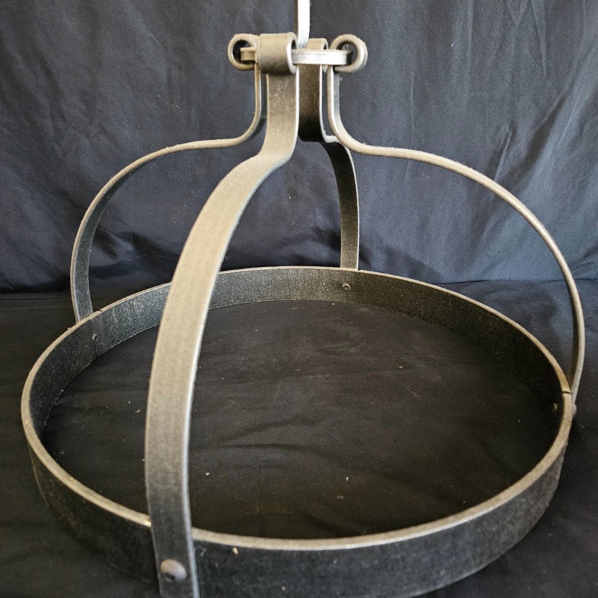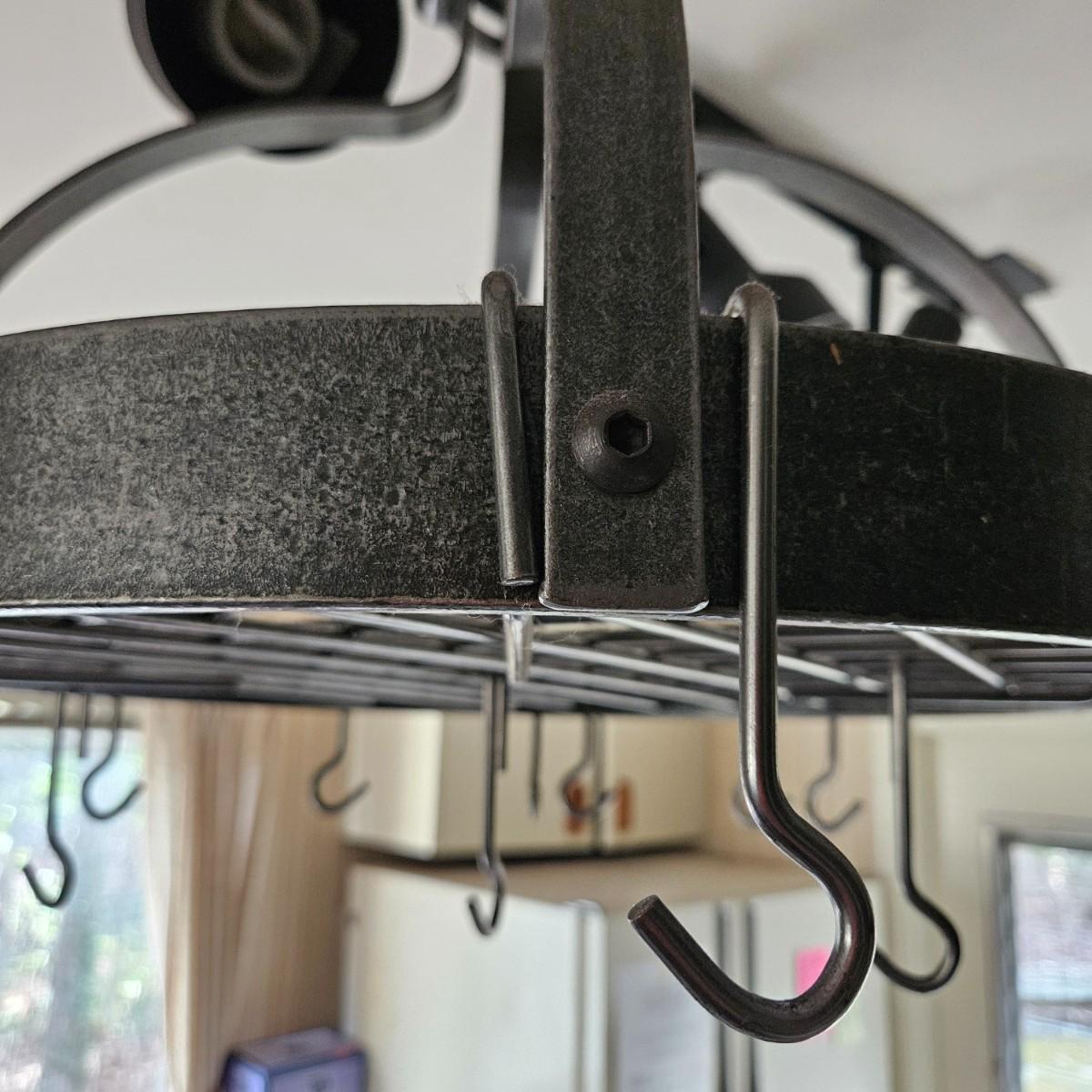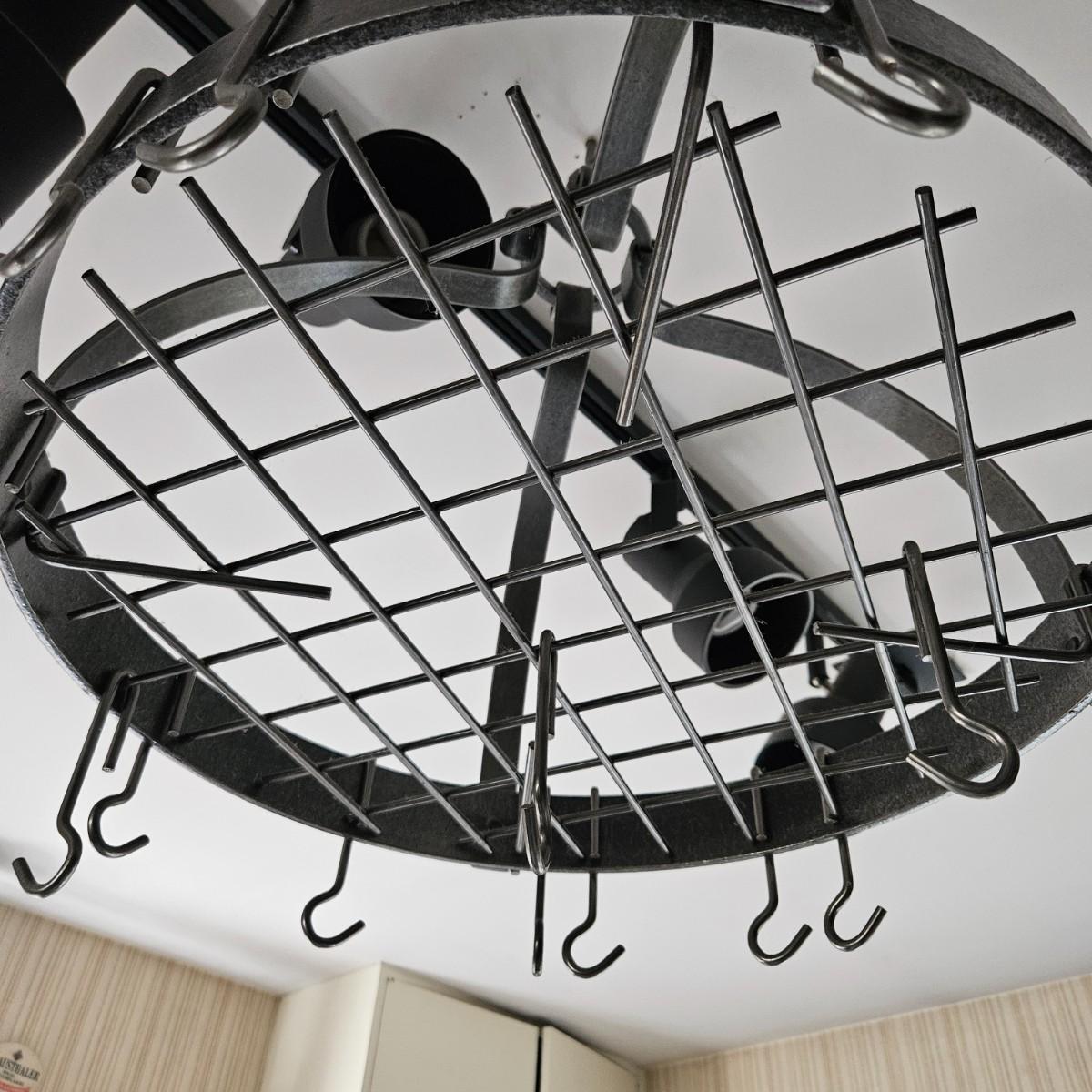 A hanging wrought-iron pot and pan rack that includes 16 hanging hooks and a removable interior grid. It includes a matching hanging hook and measures approximately 19.5"D x 16"H. Local pickup only