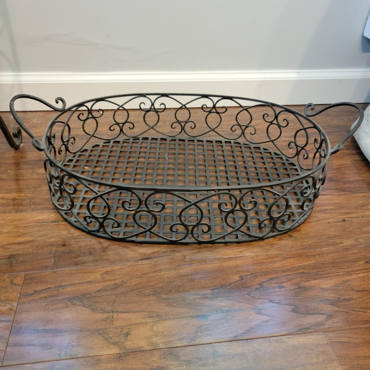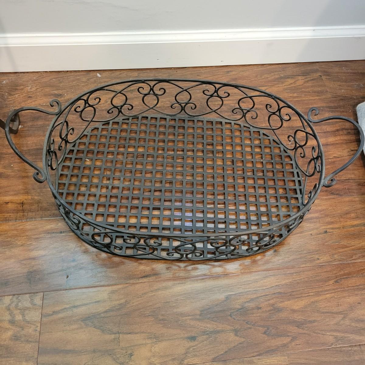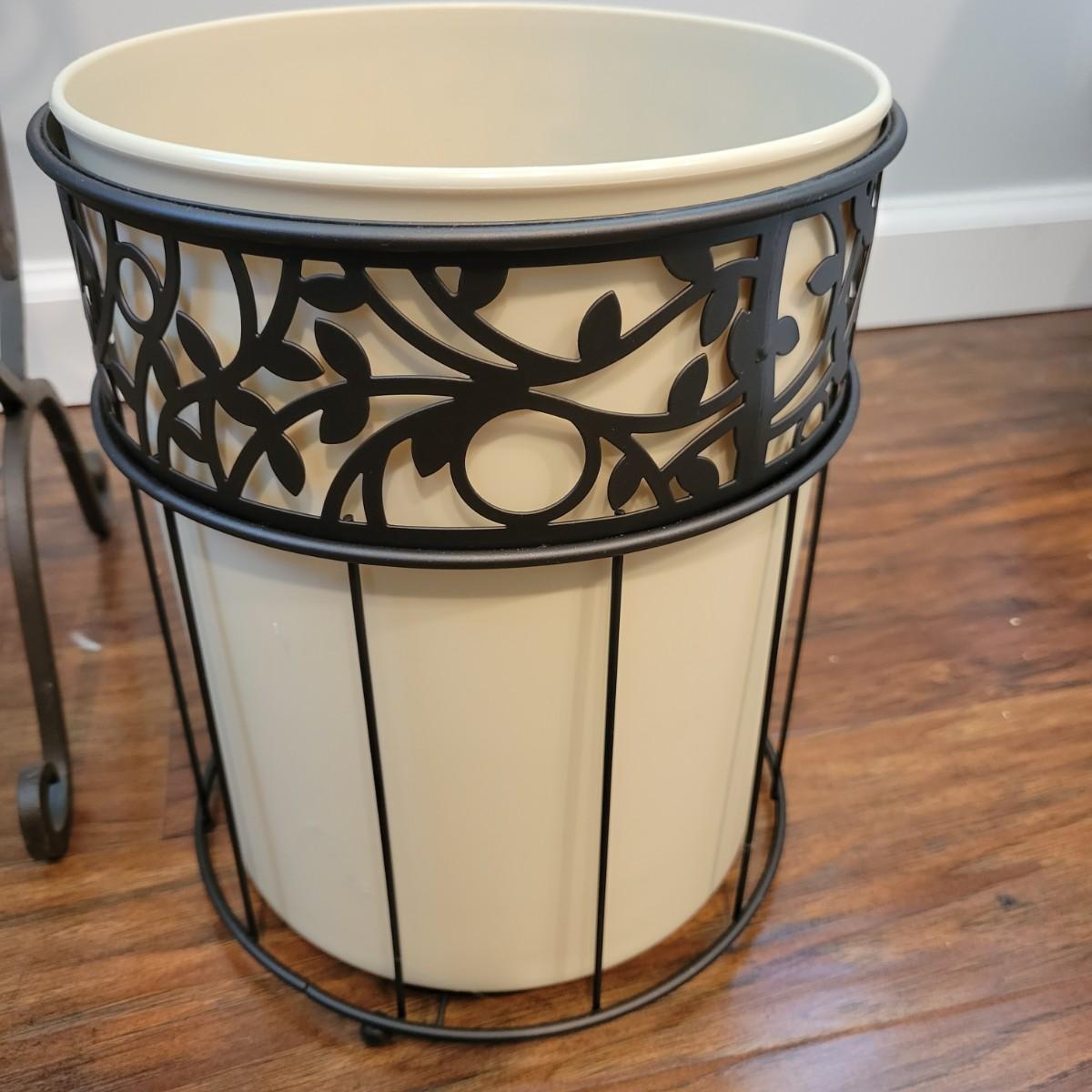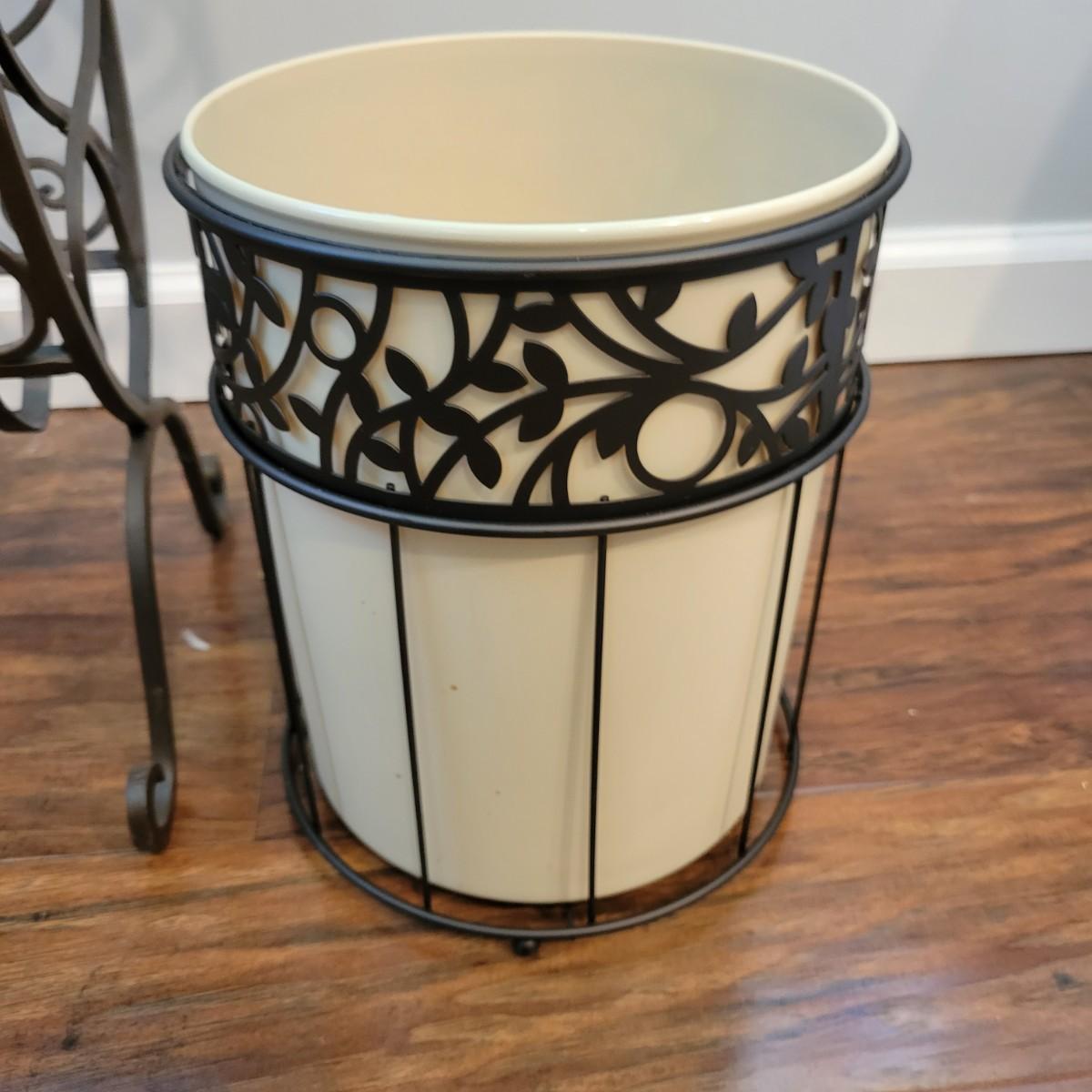 An assortment of wrought iron and black metal accessories. Included is a wrought iron magazine rack/table with a tempered glass top that measures approximately 14" x 10" x 22". Also included is a decorative wrought iron basket/Serving Tray and a plastic waste bin with a decorative black metal exterior. Local pickup only