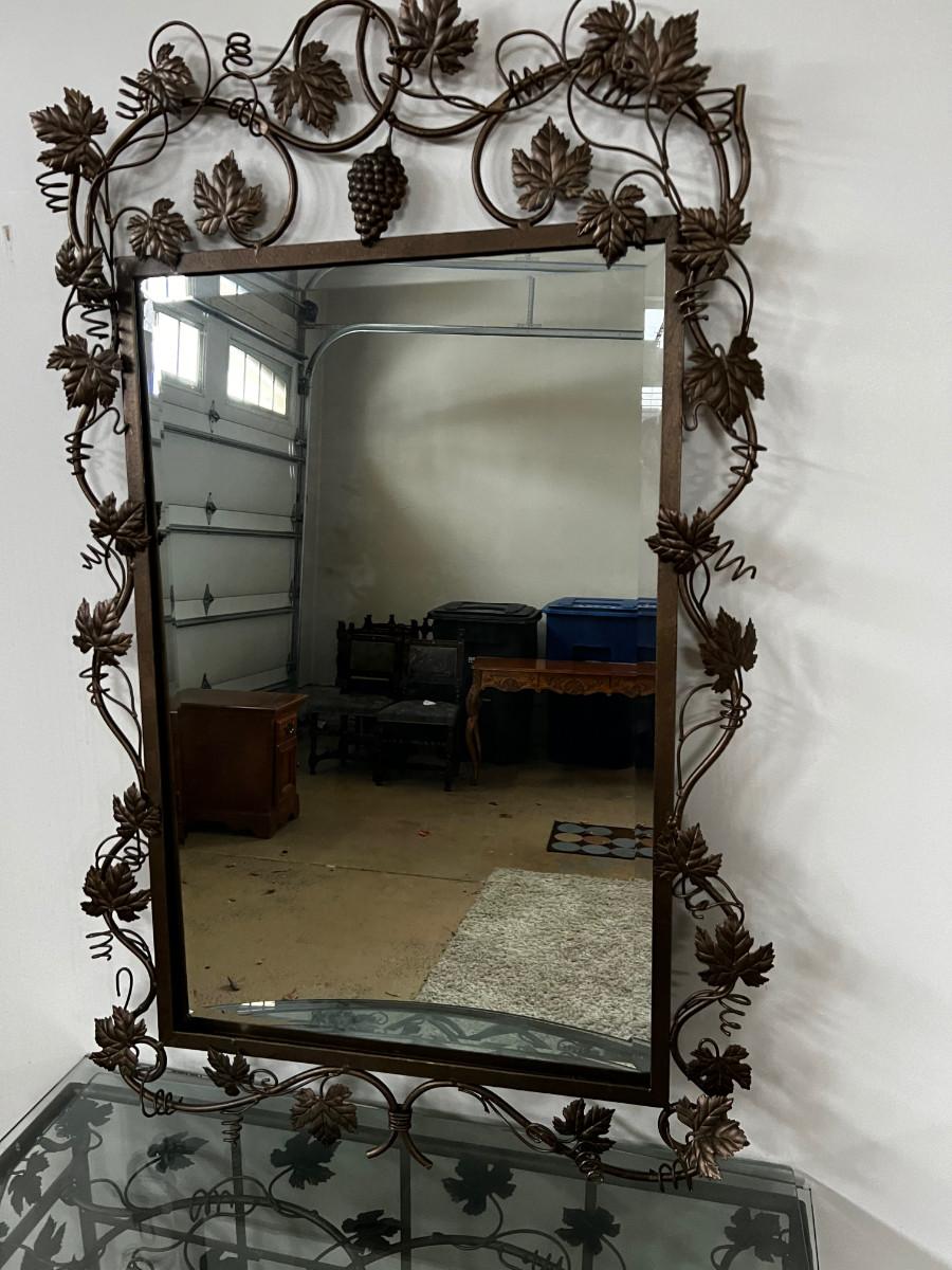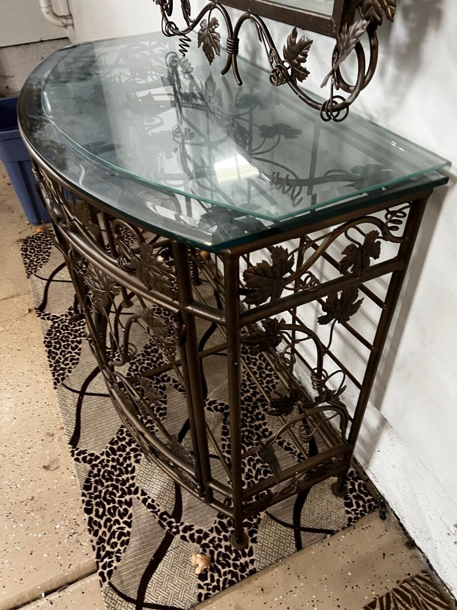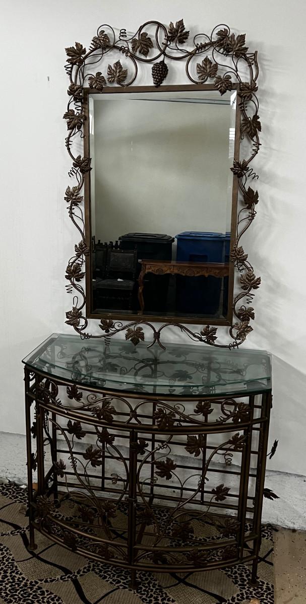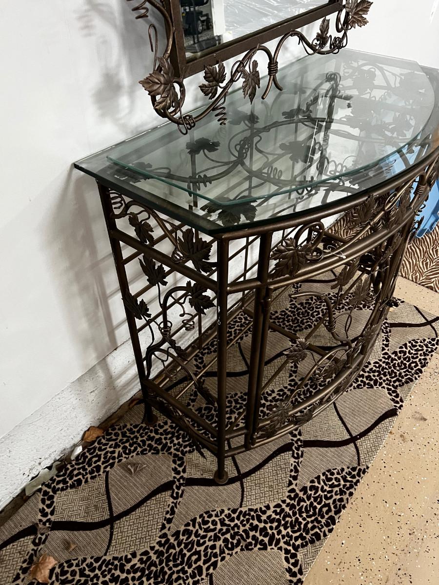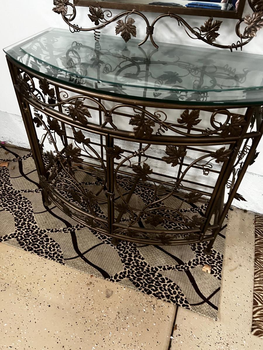 Bronze Color, Glass Top. 34 x 18 x 31" Credenza and mirror 29 x 45 overall. Nice set!