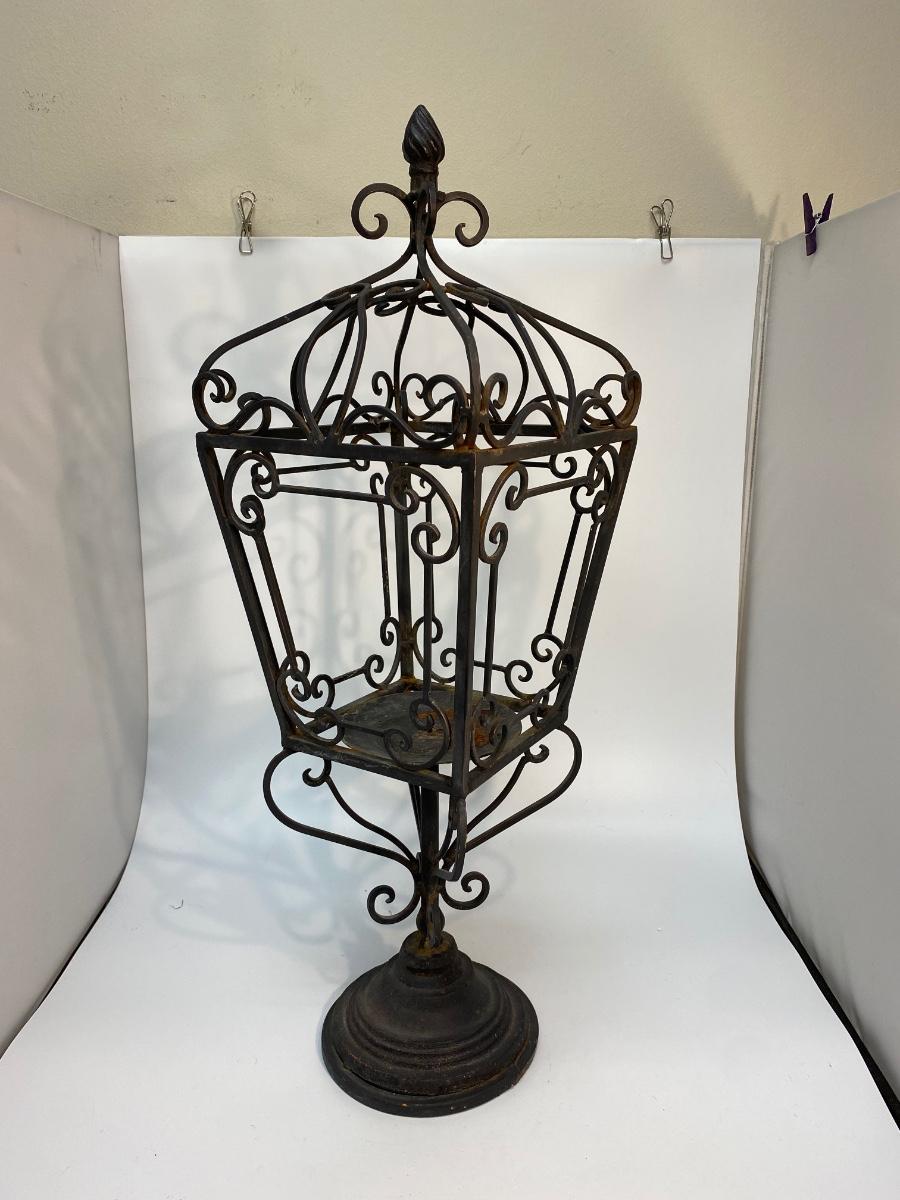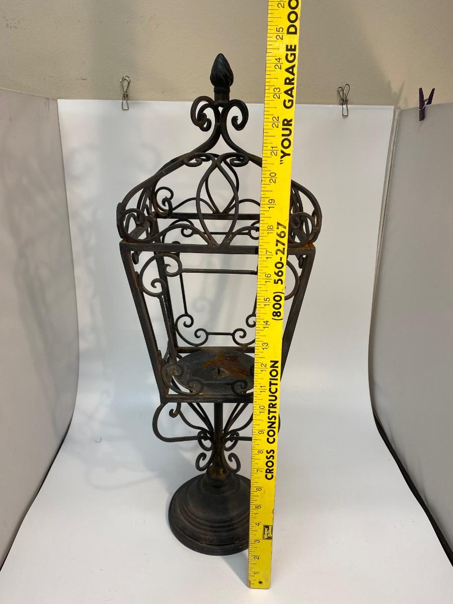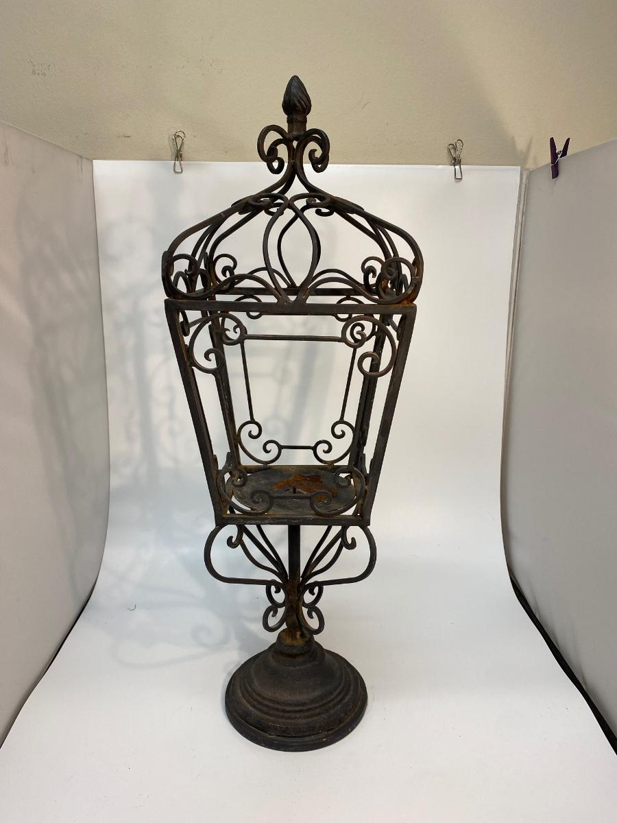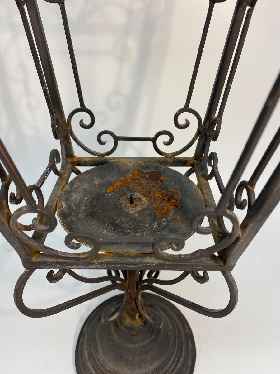 Wrought iron metal lamppost. Open metal work holds a pillar candle in the center. Good, weathered condition. About 24" tall.