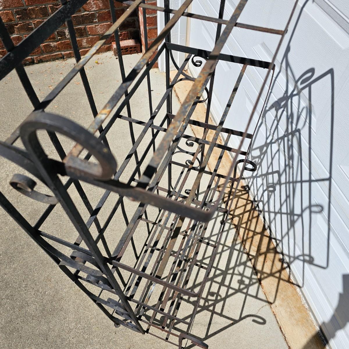 Black wrought iron with five shelves, this decorative piece has swirled ornamentation on the sides and top. Shelves are open grid. Rack measures 15" x 24.5" x 67"H. Light rust and patina. See photos for details. Local pickup only.