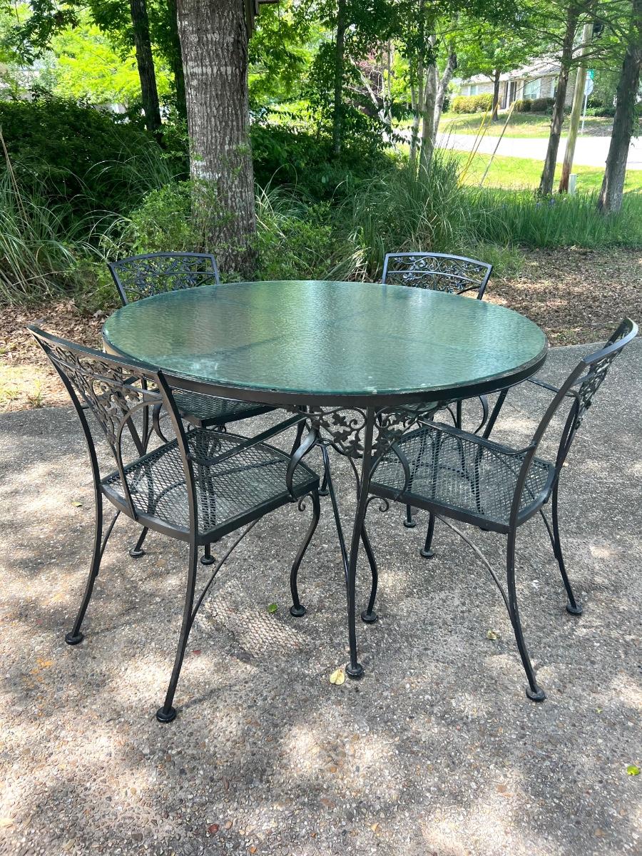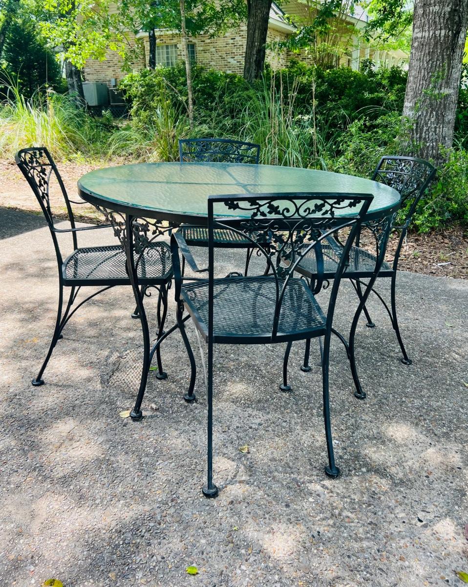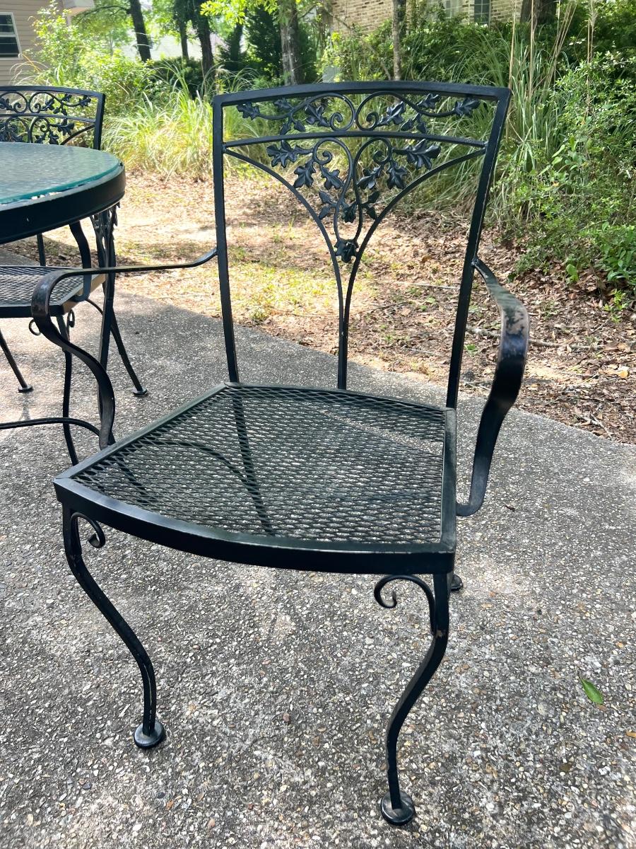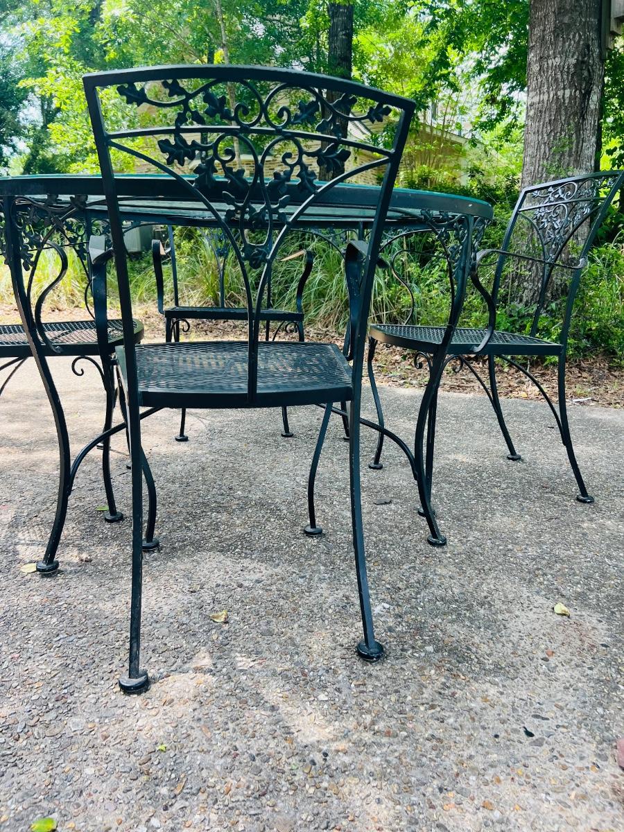 Wrought Iron Outdoor Set Of glass top table and 4 chairs that was used inside. See pictures. Two chairs will need repair(see pictures). The glass does come off for easy moving.