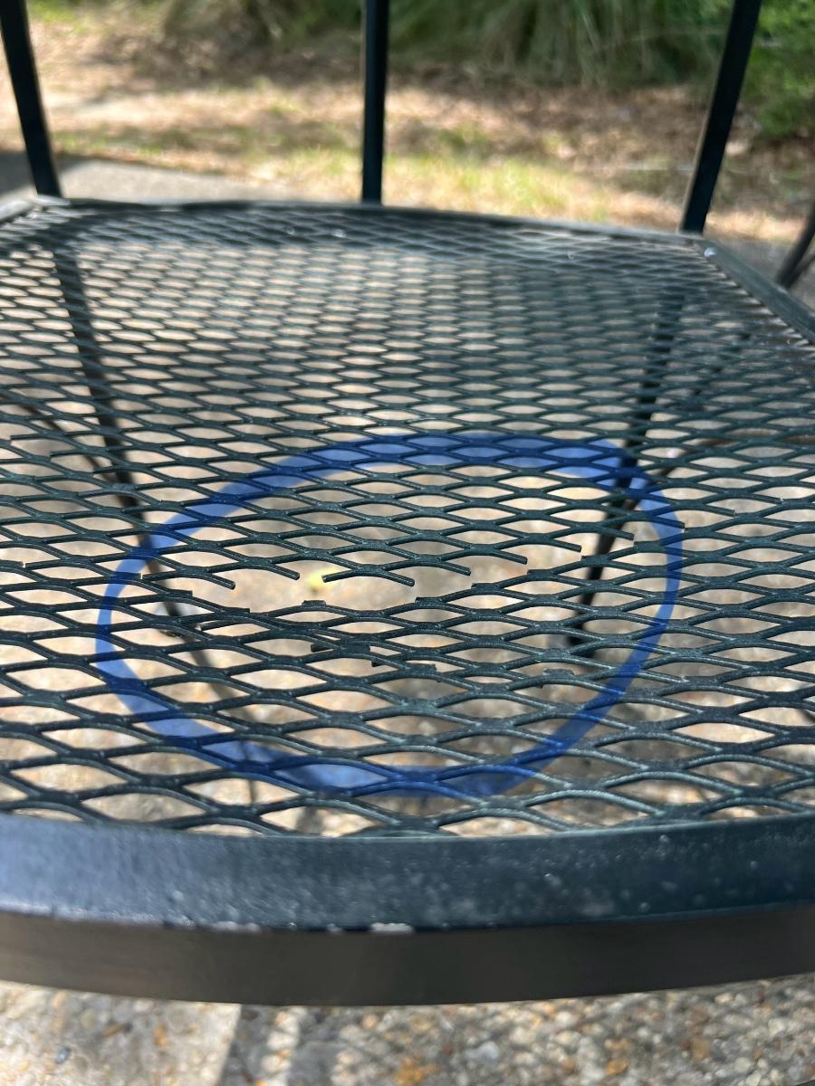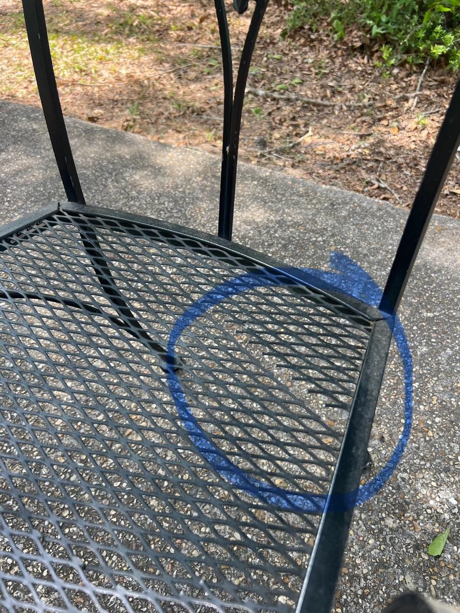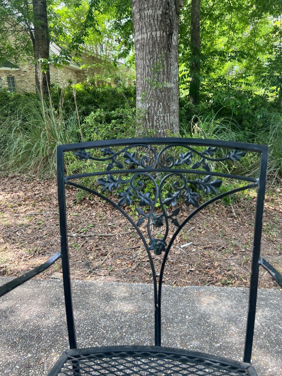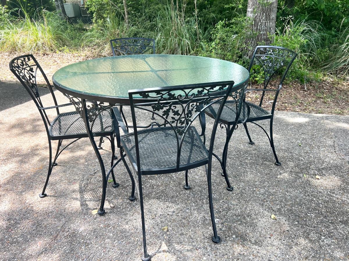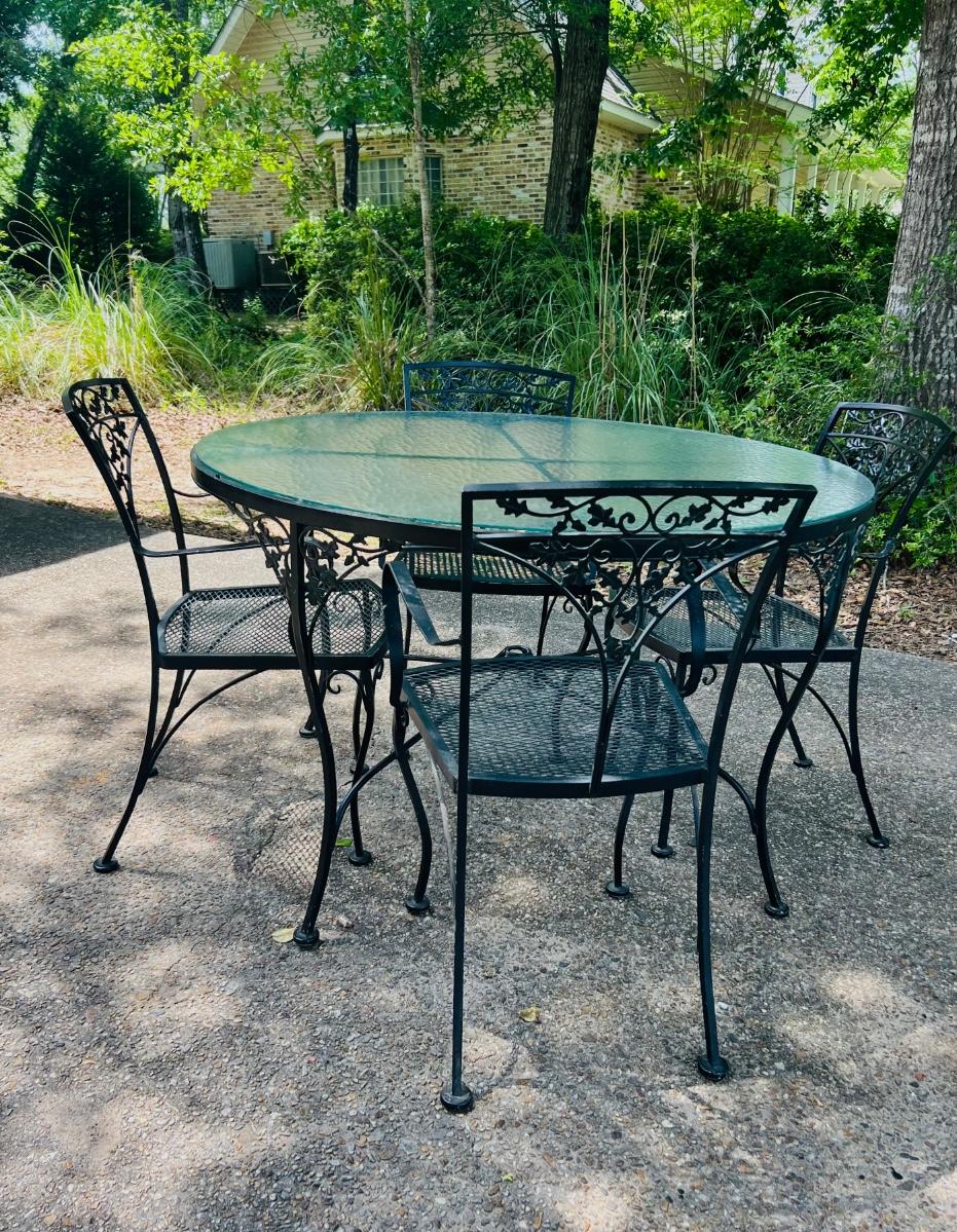 Wrought Iron Outdoor Set Of glass top table and 4 chairs that was used inside. See pictures. Two chairs will need repair(see pictures). The glass does come off for easy moving.