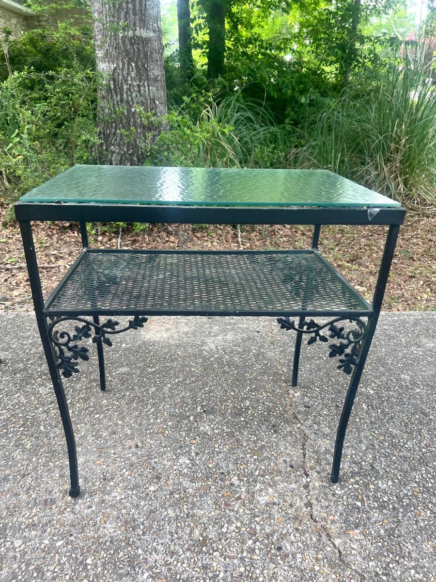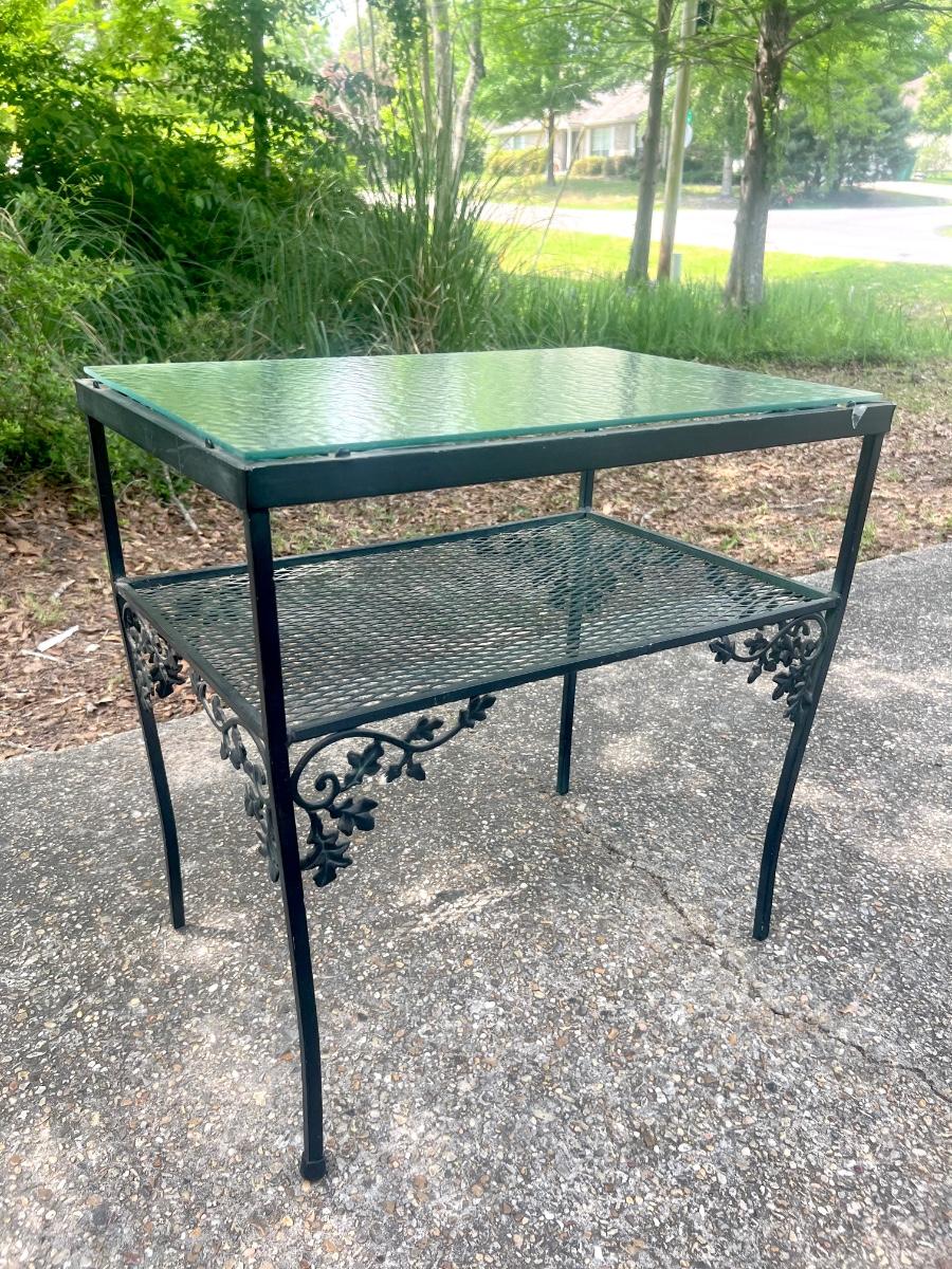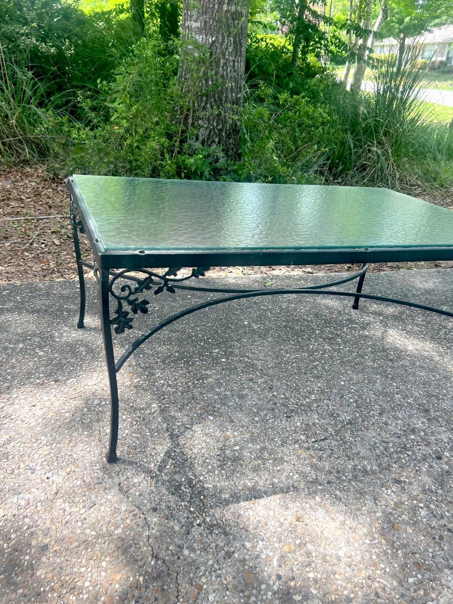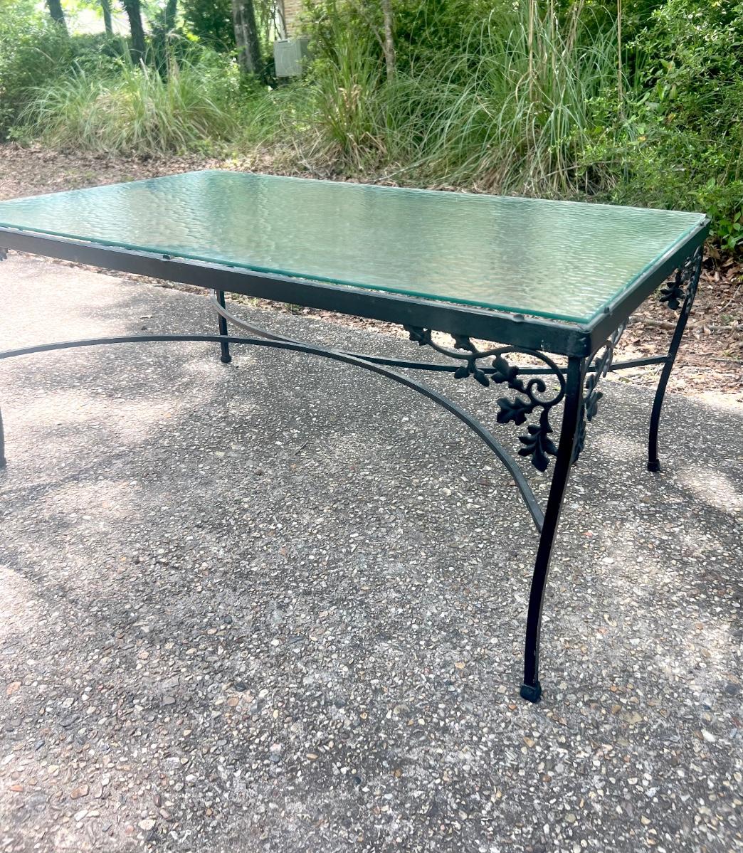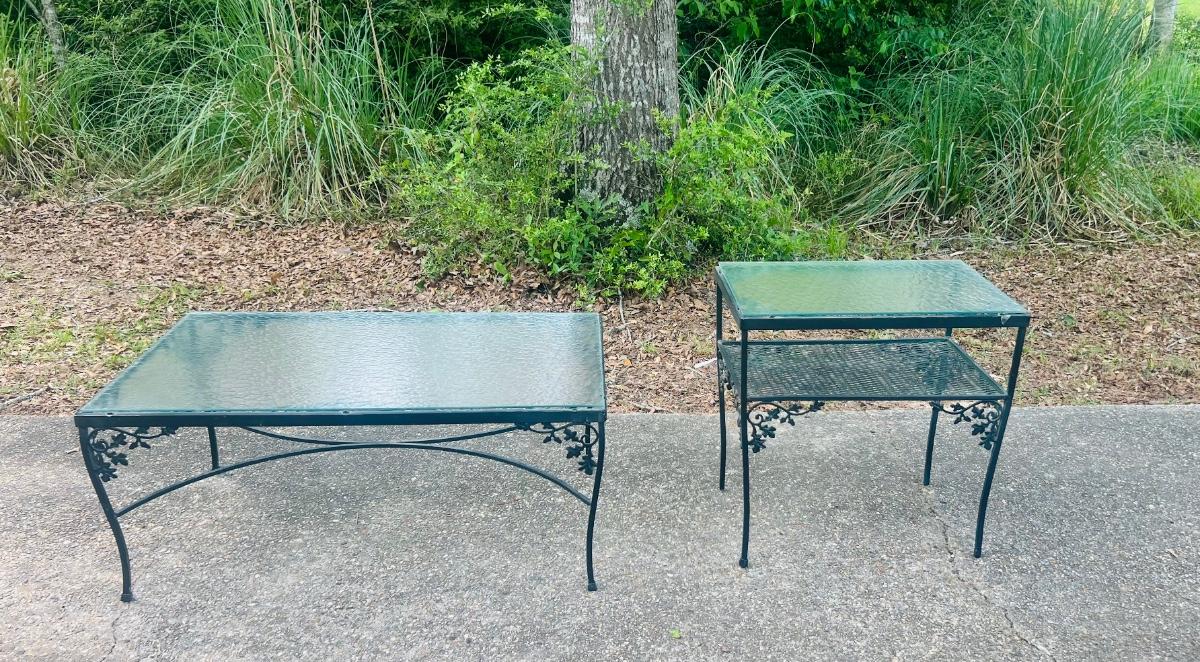 Two Wrought Iron Outdoor Tables with glass tops. These were used inside. Coffee table measures 40 inches long,24 inches wide and 18 inches tall. End table measures 24 inches long, 16 inches wide and 24 inches tall.
