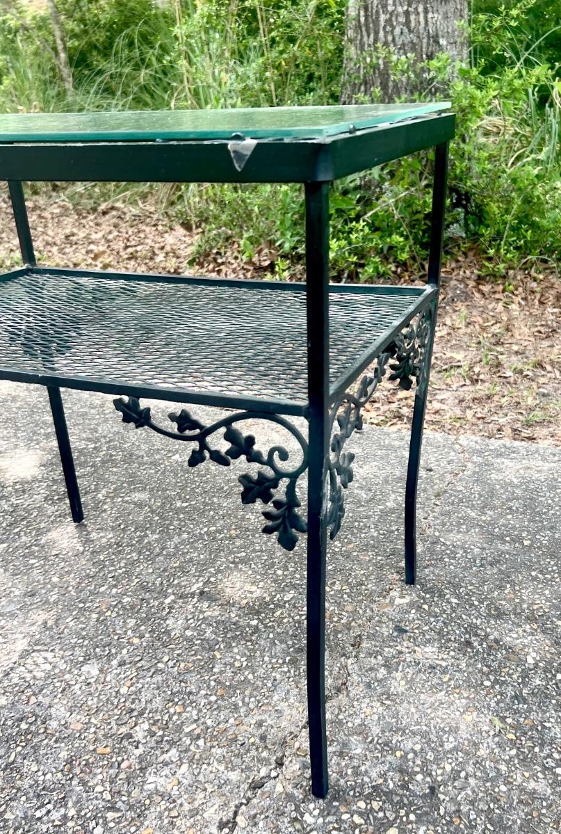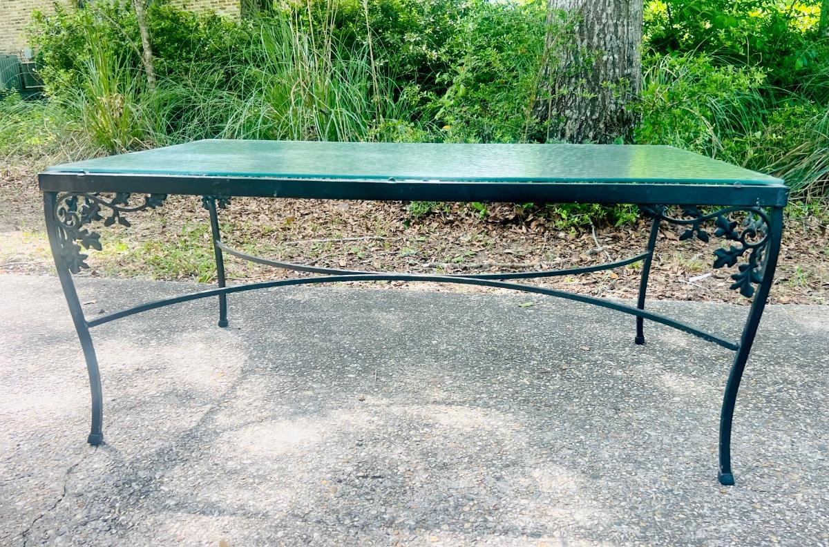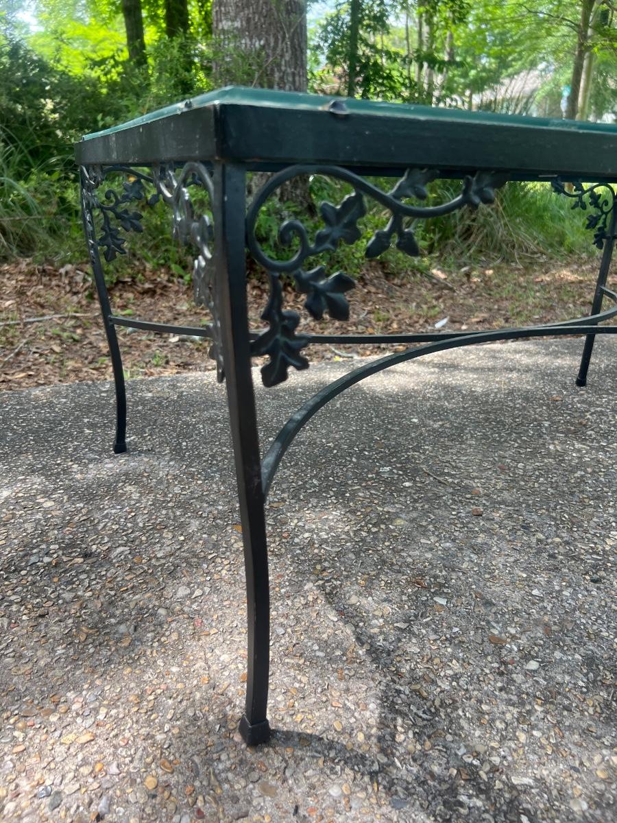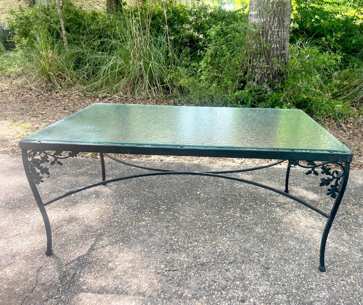 Two Wrought Iron Outdoor Tables with glass tops. These were used inside. Coffee table measures 40 inches long,24 inches wide and 18 inches tall. End table measures 24 inches long, 16 inches wide and 24 inches tall.