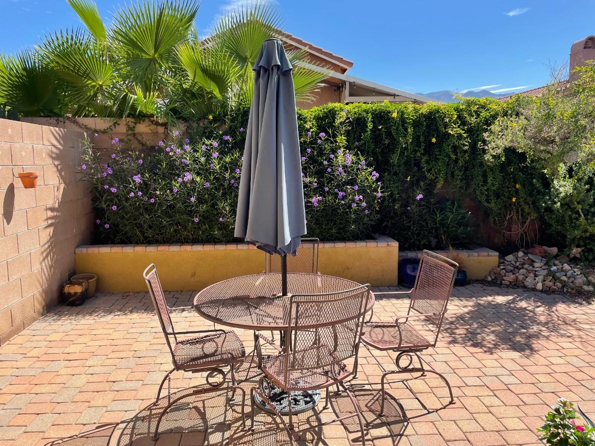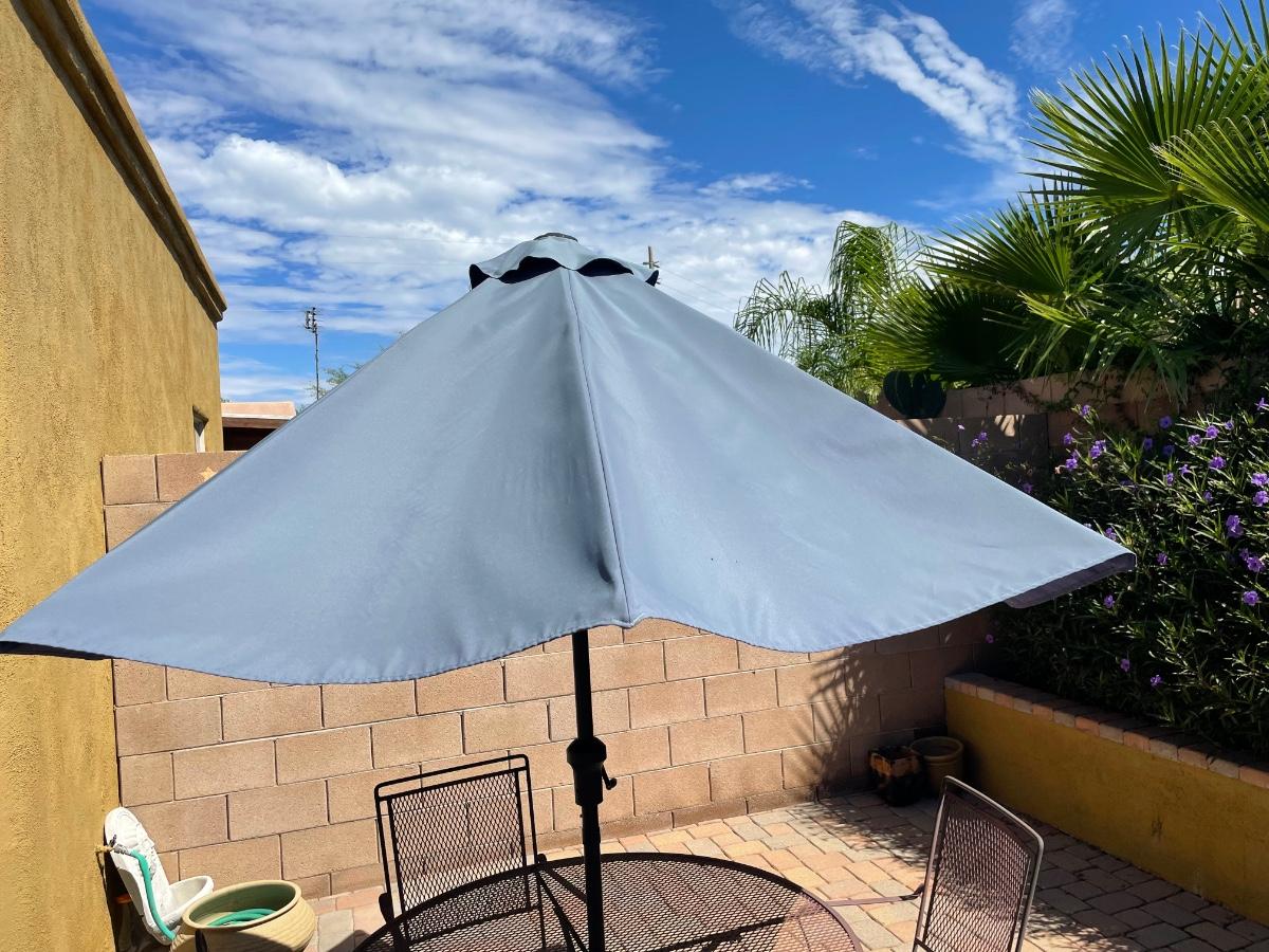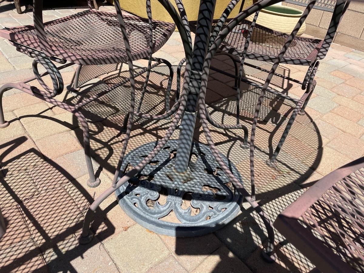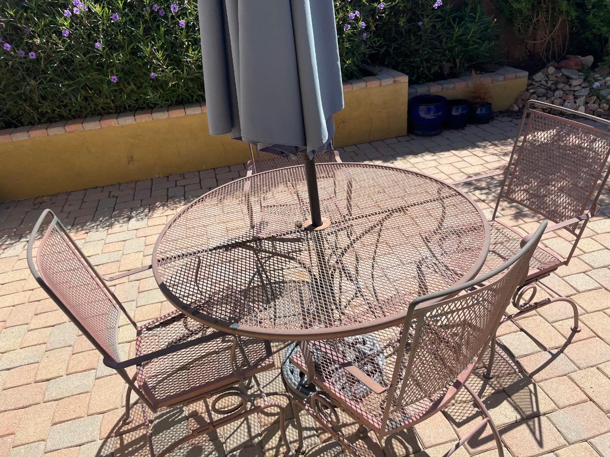 Wrought iron set table with four chairs includes umbrella with stand in good condition. Umbrella in good condition, no rips or tears. (4 feet diameter)