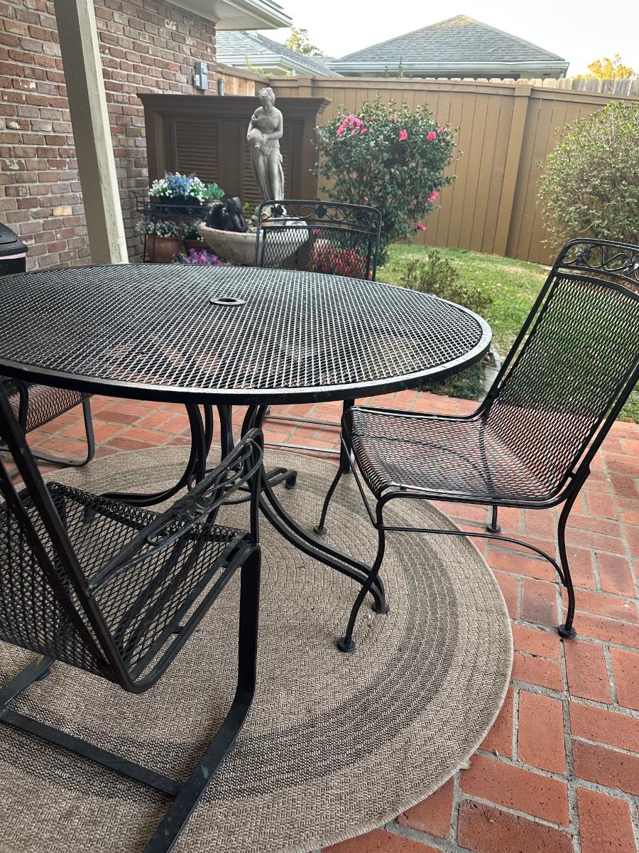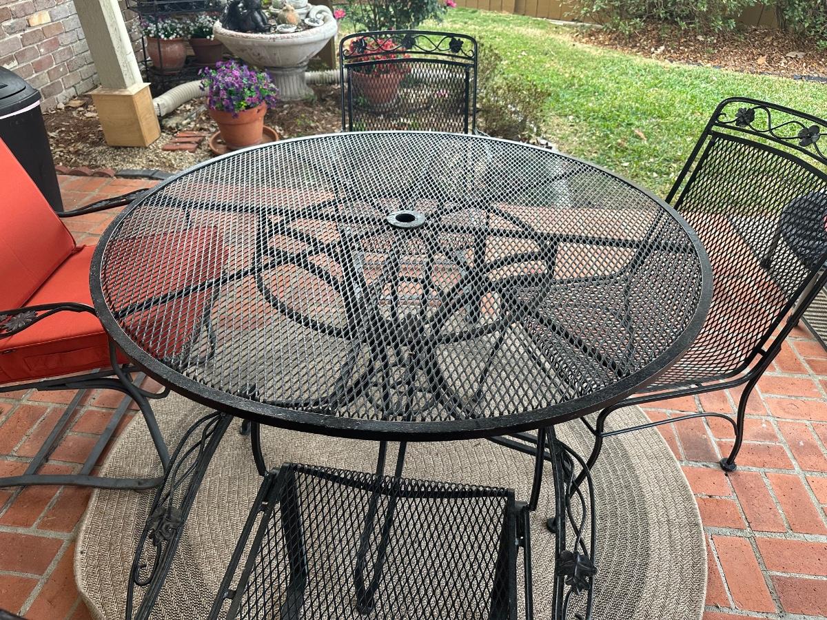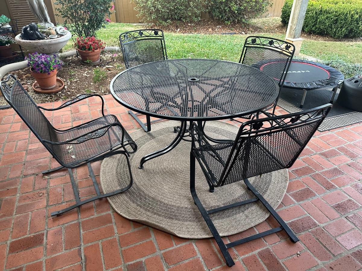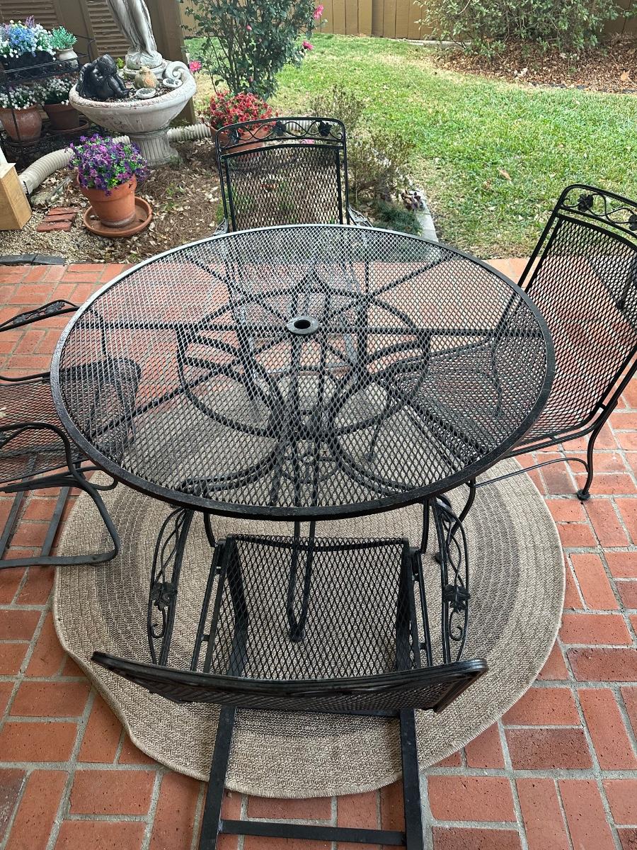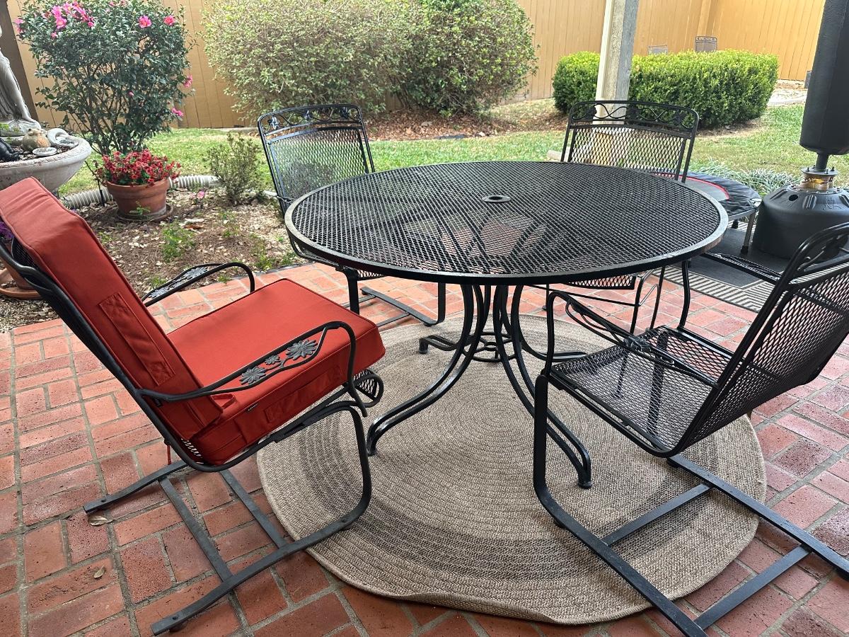 Black wrought iron outdoor patio set with four chairs. Includes one standard chairs and three spring-base chairs. Table has an umbrella hole and a sturdy curved-iron base. Comes with seat cushions for all, like new.