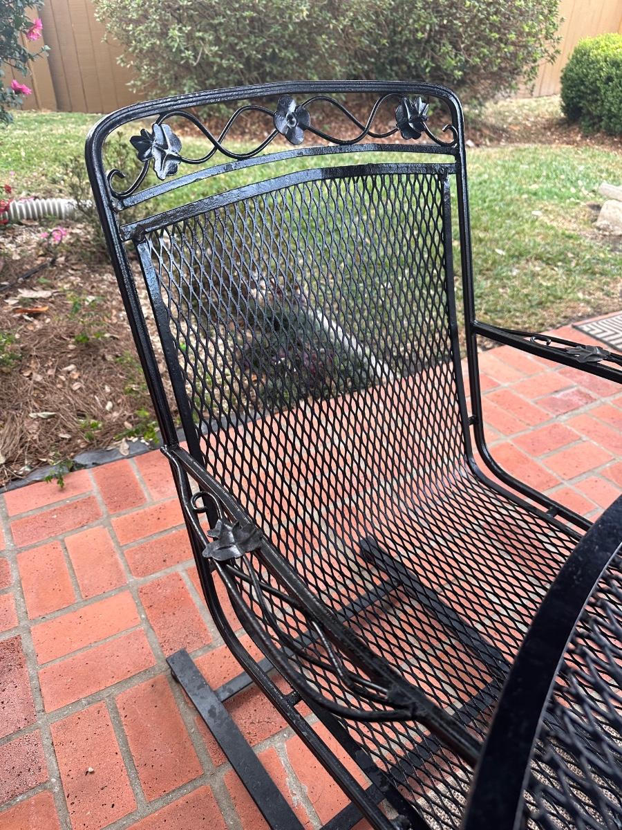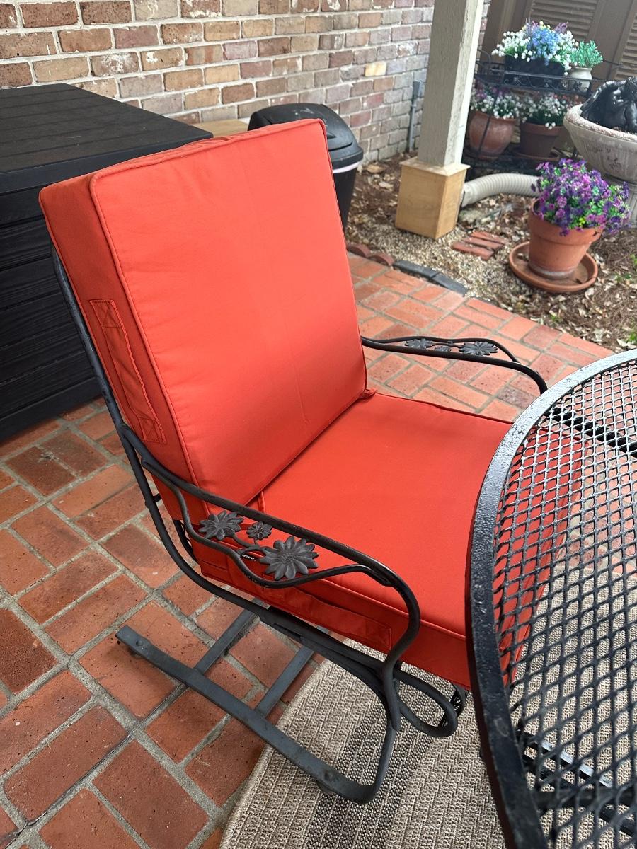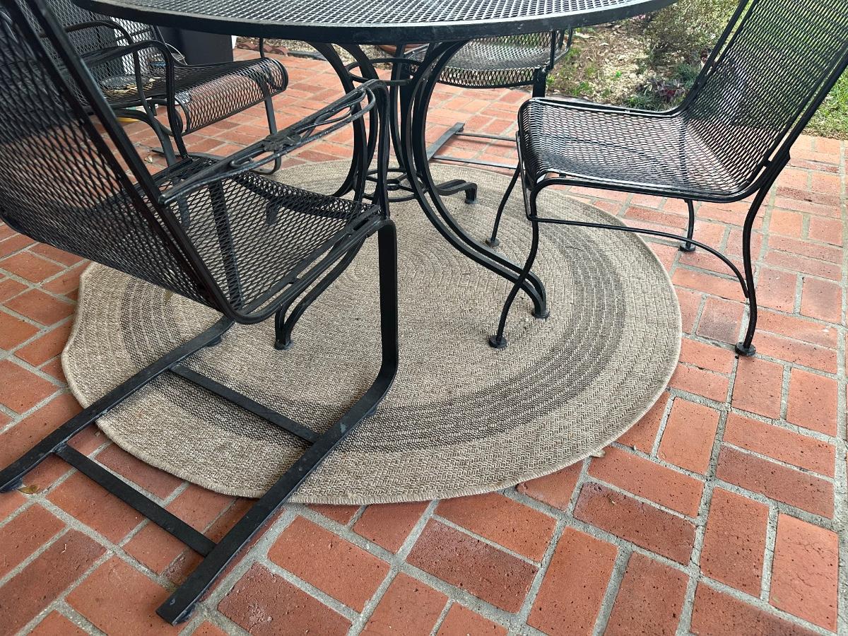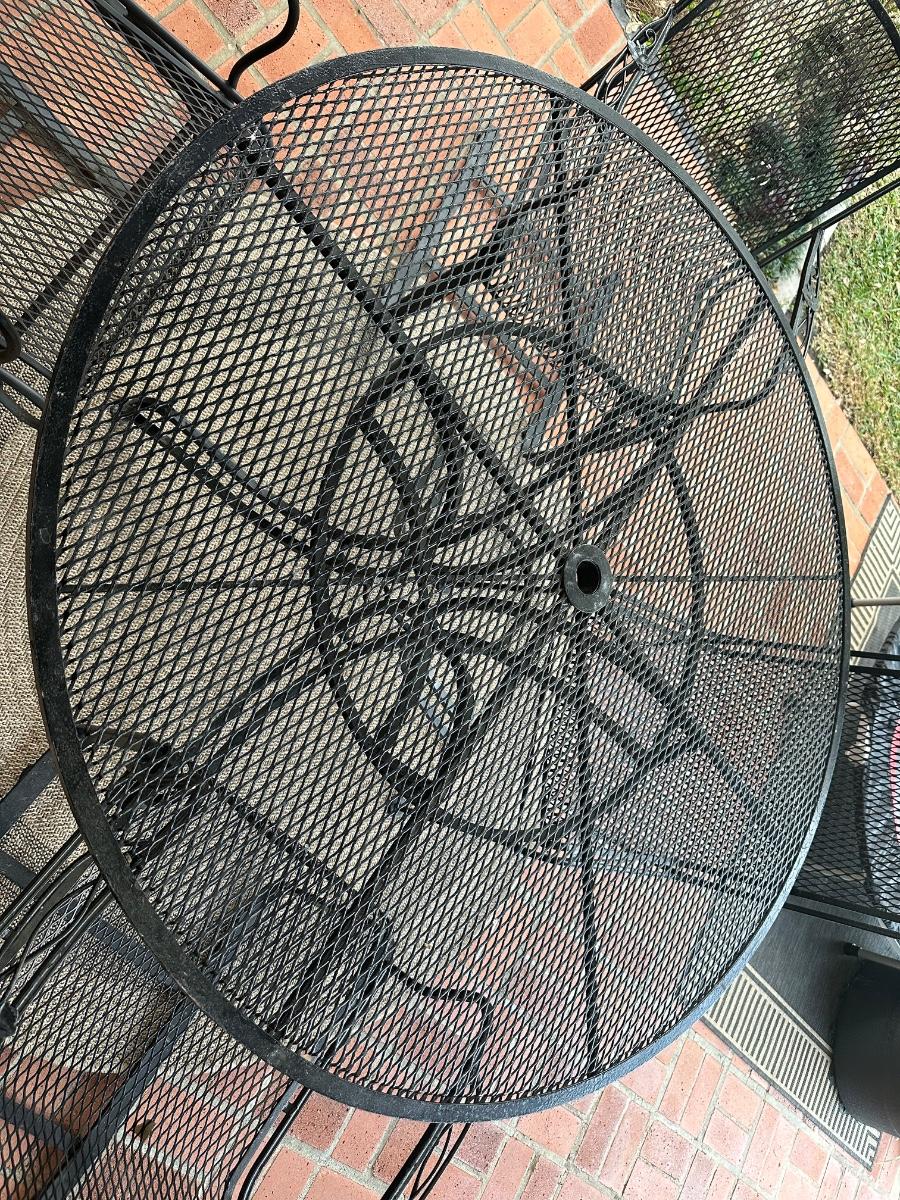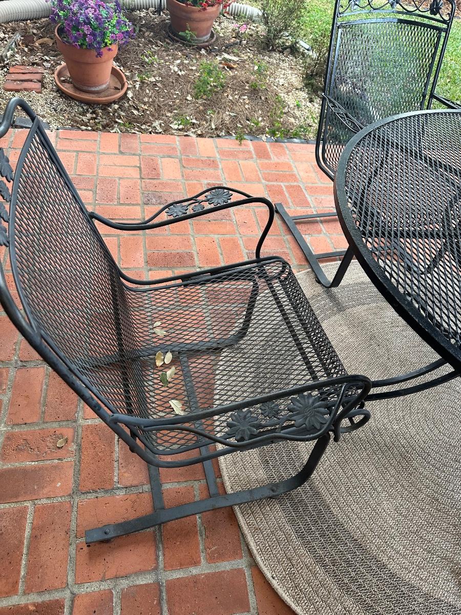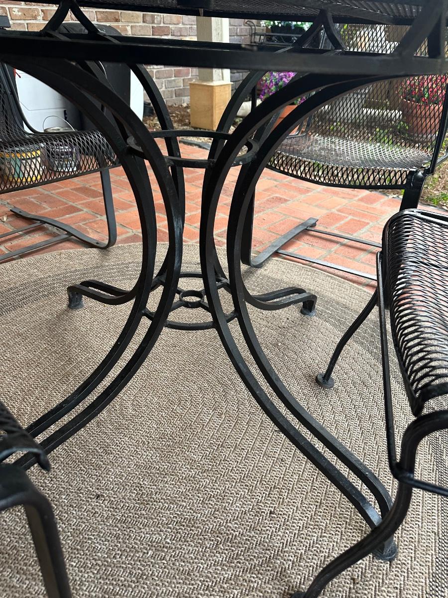 Black wrought iron outdoor patio set with four chairs. Includes one standard chairs and three spring-base chairs. Table has an umbrella hole and a sturdy curved-iron base. Comes with seat cushions for all, like new.