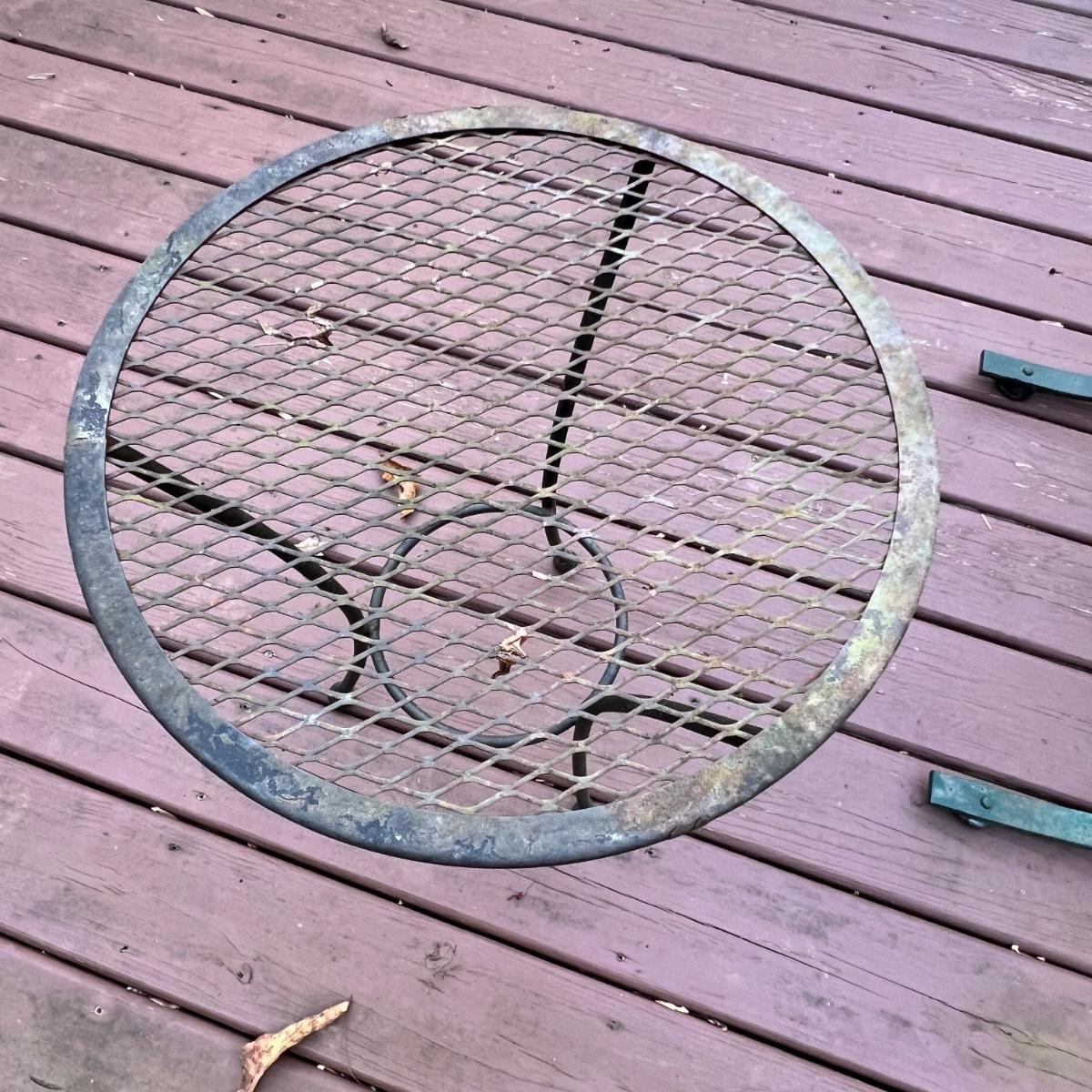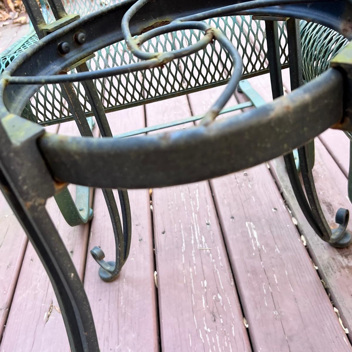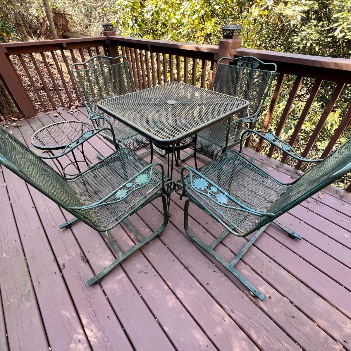 These tables and chairs vary in color with the chairs being green and the tables black. All pieces have areas with surface rust, see photos. The chairs have a pleasant, gentle rock to them. Table has a hole for an umbrella.