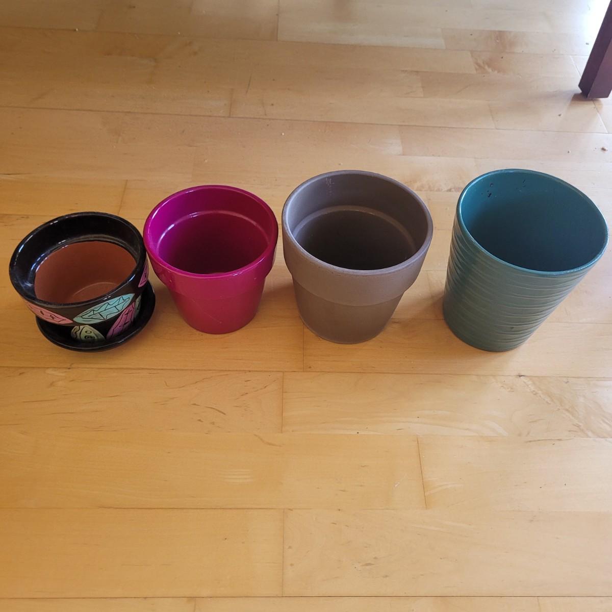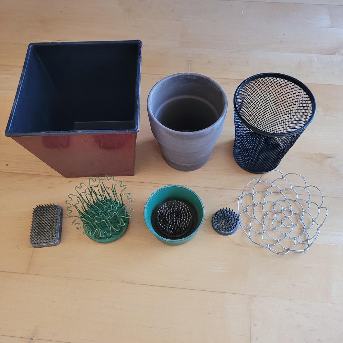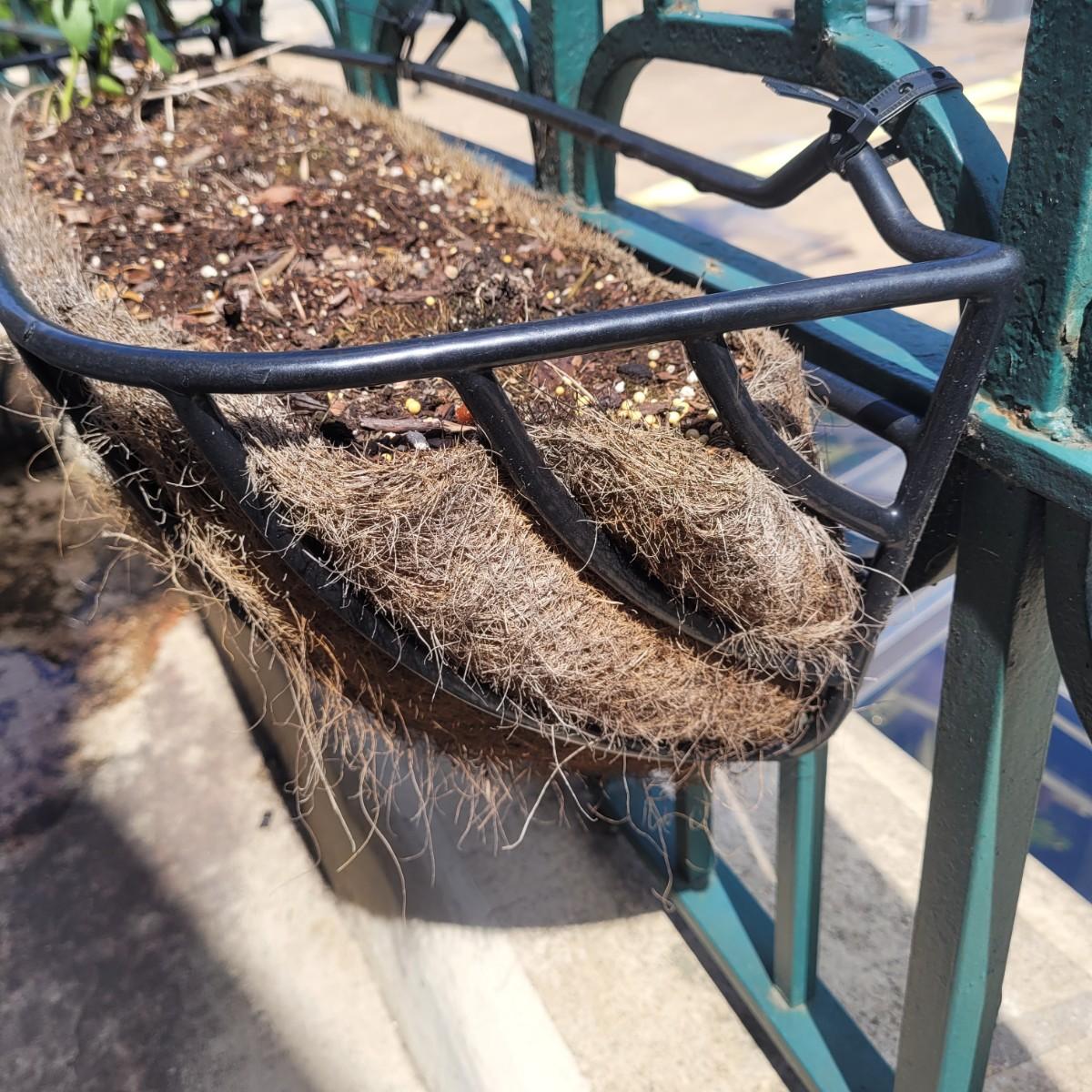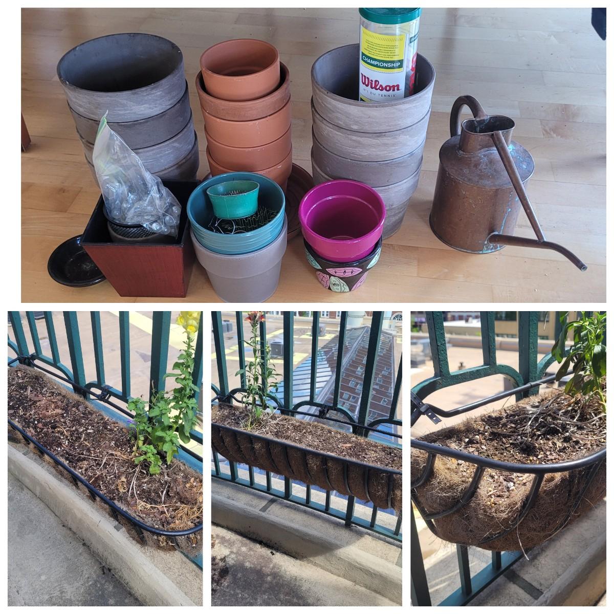 This lot includes three large iron planters and miscellaneous porch garden items. There are two different sizes of planters. The largest planter measures 36" x 10" x 10"H. The other two are the same shape but a bit smaller. The planters have been emptied of soil and peat and removed from the railing. The garden items include ceramic pots, frogs (flower arrangers), metal watering can, decorative marbles, and drip trays. See photos for more item detail.