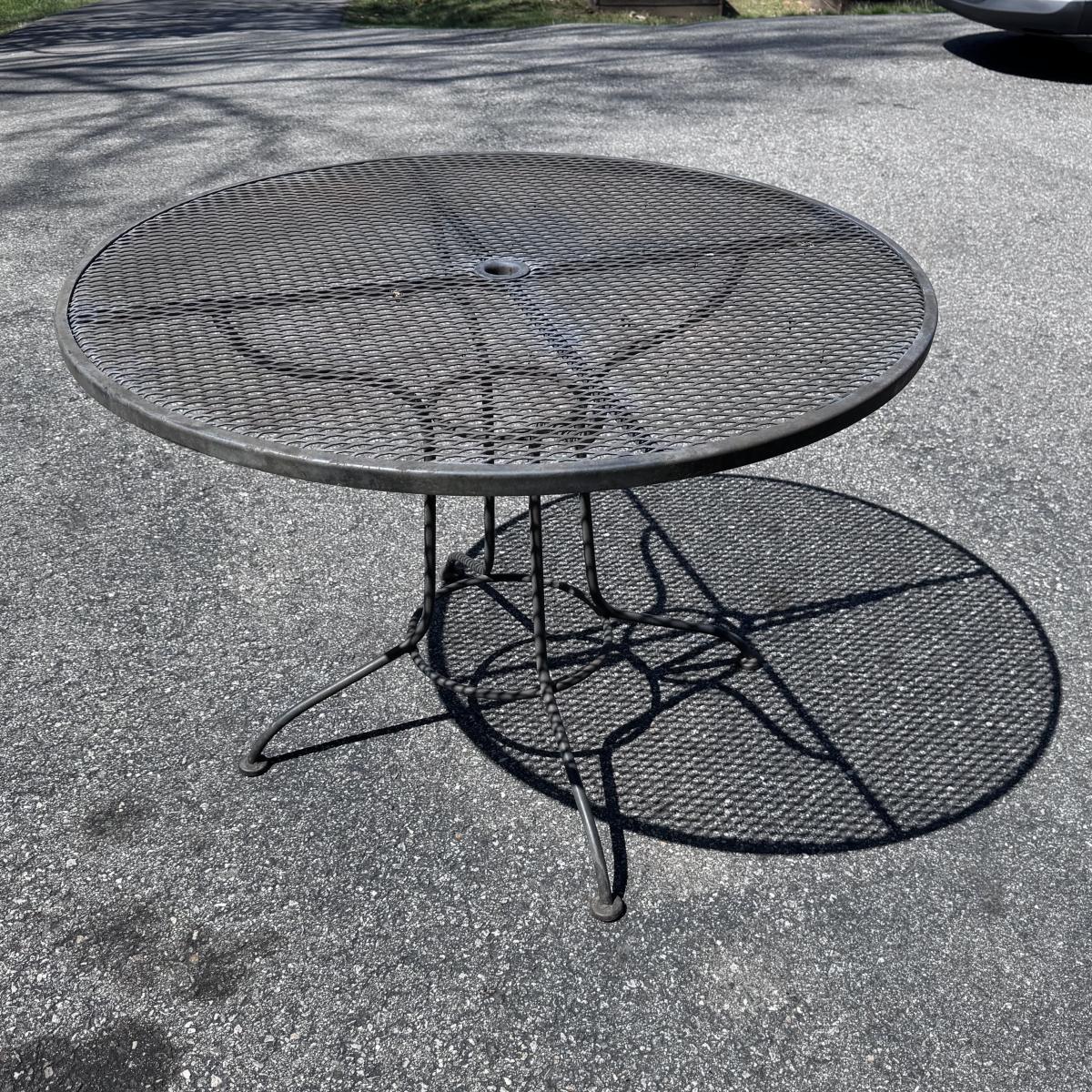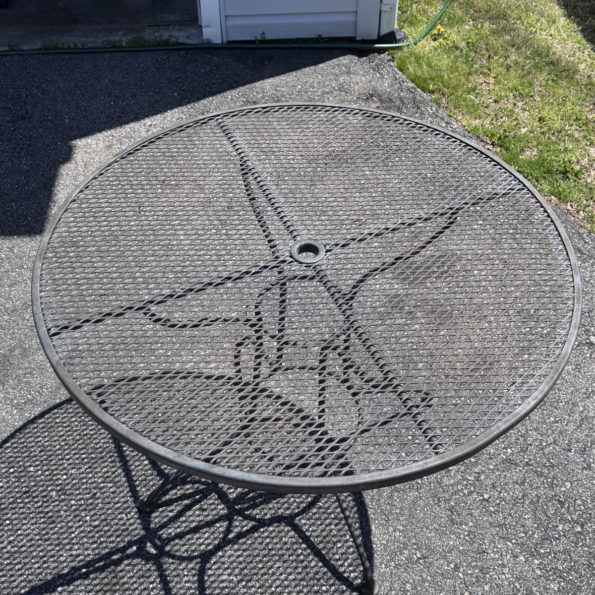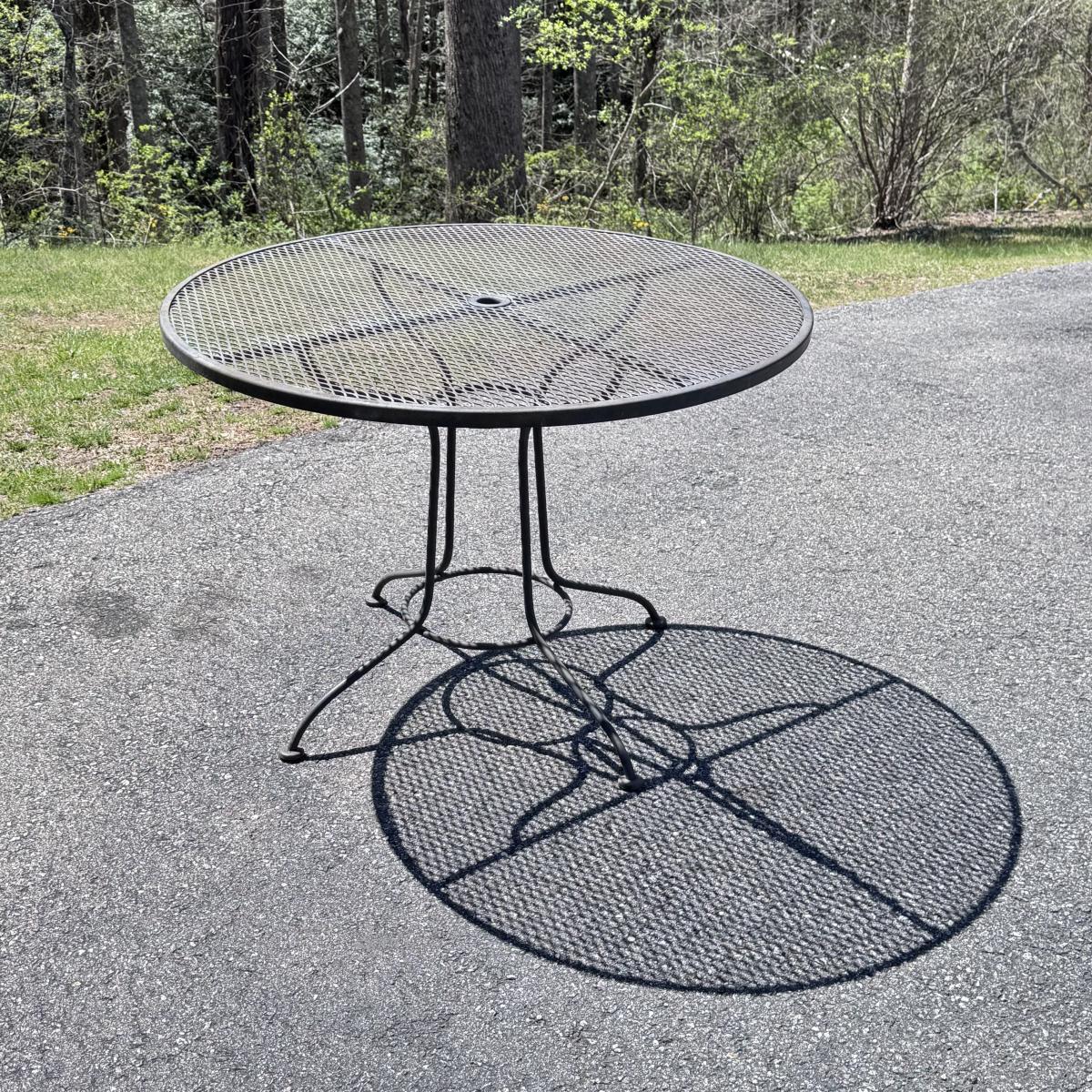 This lot includes one round wrought iron patio table. The table measures 41”D x 29”H. Local pickup only. Winning bidder must bring assistance to help move and load this item due to its weight and/or size.