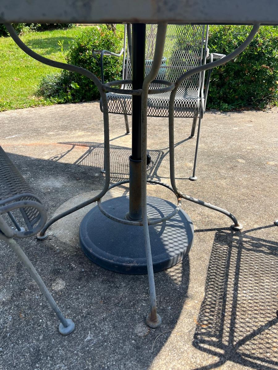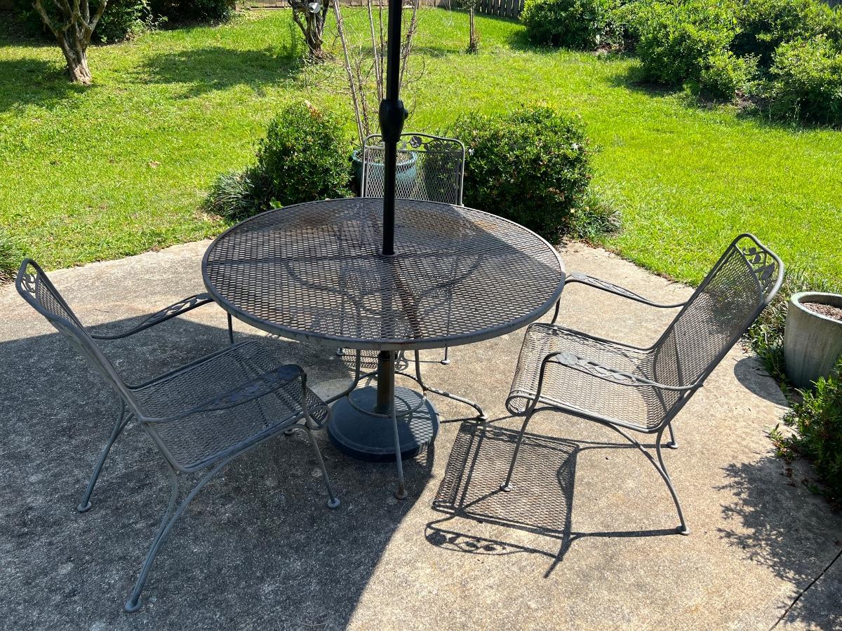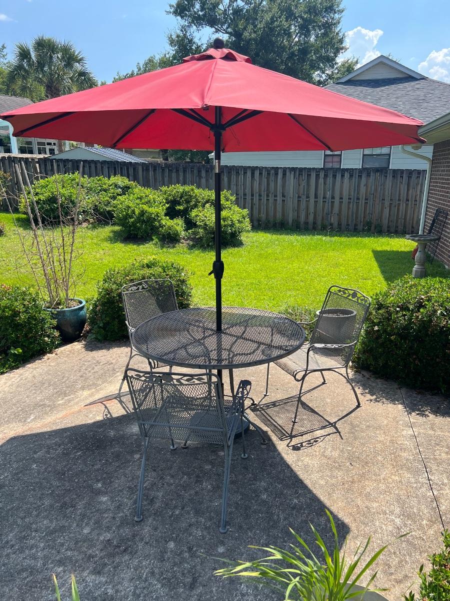 Table and chairs could use a fresh coat of paint. Table is 48”W x 29”T. Umbrella is in great shape.