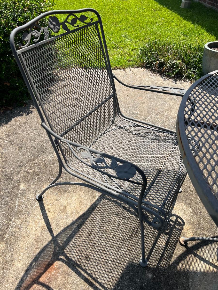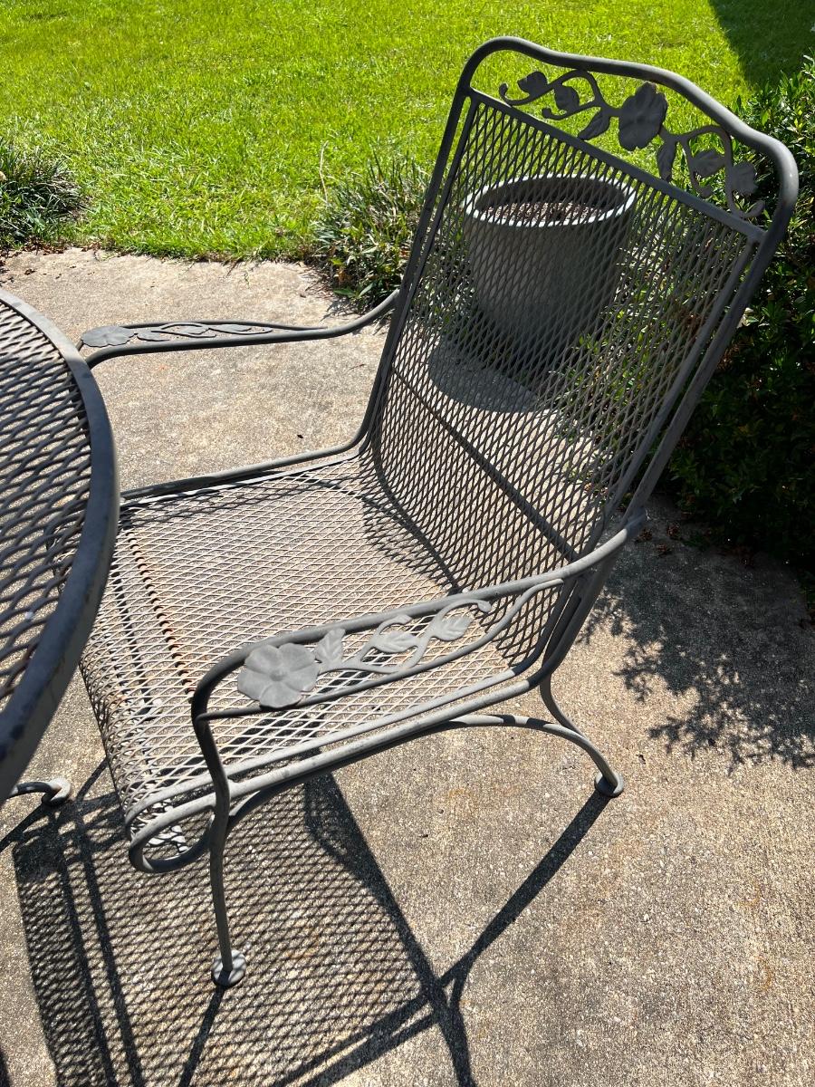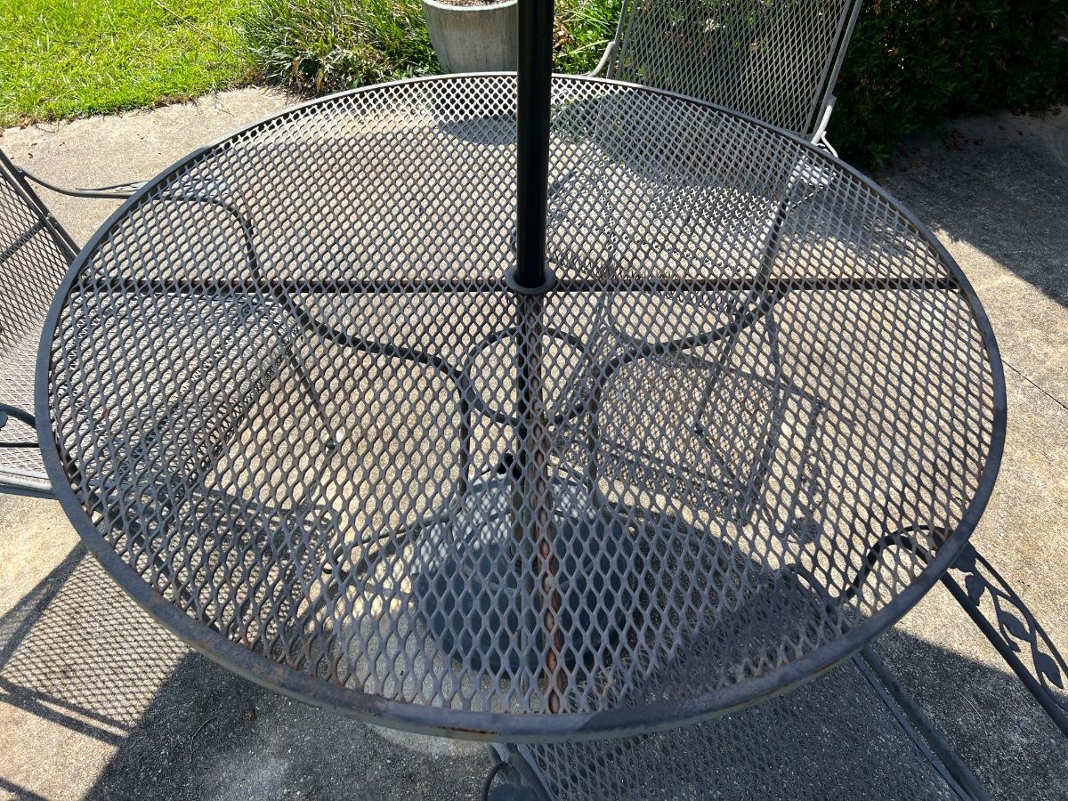 Table and chairs could use a fresh coat of paint. Table is 48”W x 29”T. Umbrella is in great shape.