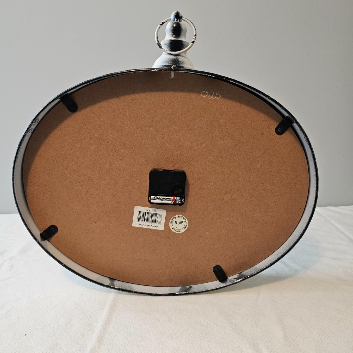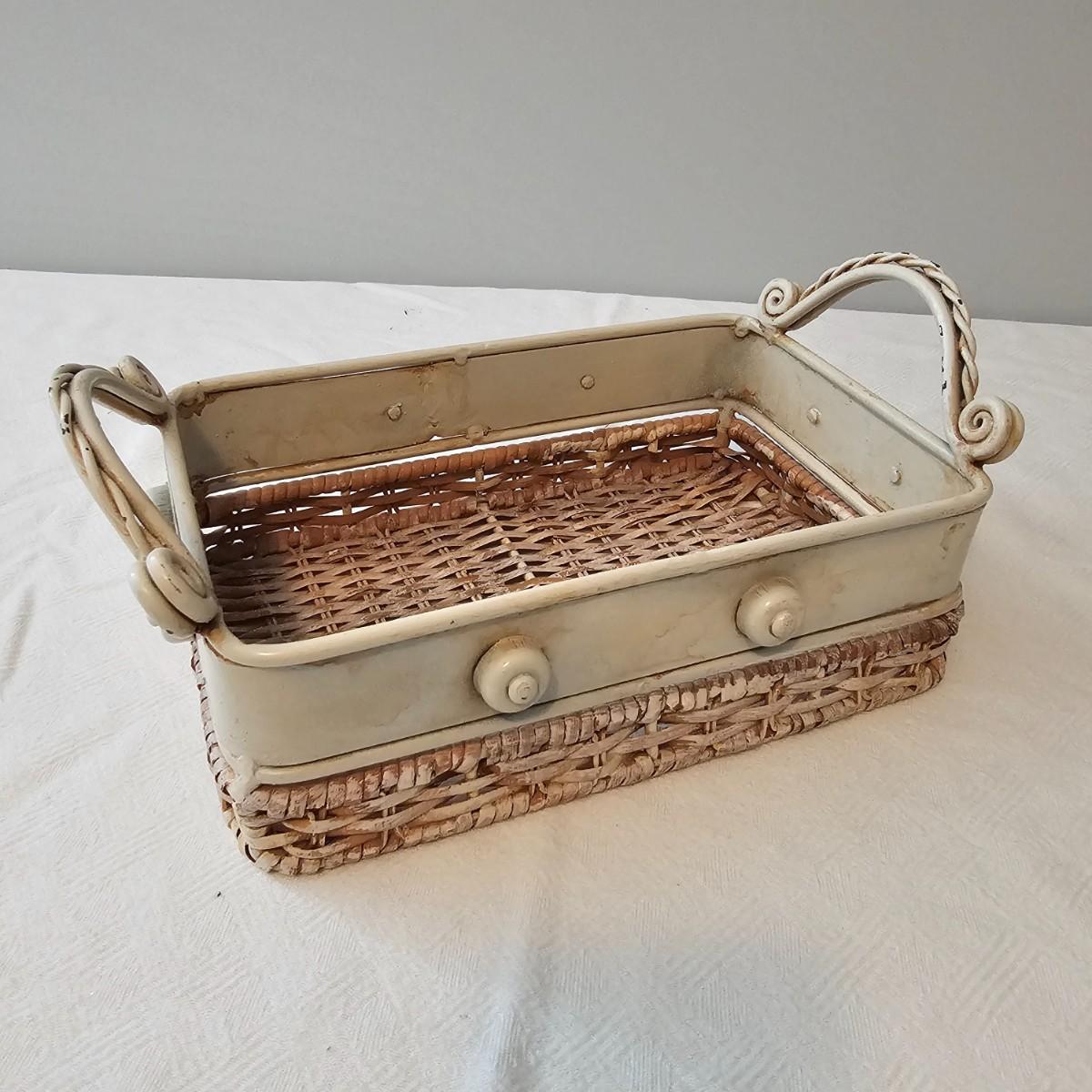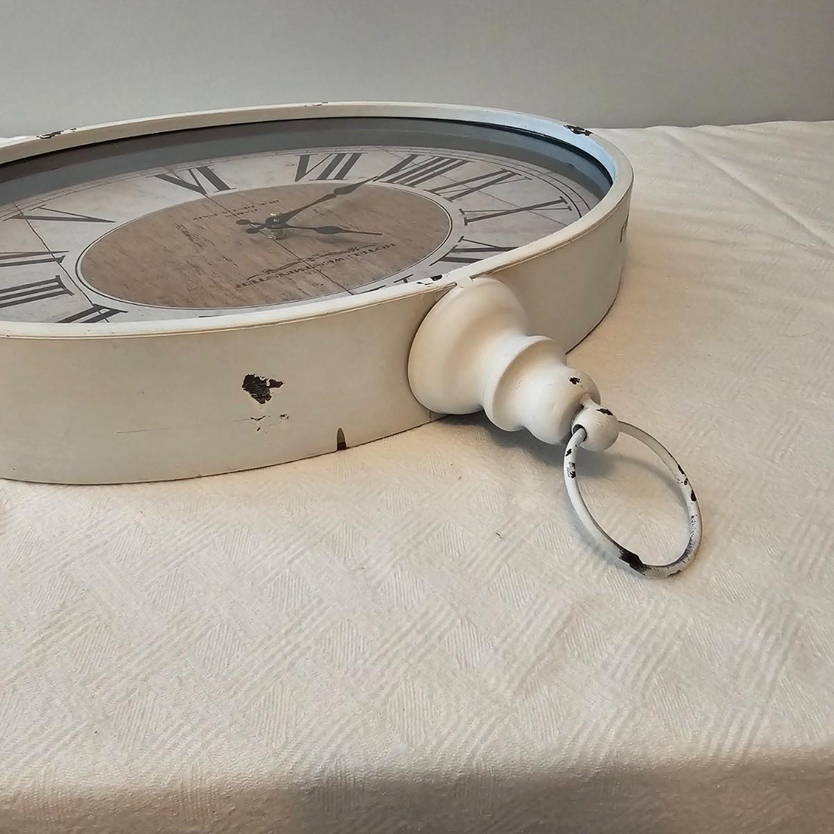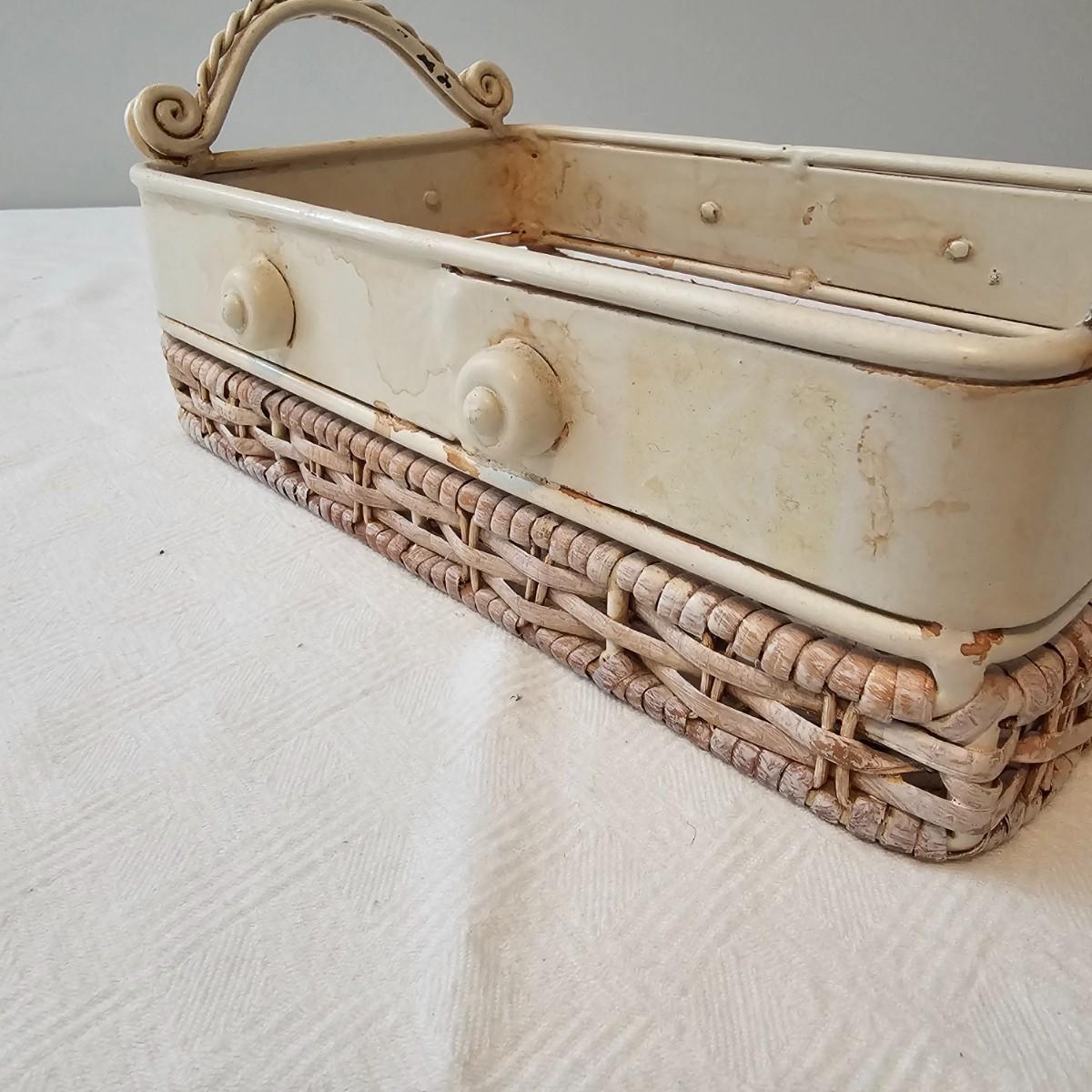 Antique white finish on this table and carry tray. Wicker tops and insides on both of these items. Decorative sides and edges. Table measures 21" x 13" x 21"H, carry piece is 11.5" x 8.5" x 5.5"H. Oval clock has large Roman numerals and distressed paint finish and was not tested as appears to need battery. Clock has hanging ring at top. 18" x 3" x 17"H. Also included is a small glass lidded bowl with leaf motif, 4"Dia x 5"H. See photos for details. Local pickup only.