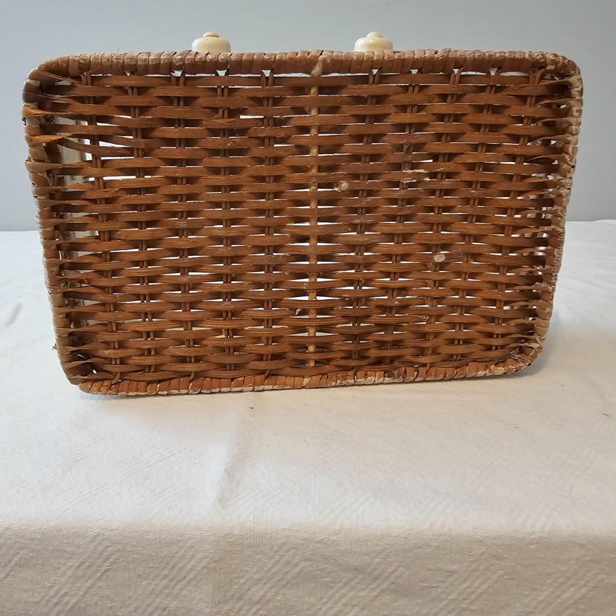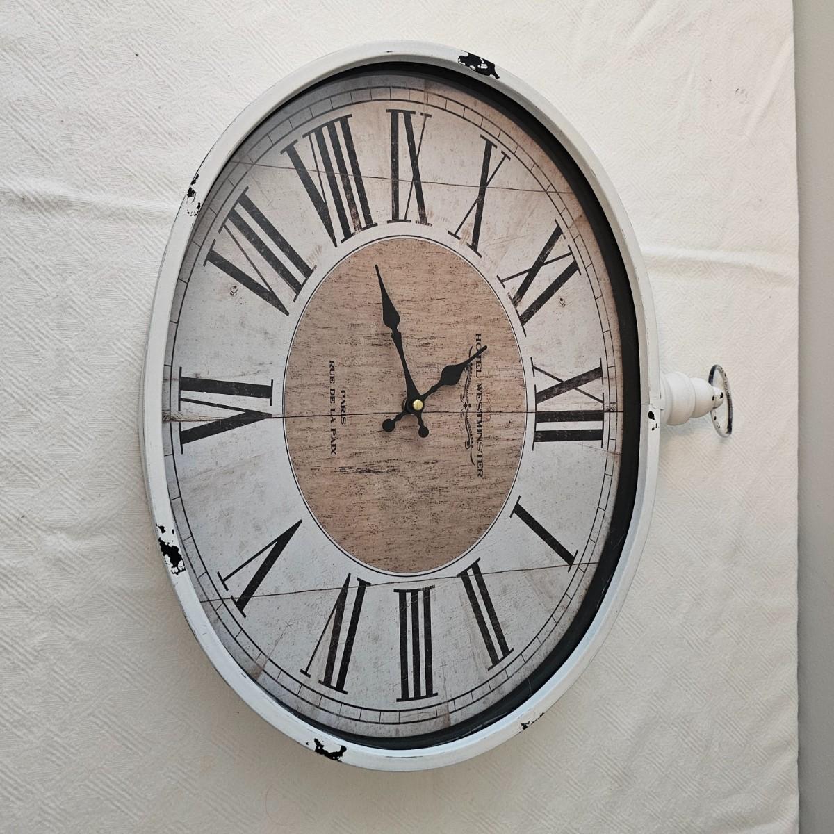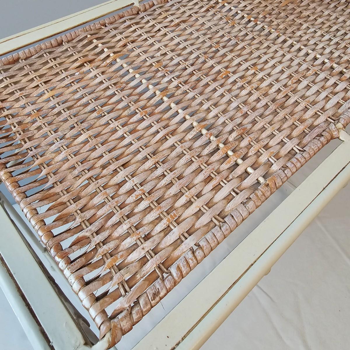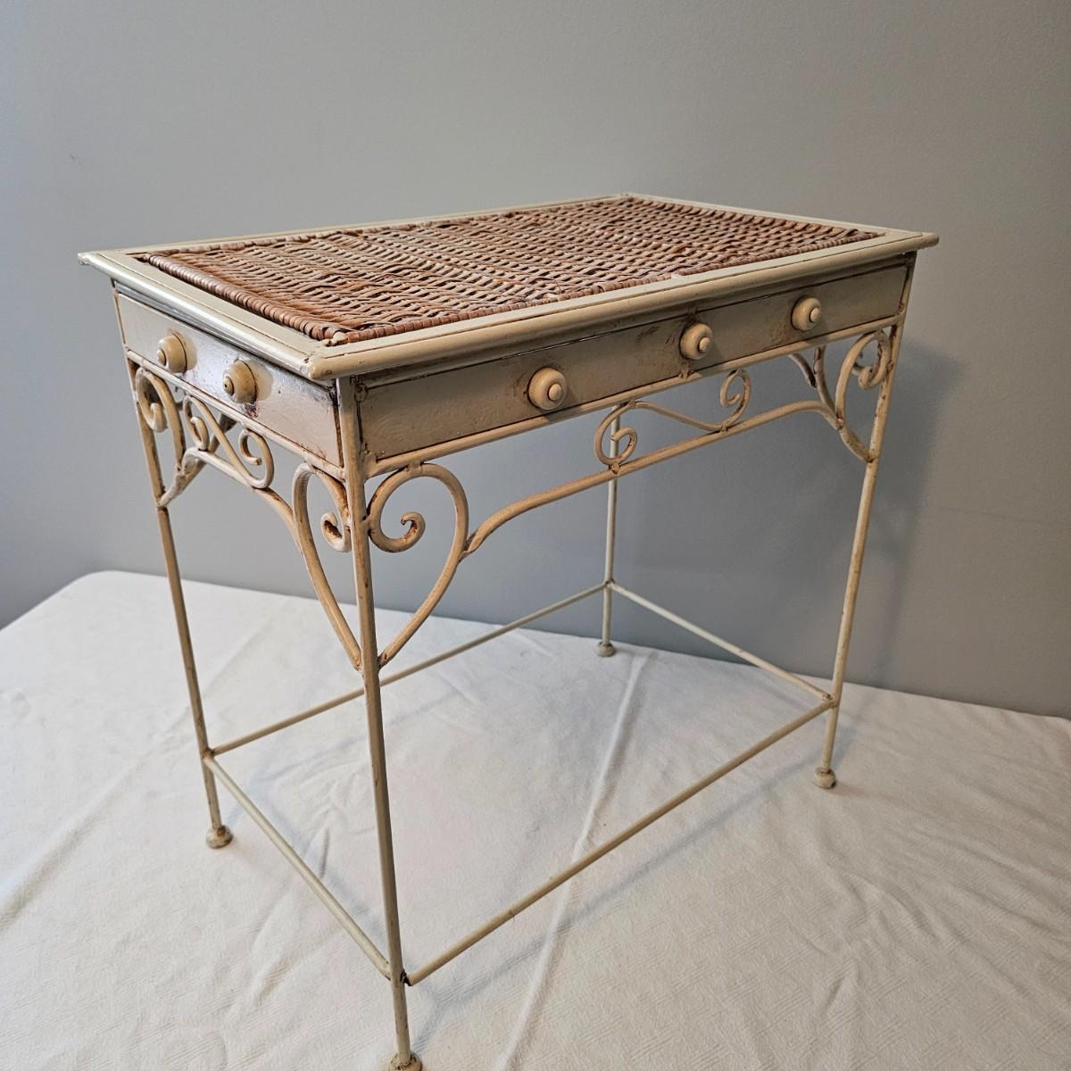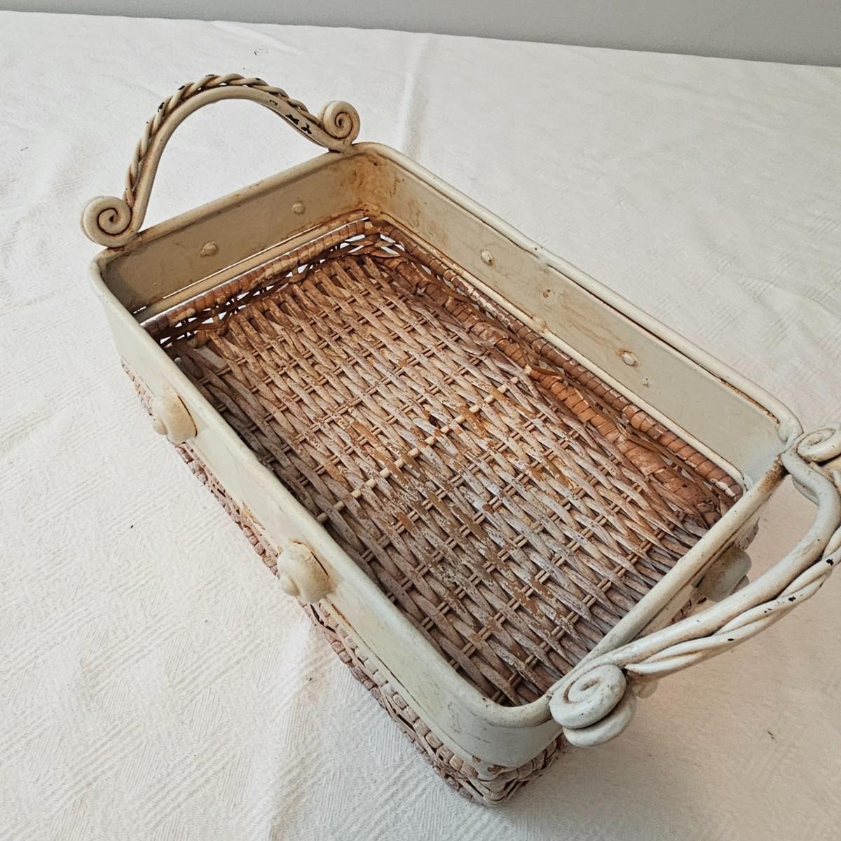 Antique white finish on this table and carry tray. Wicker tops and insides on both of these items. Decorative sides and edges. Table measures 21" x 13" x 21"H, carry piece is 11.5" x 8.5" x 5.5"H. Oval clock has large Roman numerals and distressed paint finish and was not tested as appears to need battery. Clock has hanging ring at top. 18" x 3" x 17"H. Also included is a small glass lidded bowl with leaf motif, 4"Dia x 5"H. See photos for details. Local pickup only.