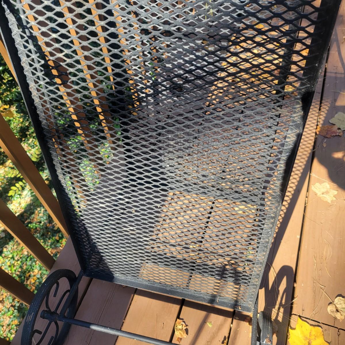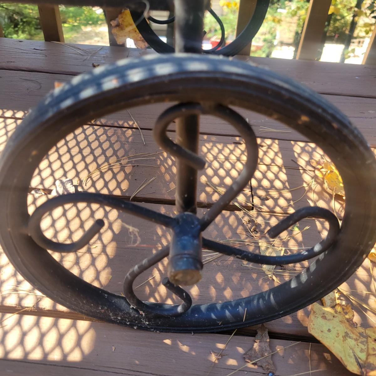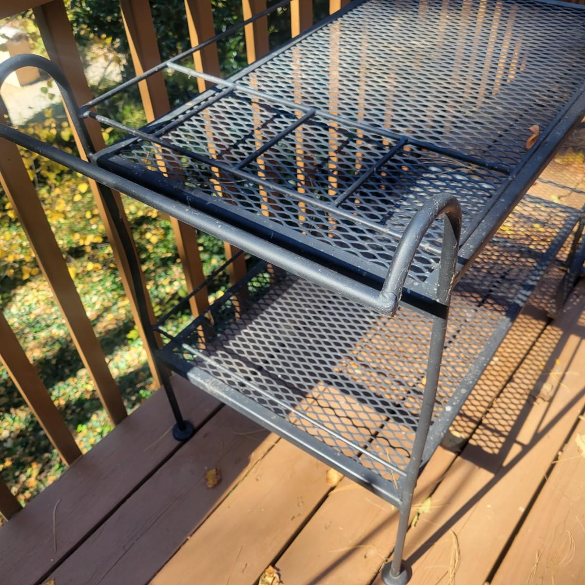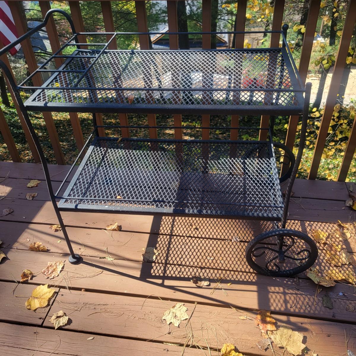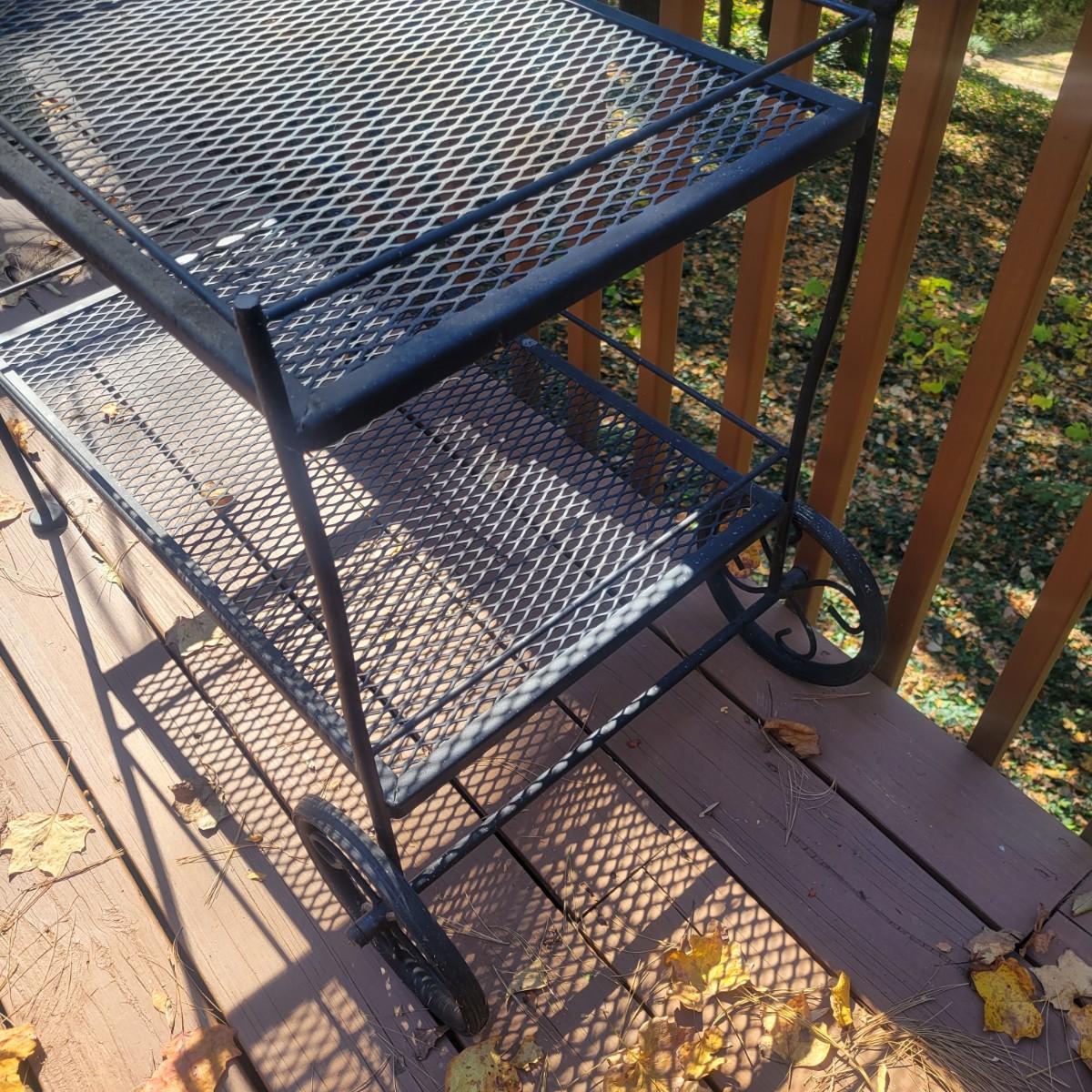 A wrought iron tea cart in good condition with no rust, but is a little dirty. This tea cart features two tiers with metal holders around each tier to keep items on the shelf when being moved. The top tier also has four square slots to keep more delicate items in place. The wheels have hard rubber tires and it measures approximately 34" x 19" x 30.5". Local pickup only