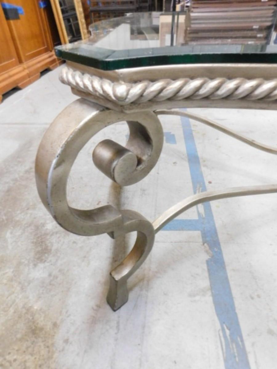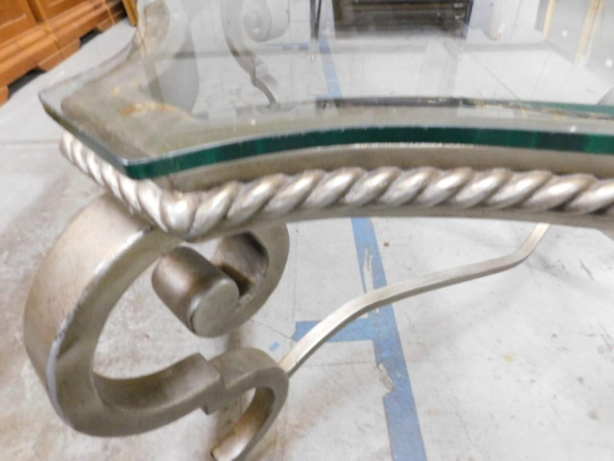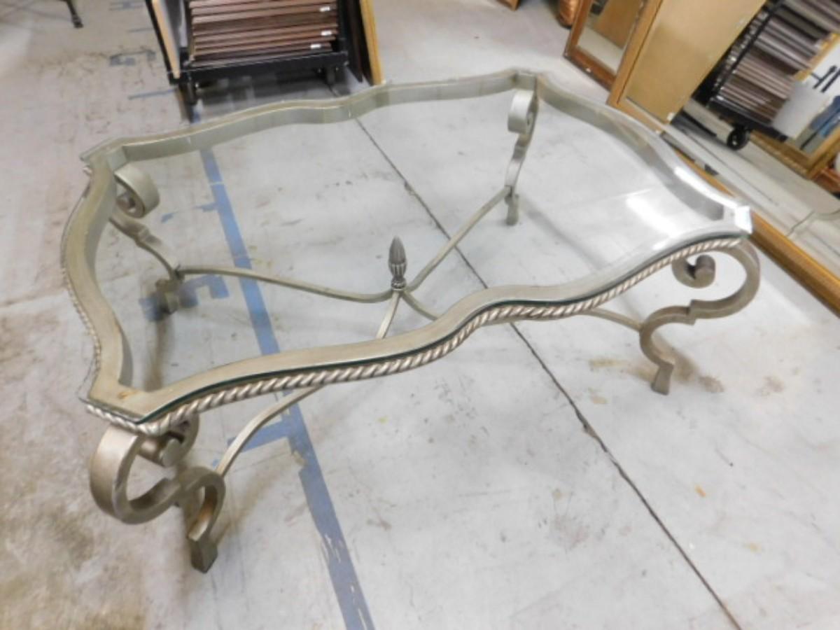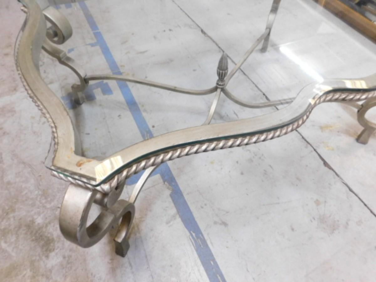 Wrought Metal French Regency Glass Top Coffee Table. Expect some wear or scratches to finish. Some paint cover might be missing or chipped. Shipping option available via freight or local mover at Buyer's expense. Buyer must have all shipping scheduled within the stated dates and times of pickup. Recommended local mover is Beaty Bros. Moving 828-201-2982