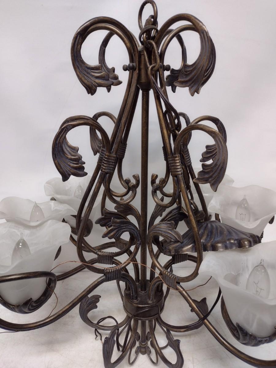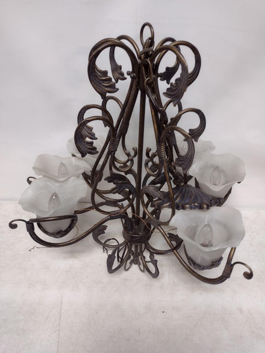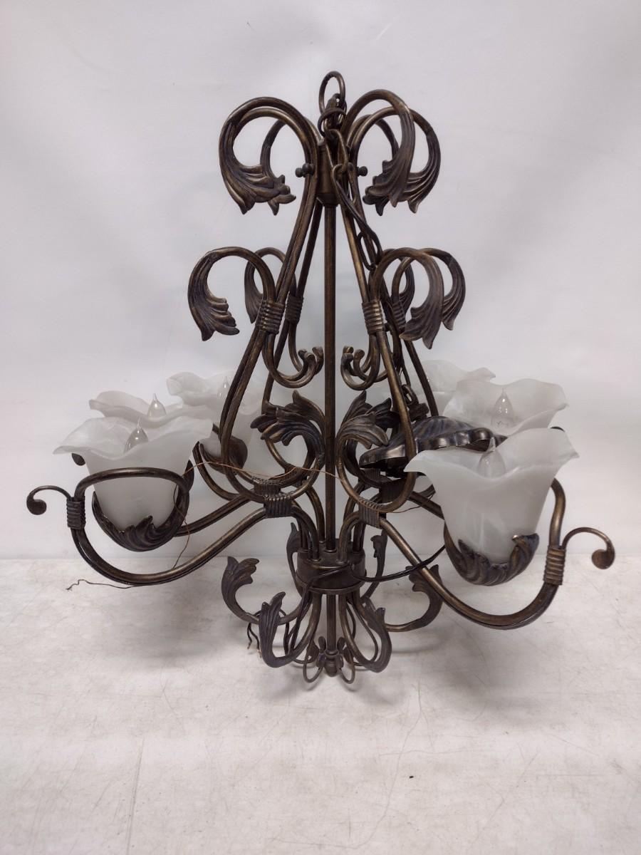 Wrought Metal Leaf and Glass Flower Shade Chandelier