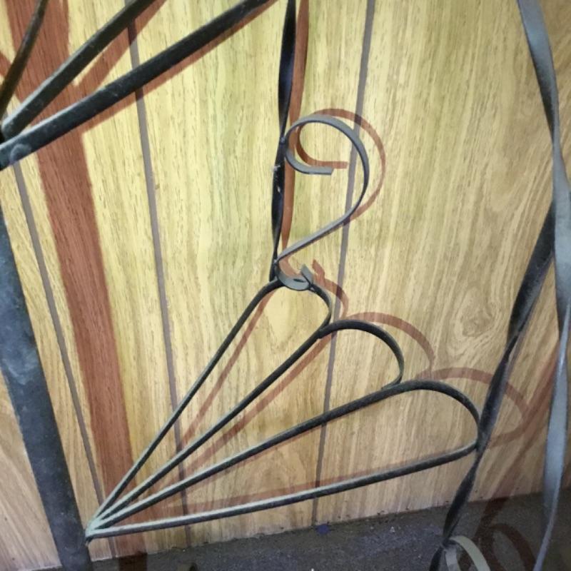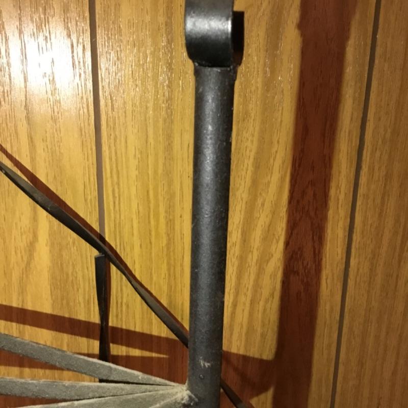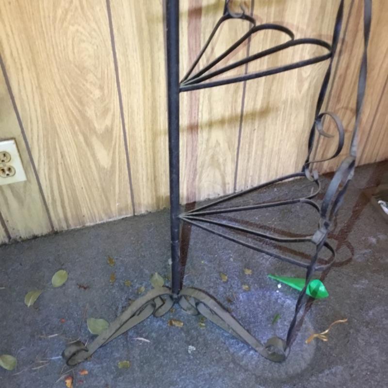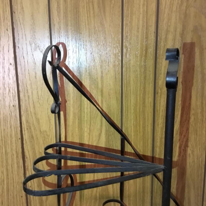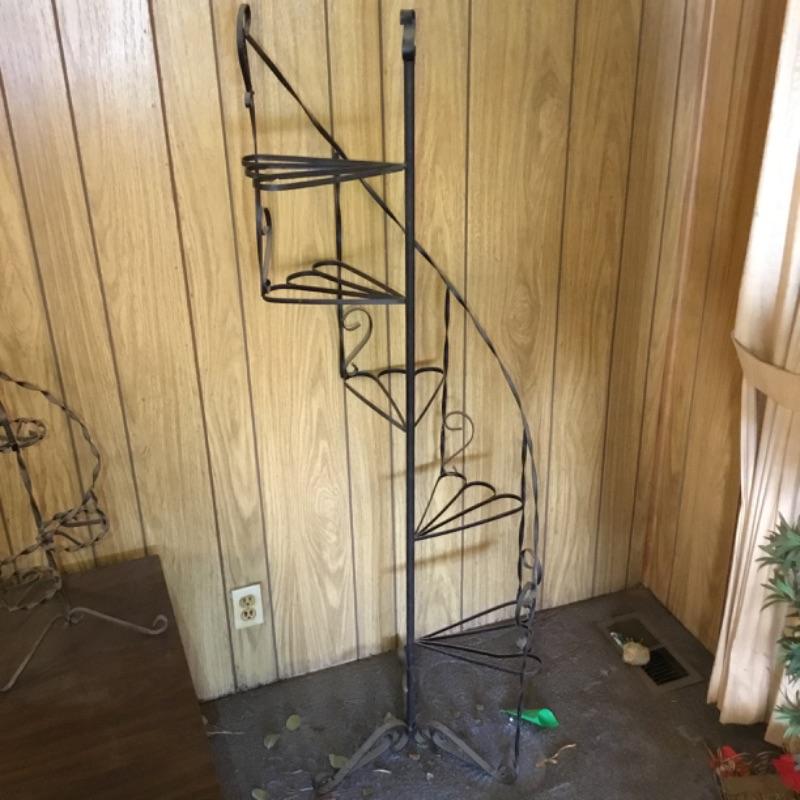 One black wrought-iron tower stand. Features five shelves in a spiraling sequence.