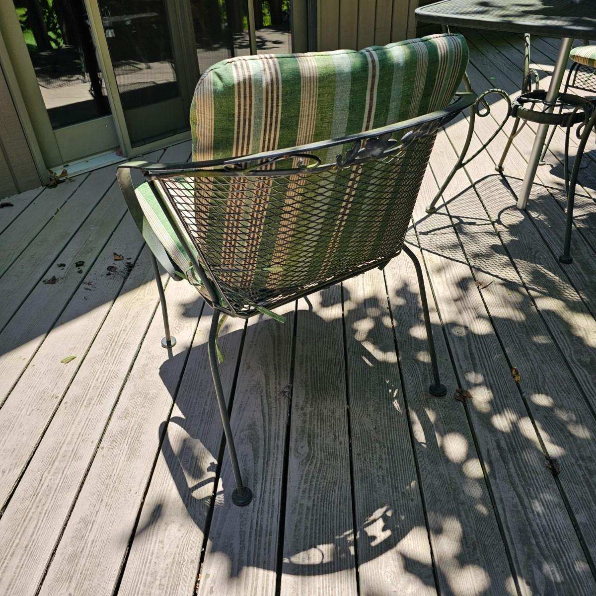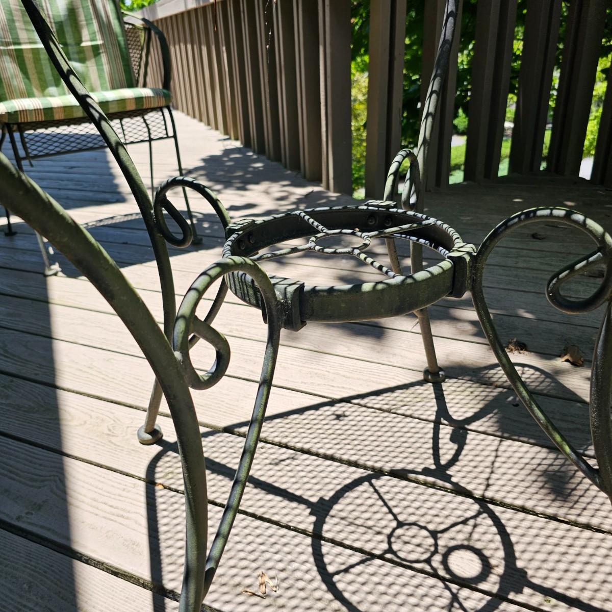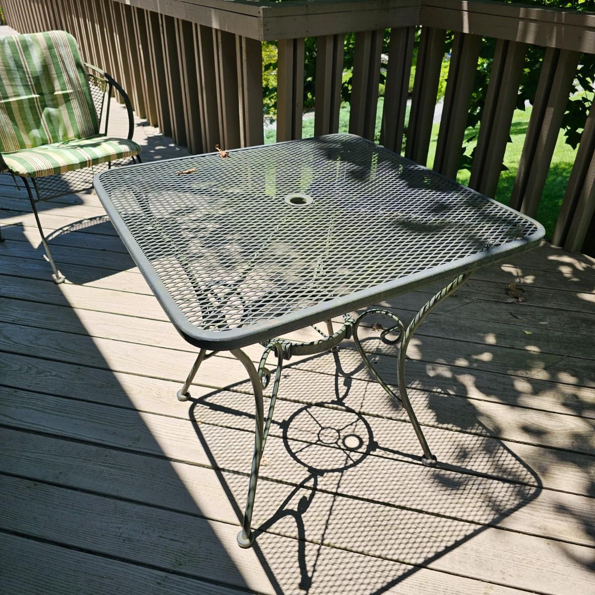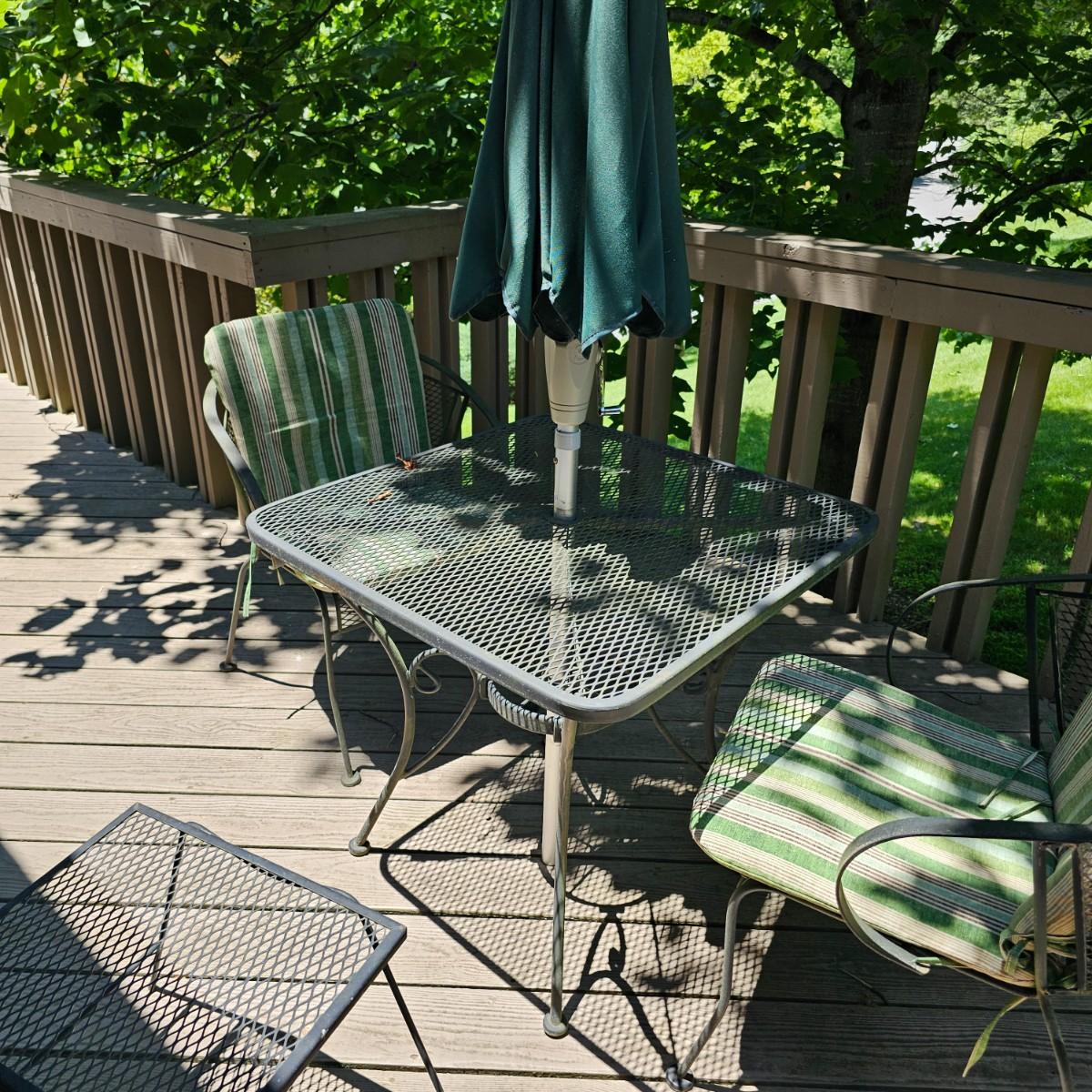 Cozy wrought iron table with two chairs. Table is 30" x 30" x 28"H. Chairs are 24" x 26" x 30"H with 18" seat height. Chairs have seat and back cushions. The small side table is 18.5" x 14.5" x 17"H. Also includes a seven foot umbrella with center post, has tilt capability. No bottom weight. See photos for details. Local pickup only.
