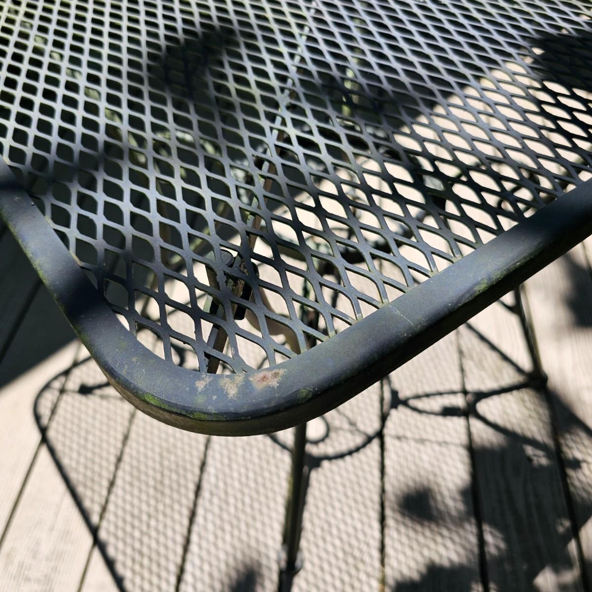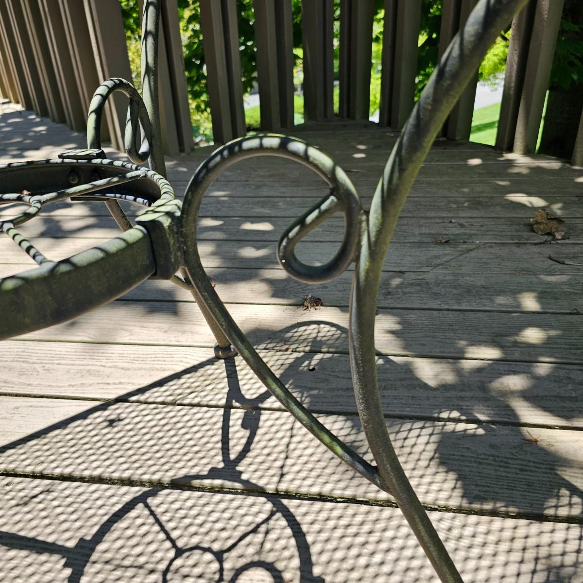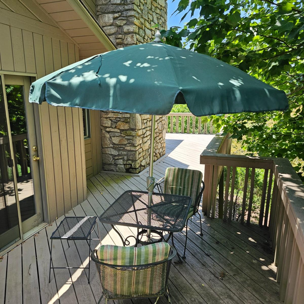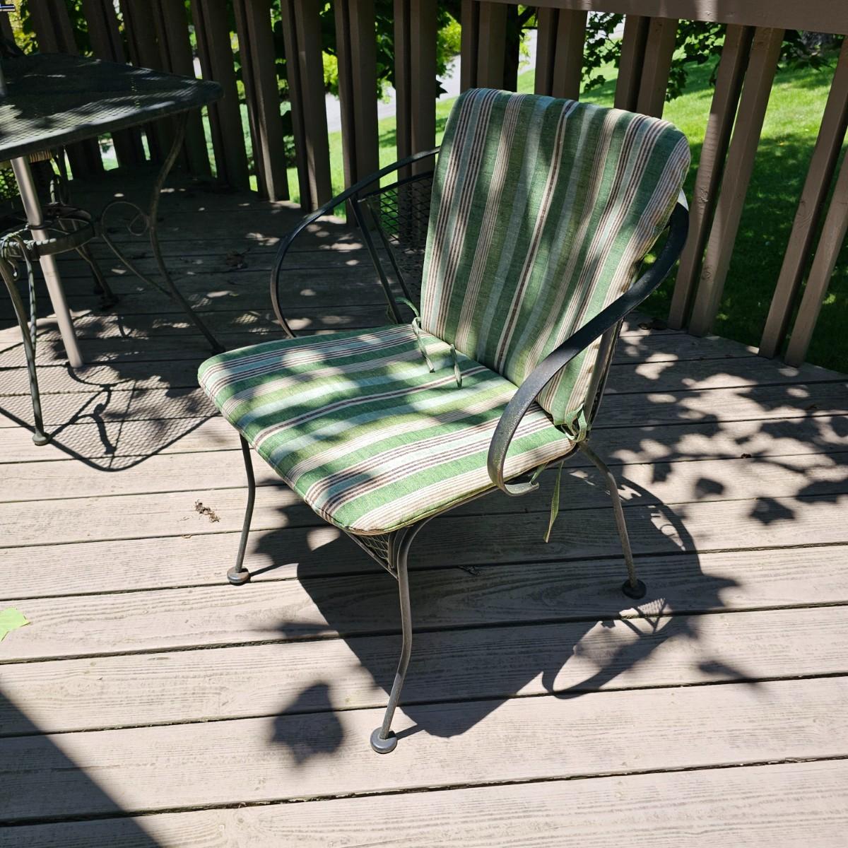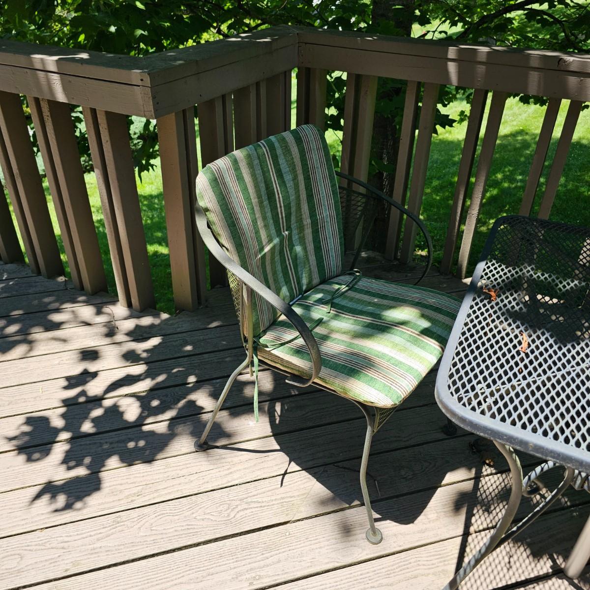 Cozy wrought iron table with two chairs. Table is 30" x 30" x 28"H. Chairs are 24" x 26" x 30"H with 18" seat height. Chairs have seat and back cushions. The small side table is 18.5" x 14.5" x 17"H. Also includes a seven foot umbrella with center post, has tilt capability. No bottom weight. See photos for details. Local pickup only.