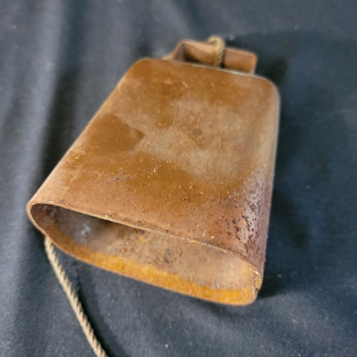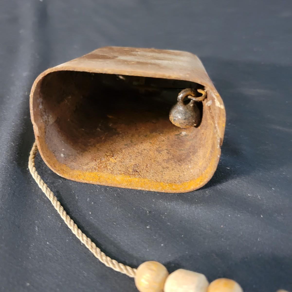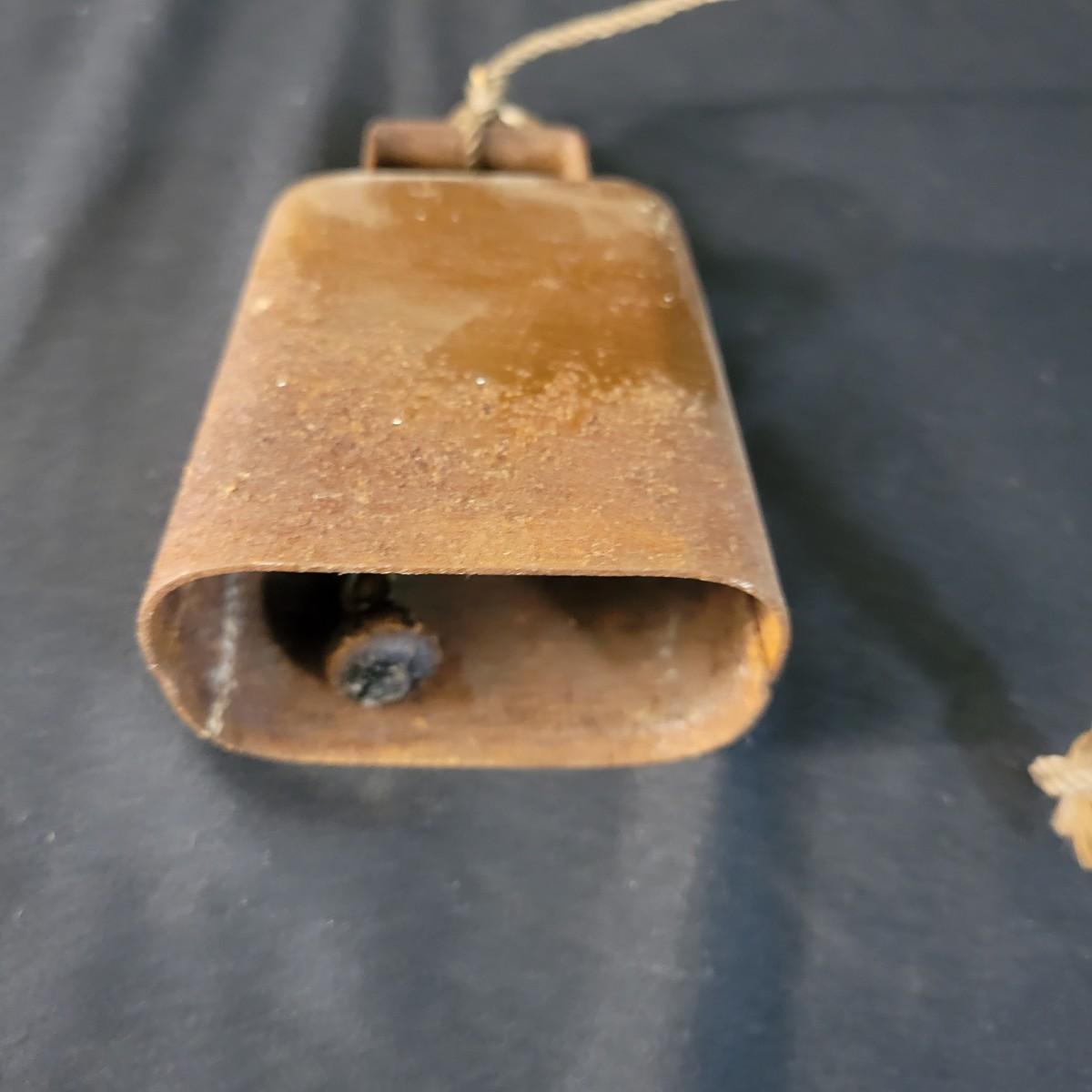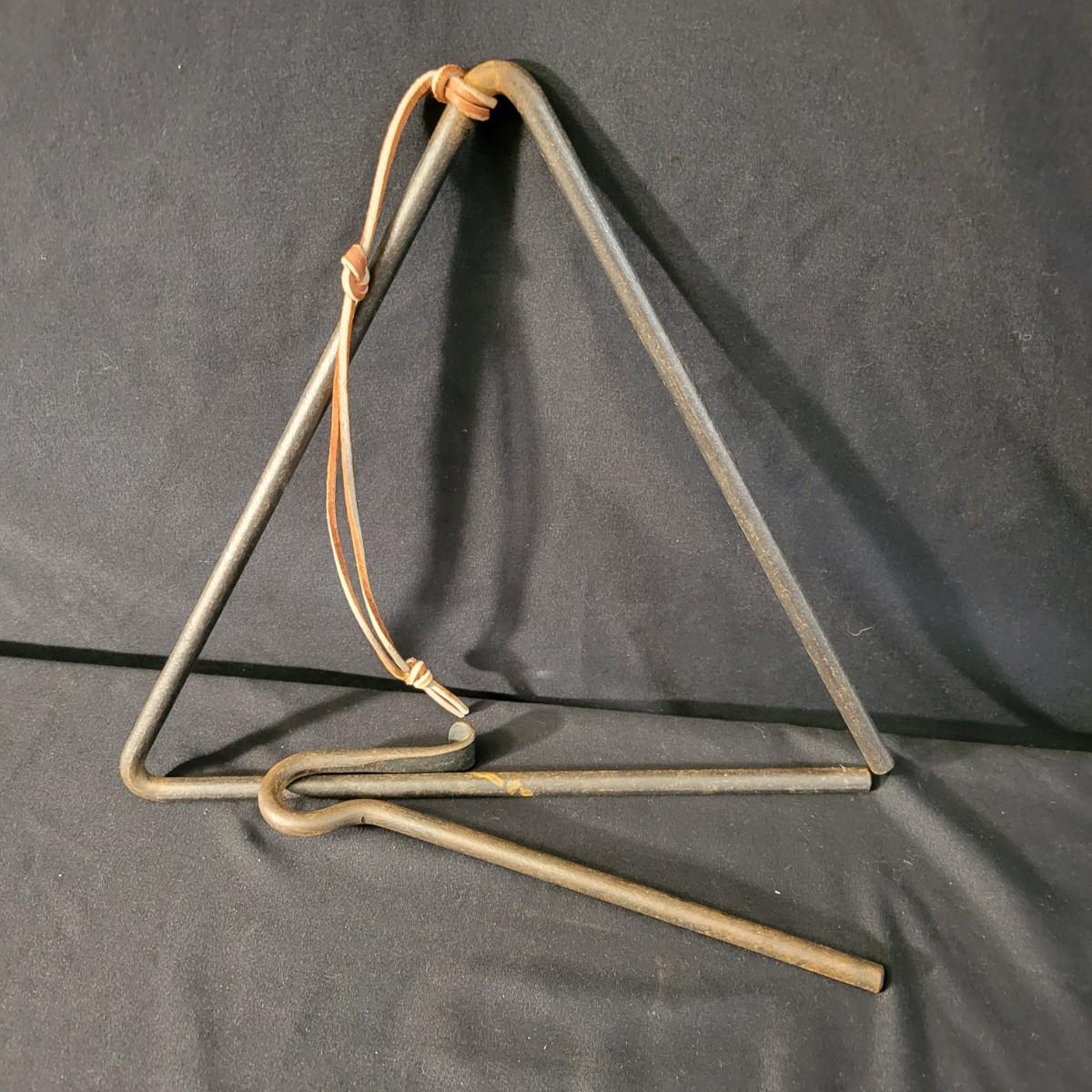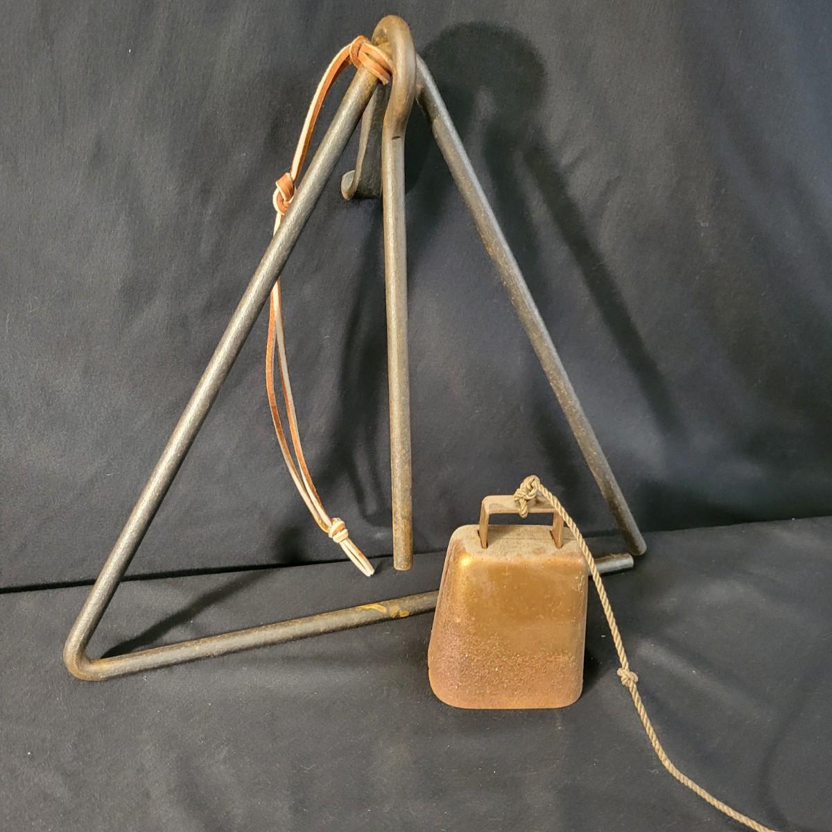 Included is a brass colored cow bell and a wrought-iron triangle. Both are in good condition, but do show a little patina and age. Triangle measures approximately 11" tall. Shipping available
